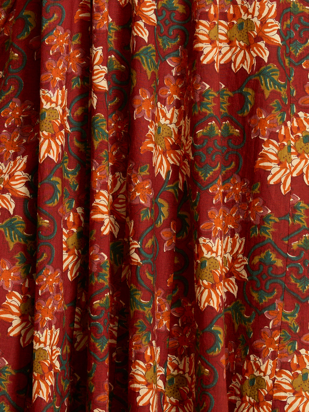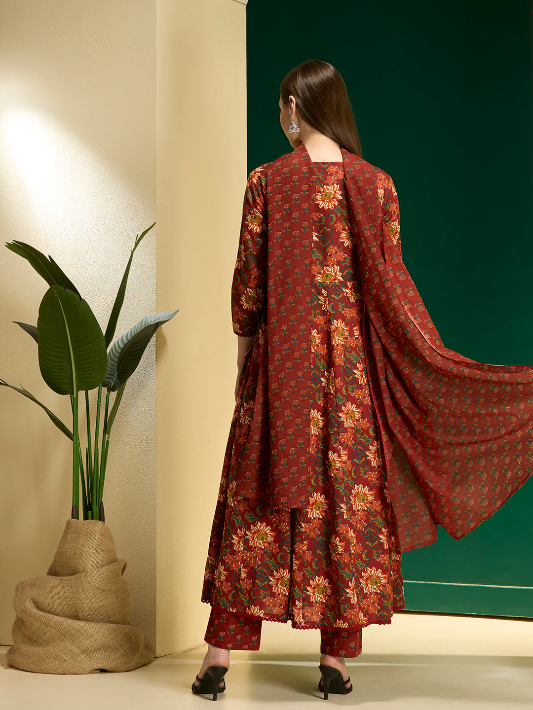 Ethnic Floral Printed Anarkali Flared Kurta with Pant and Dupatta - Red