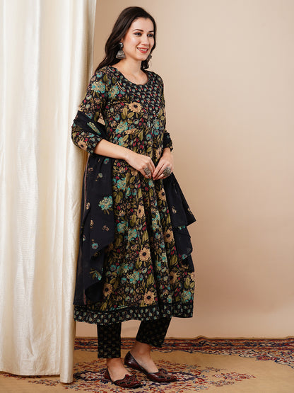 Ethnic Floral Printed Anarkali Flared Kurta with Pant & Dupatta - Black
