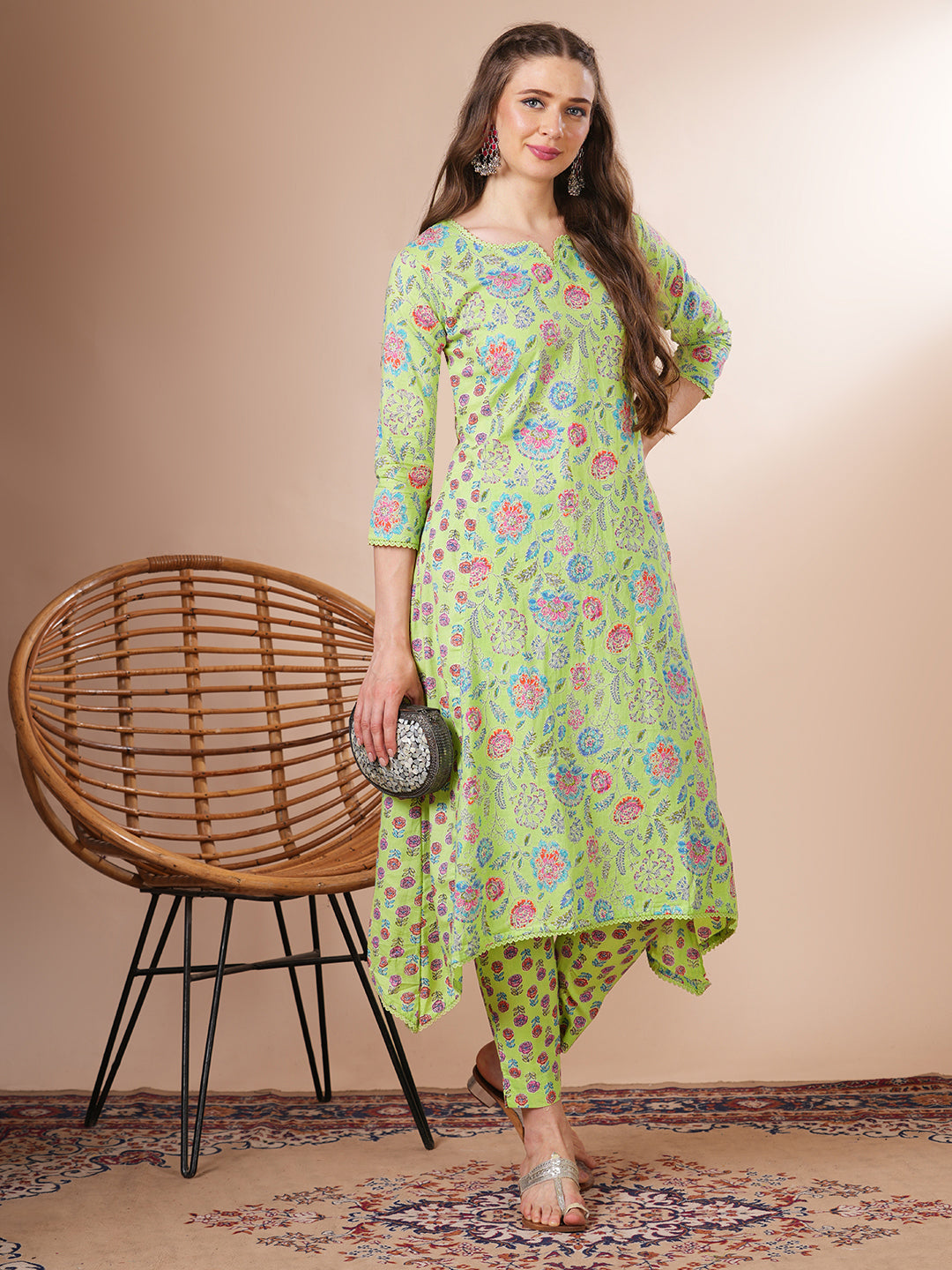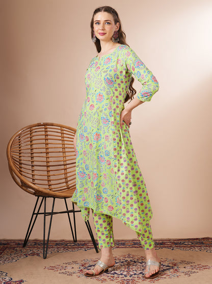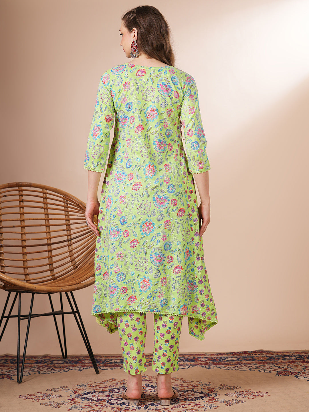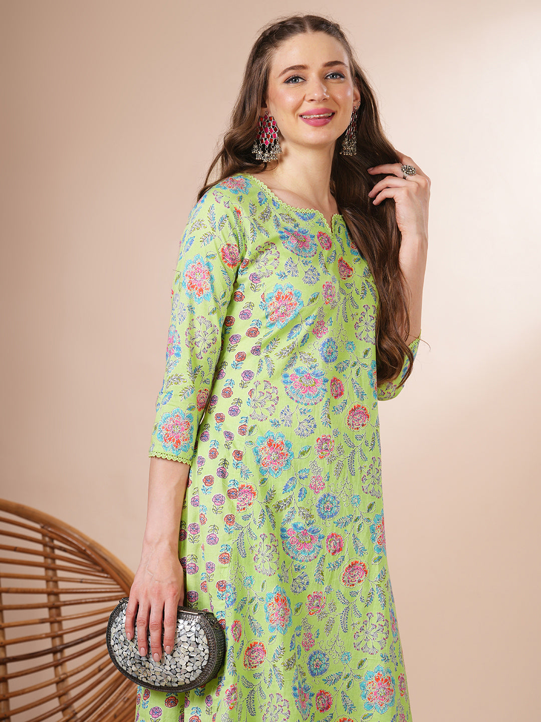 Ethnic Floral Printed Anarkali Flared Kurta with Pant - Light Green