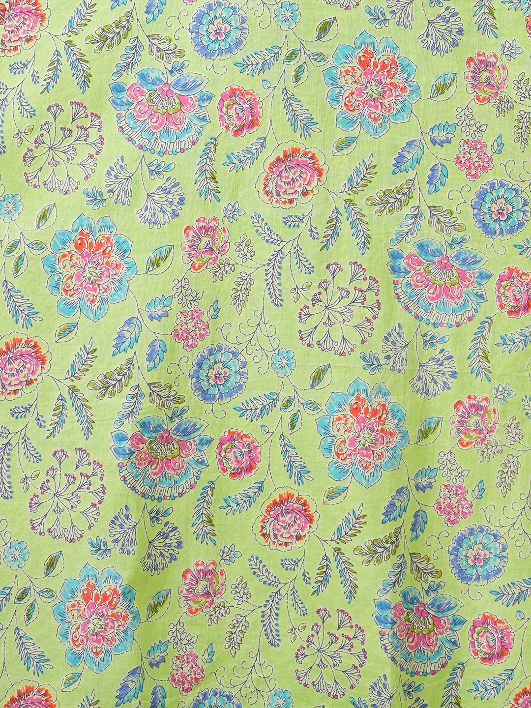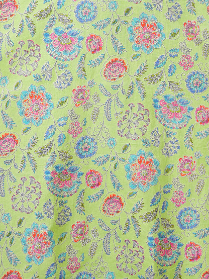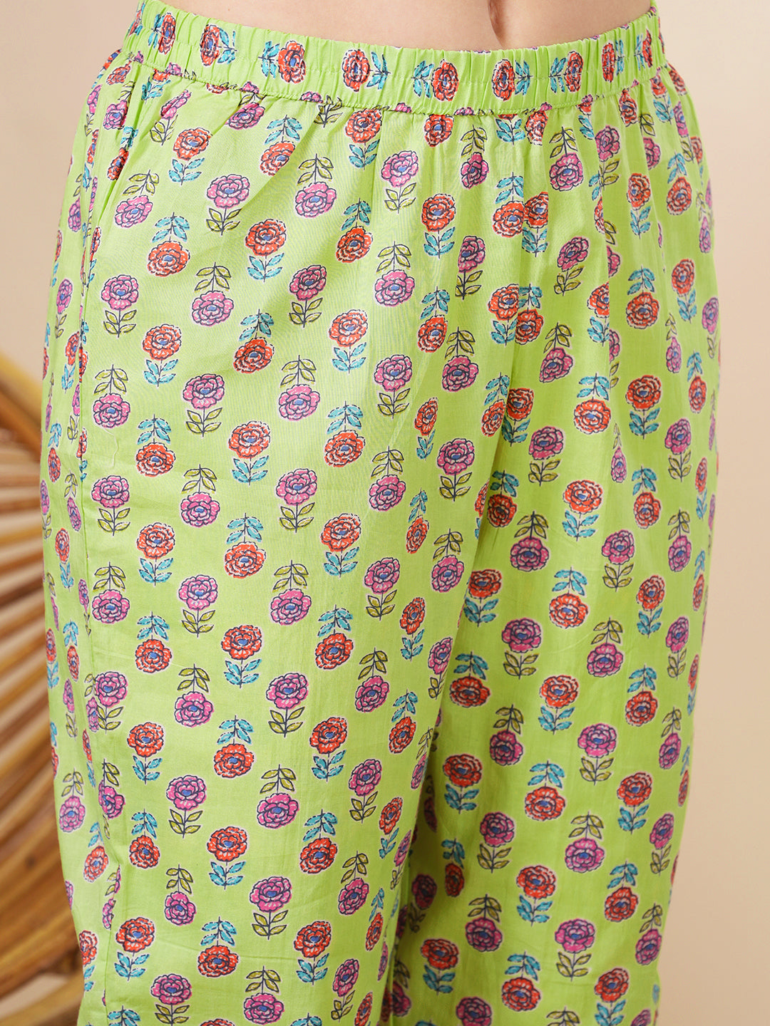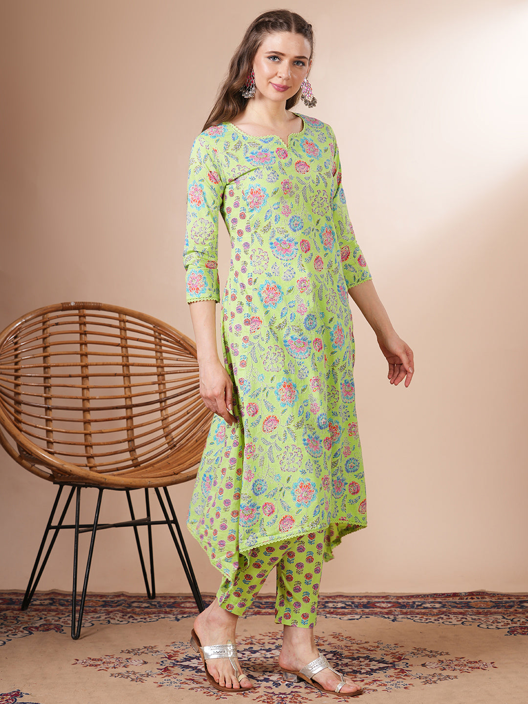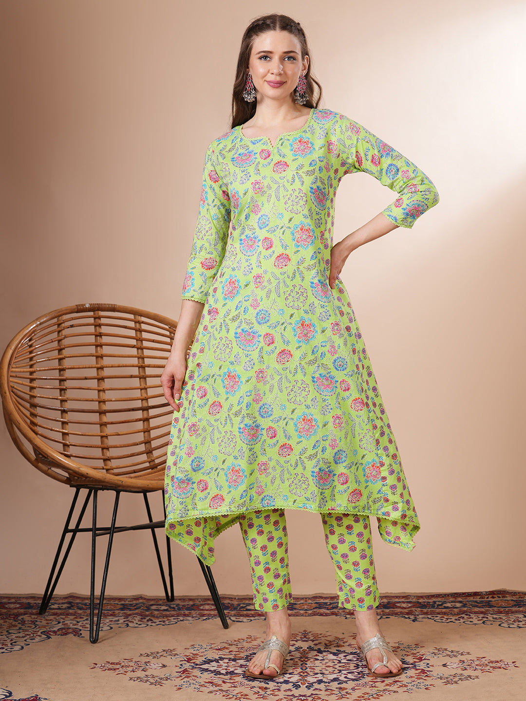 Ethnic Floral Printed Anarkali Flared Kurta with Pant - Light Green
