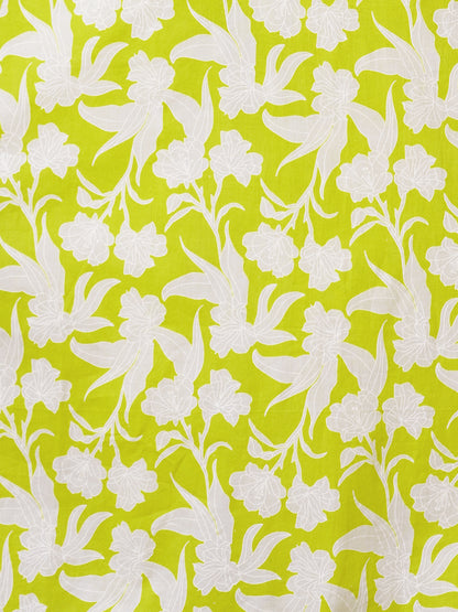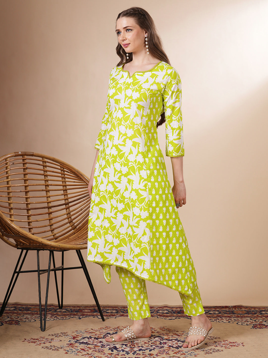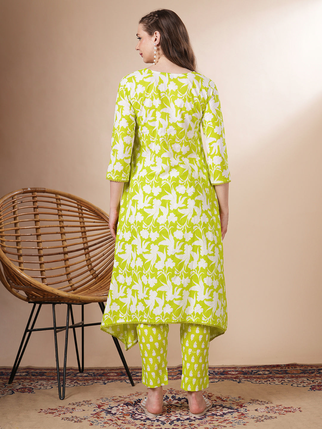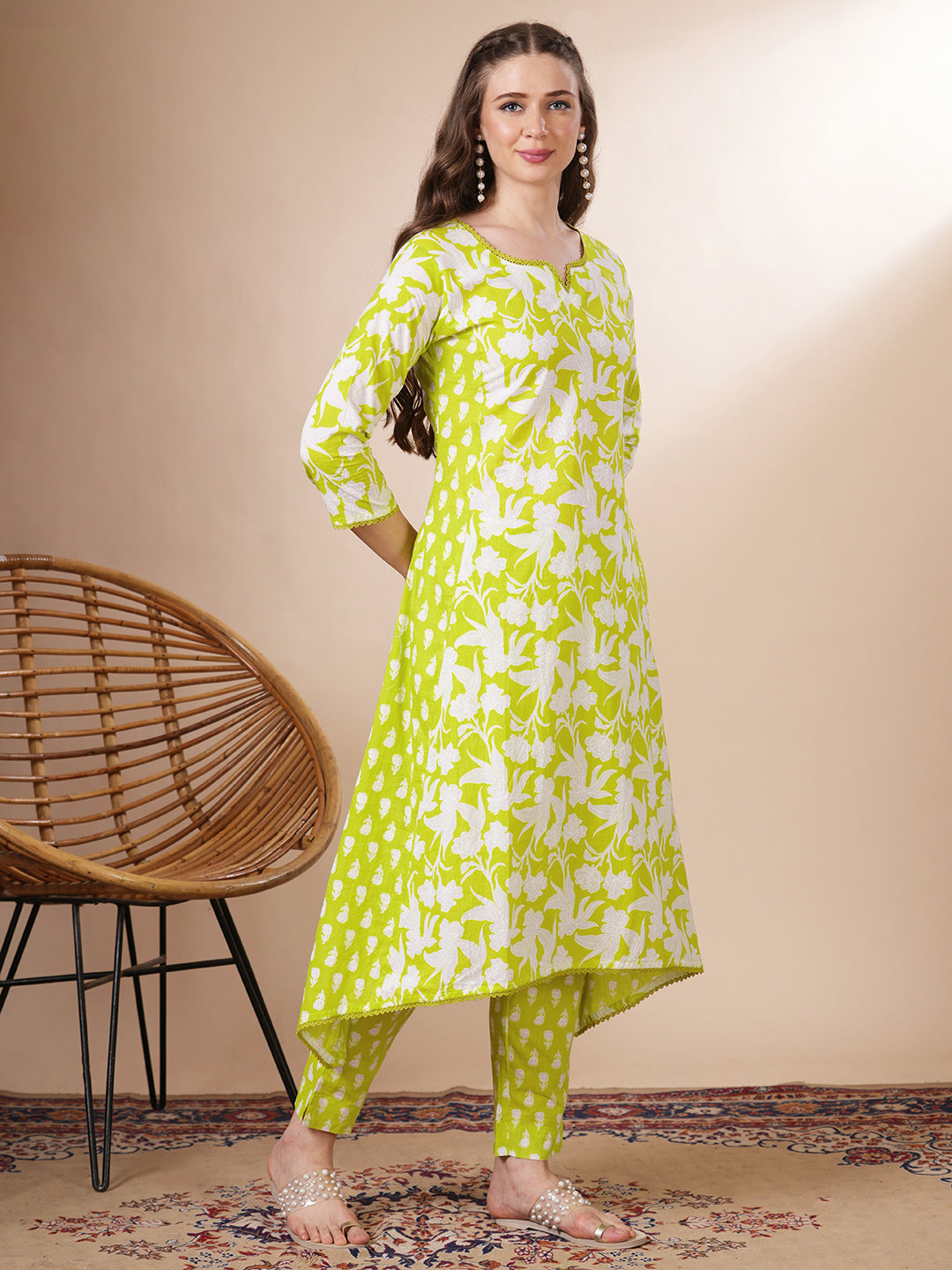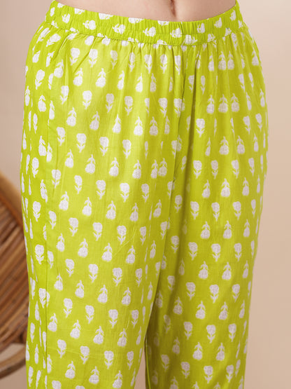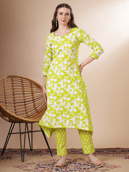 Ethnic Floral Printed Anarkali Flared Kurta with Pant - Lime Green
