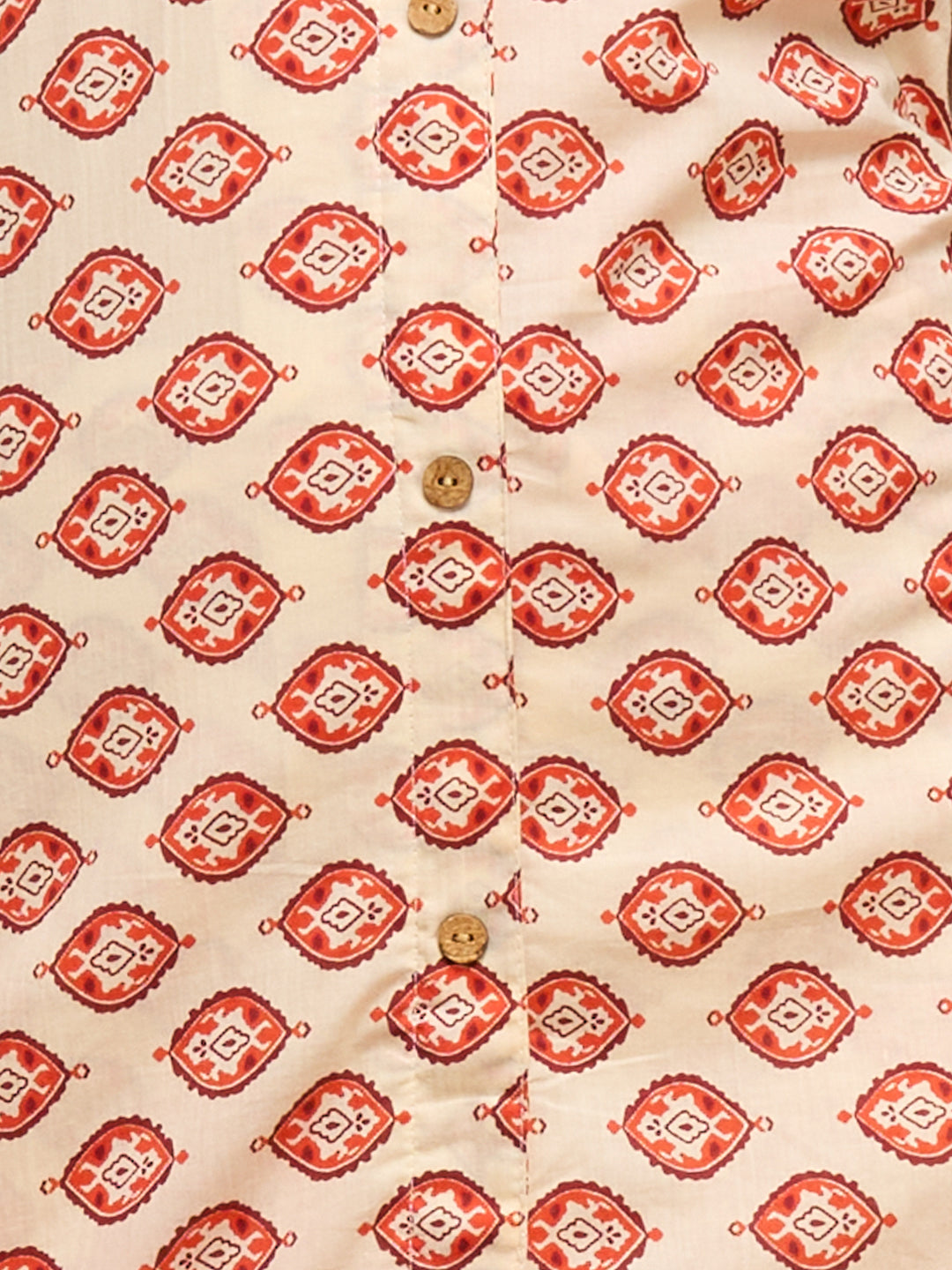 Add a playful twist to tradition with this Cream Colored Ethnic Floral Printed A-Line Co-ord Set. Made from soft, breathable cotton, it features vibrant floral motifs and a smart lapel collar for a touch of contemporary charm. Paired with a matching pant, this easygoing set is perfect for casual outings with a stylish ethnic vibe.