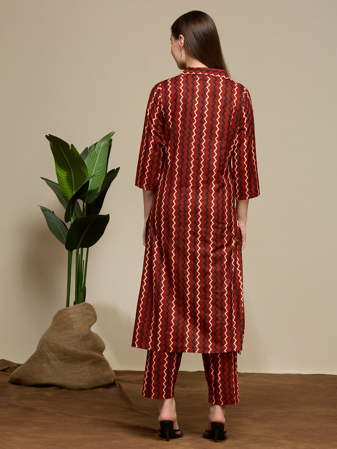 Add a playful twist to tradition with this Maroon Colored Ethnic Floral Printed A-Line Co-ord Set. Made from soft, breathable cotton, it features vibrant floral motifs and a smart lapel collar for a touch of contemporary charm. Paired with a matching pant, this easygoing set is perfect for casual outings with a stylish ethnic vibe.