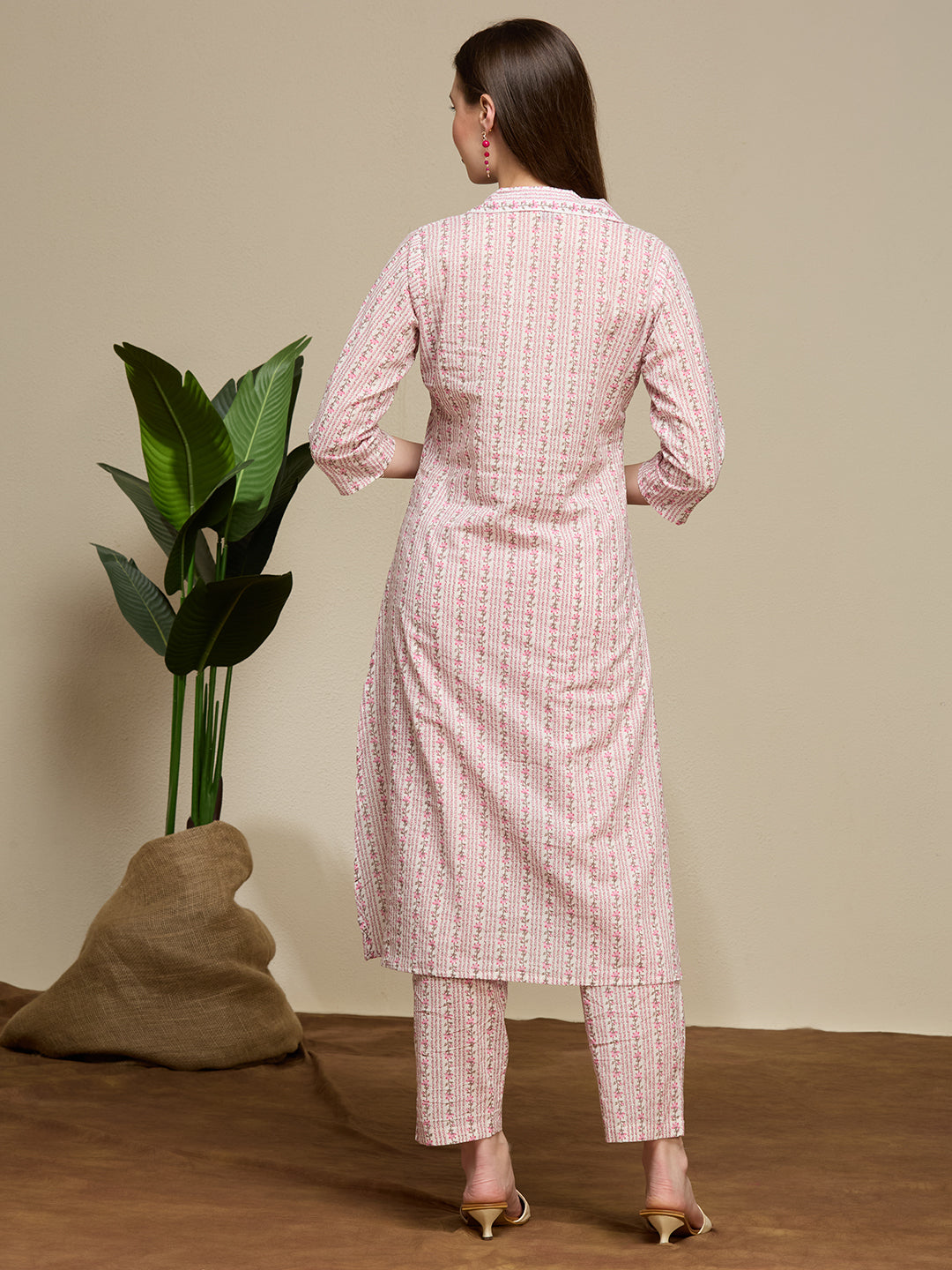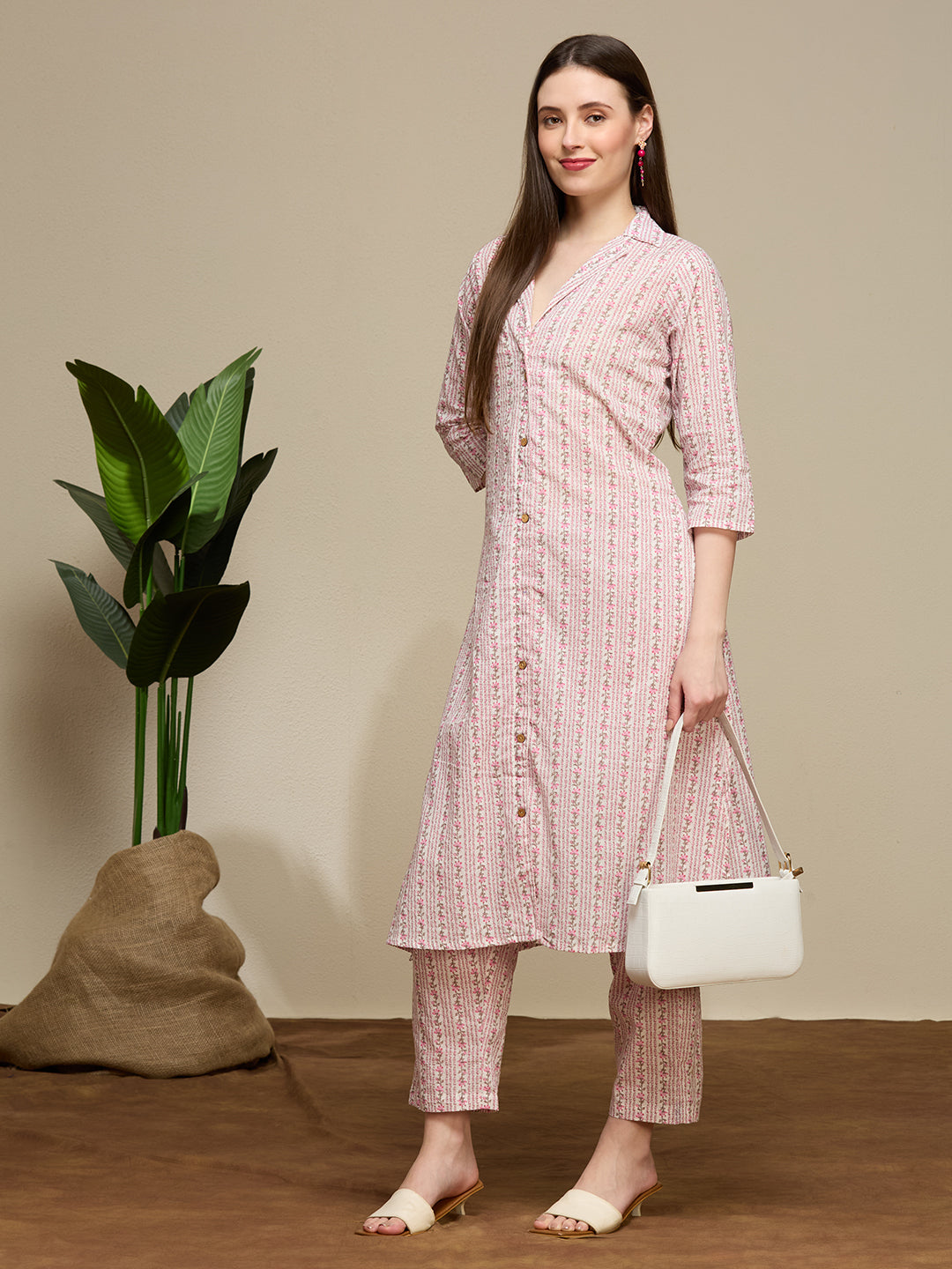 Add a playful twist to tradition with this Multi-Colored Ethnic Floral Printed A-Line Co-ord Set. Made from soft, breathable cotton, it features vibrant floral motifs and a smart lapel collar for a touch of contemporary charm. Paired with a matching pant, this easygoing set is perfect for casual outings with a stylish ethnic vibe.