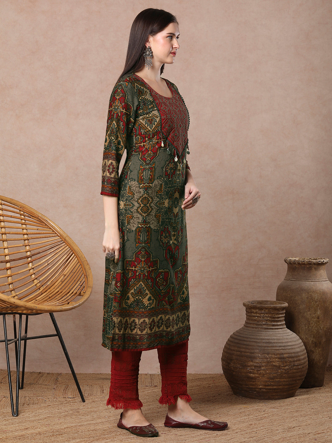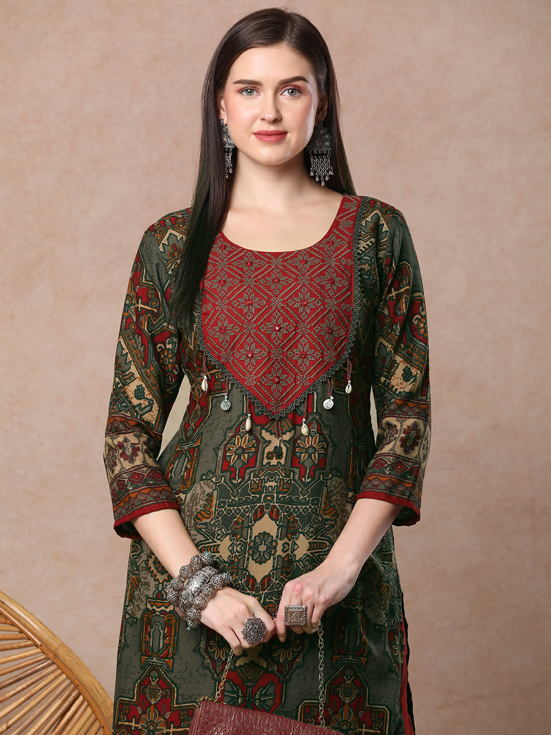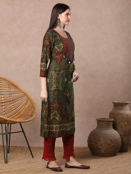 Ethnic Floral Printed & Cross Stitch Embroidered Straight Fit Kurta - Grey