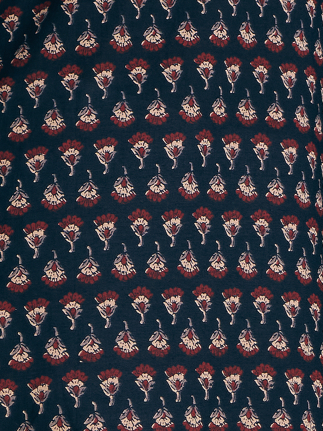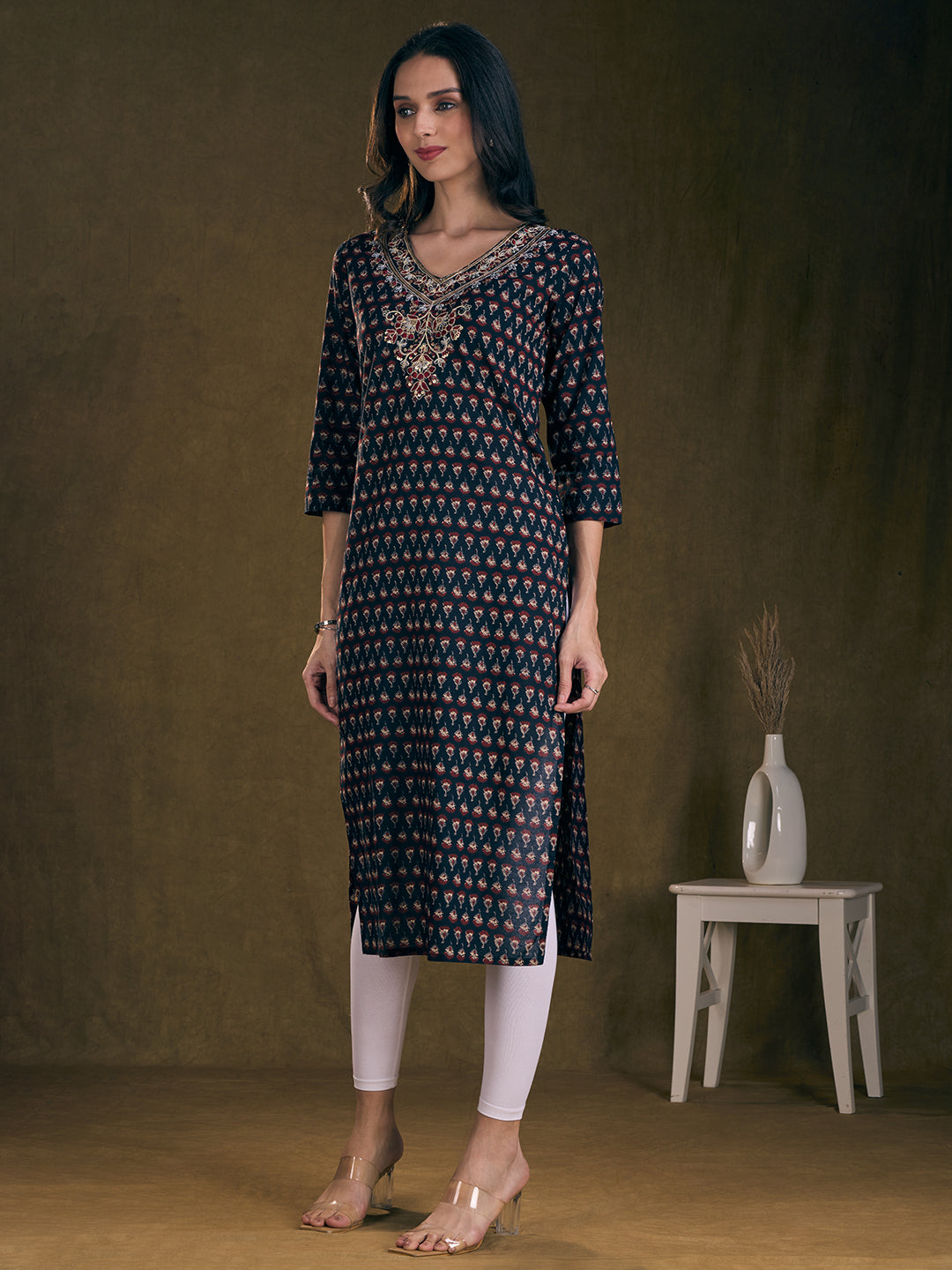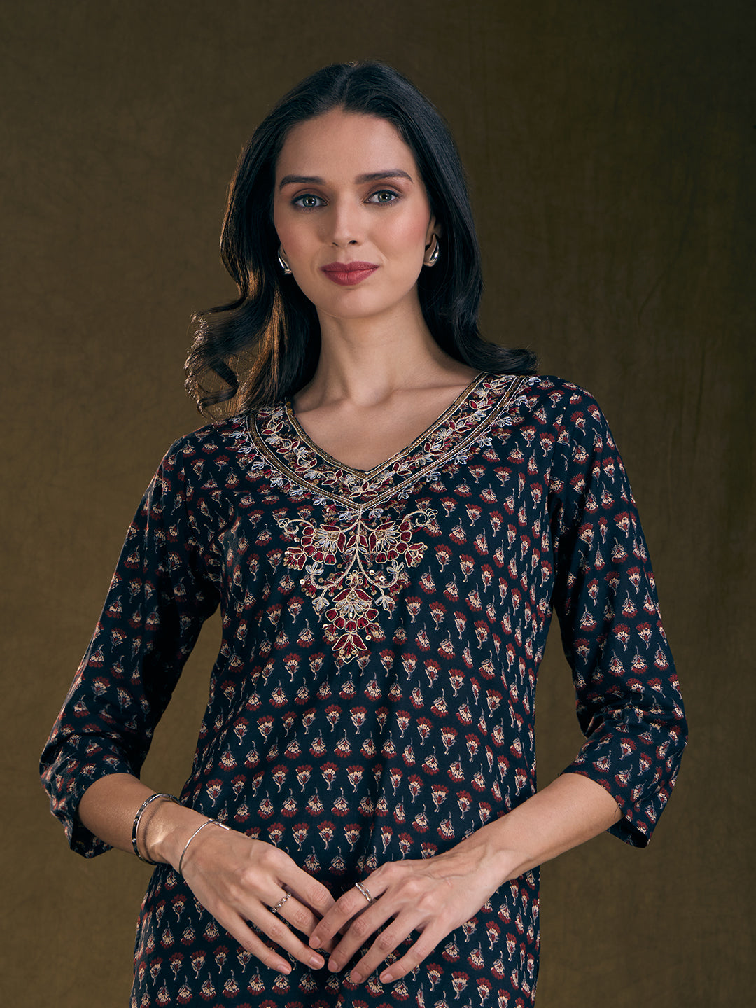 Embrace timeless elegance with this Ethnic Floral Printed & Embroidered A-Line Kurta in a classic black hue. Crafted from breathable cotton, it offers all-day comfort with a refined silhouette. The V-neckline is beautifully adorned with intricate Resham and sequin embroidery, adding a subtle shimmer and artisanal charm. Ethnic floral prints enhance the traditional appeal, making it a versatile pick for both festive and casual settings. Effortlessly graceful, this kurta is where comfort meets cultural sophistication.