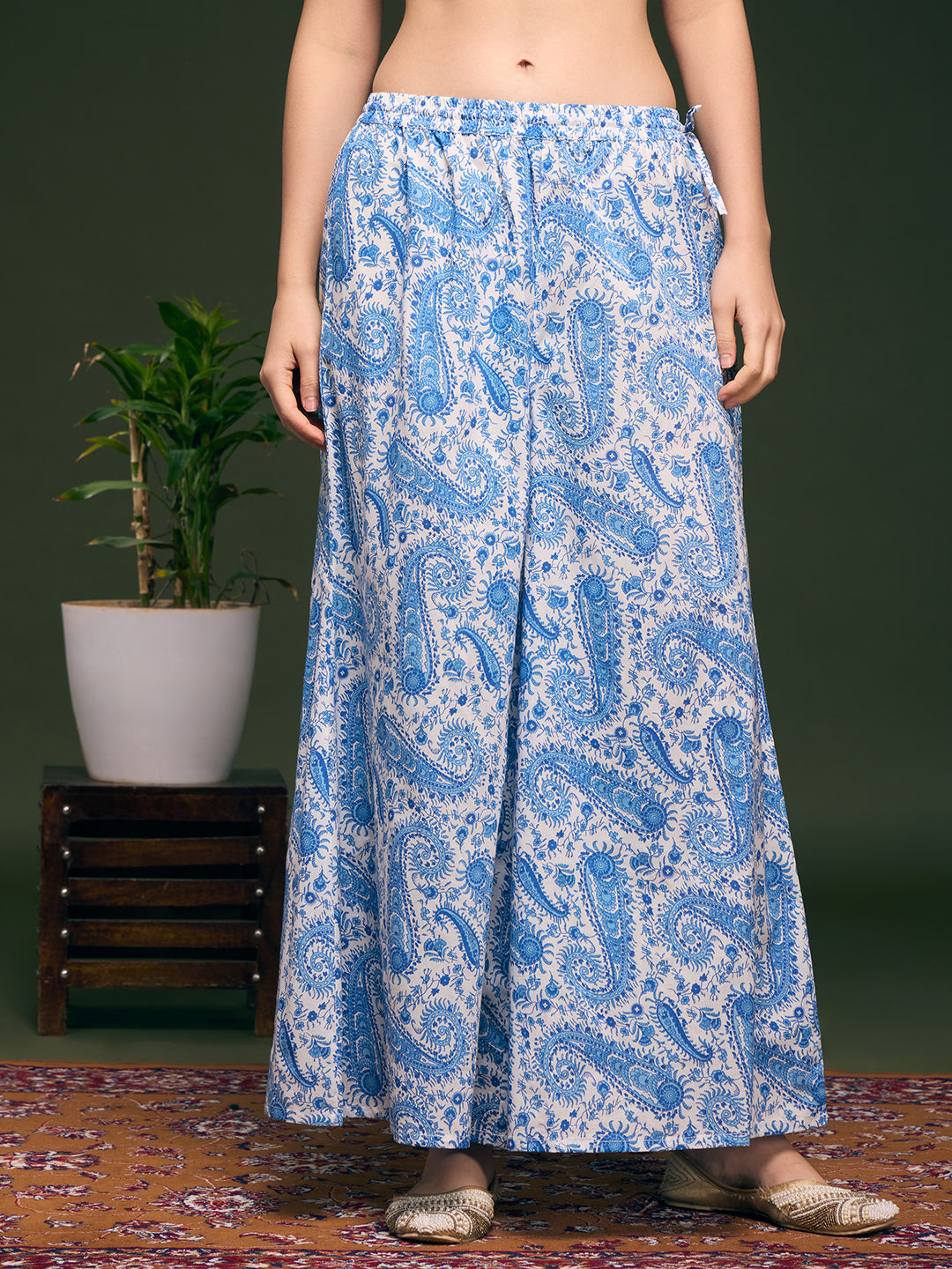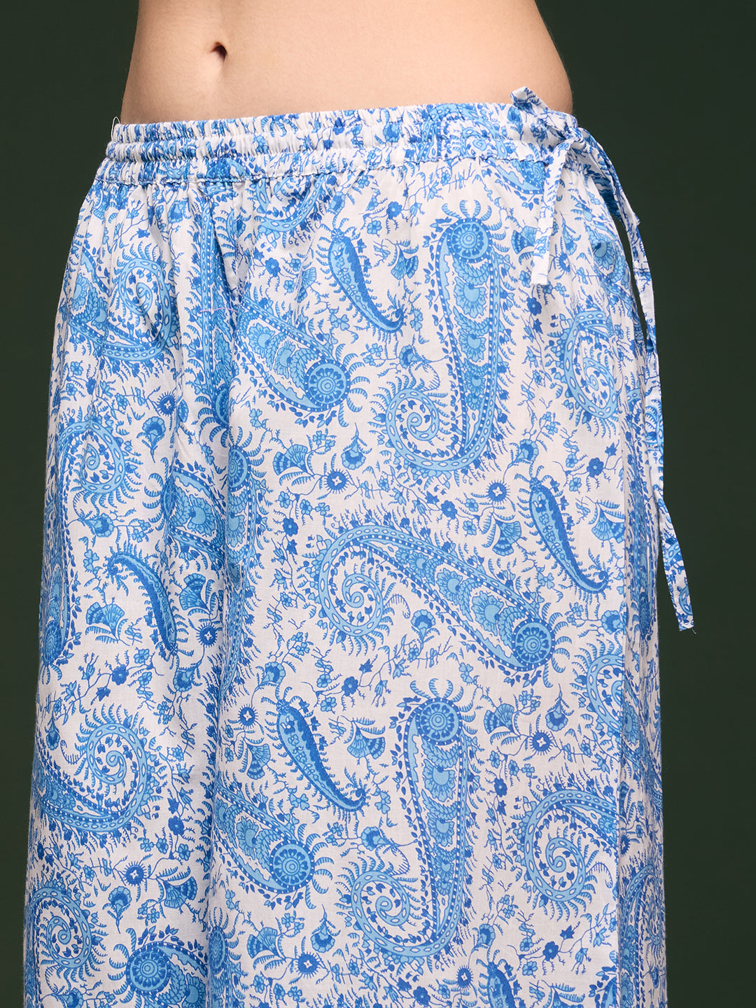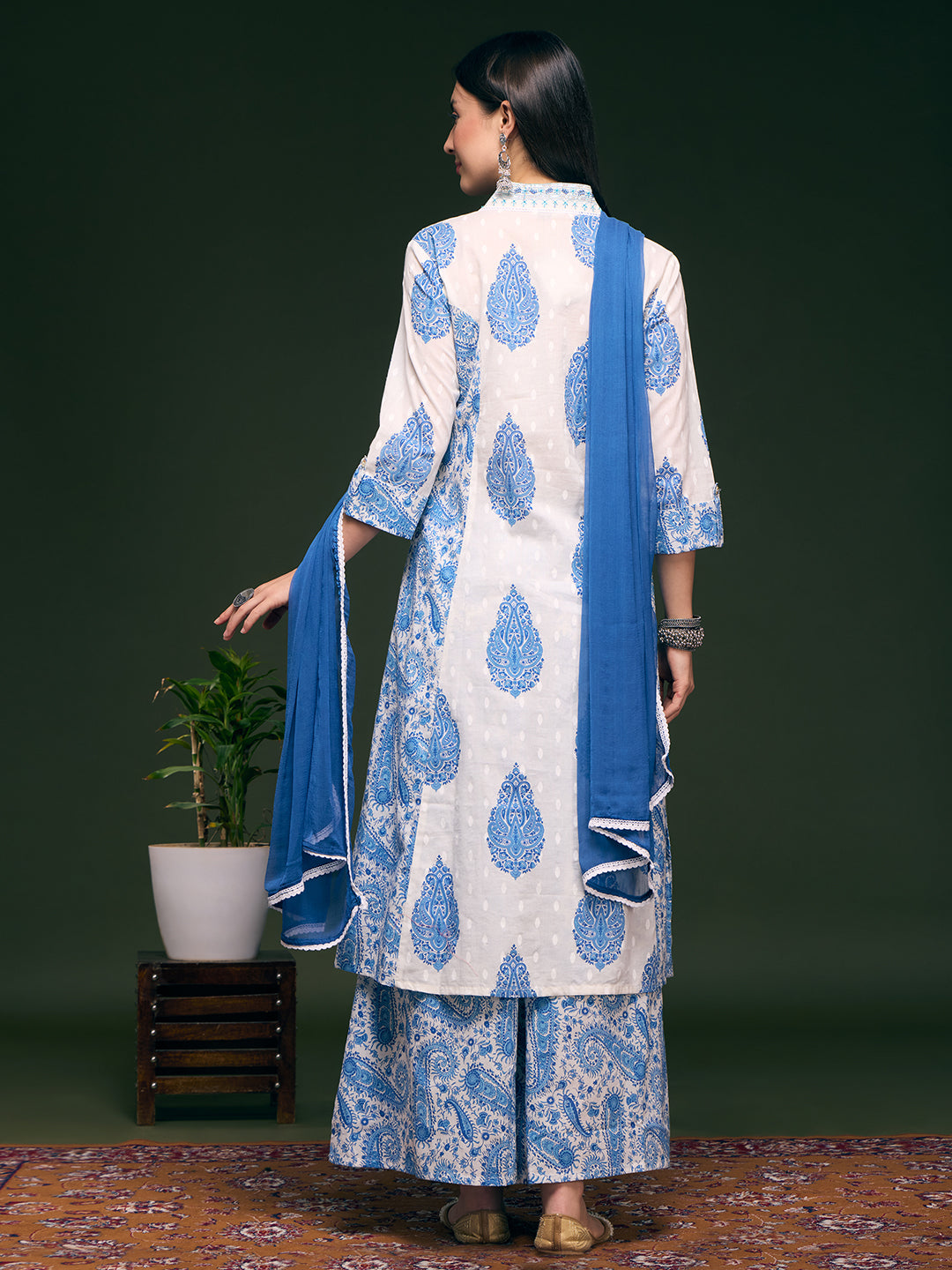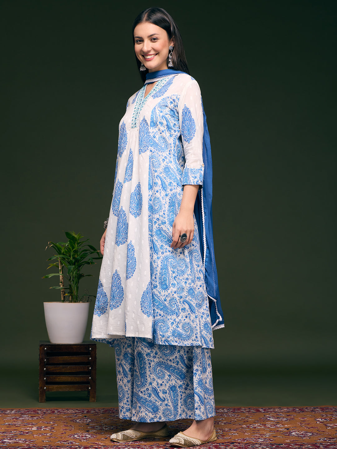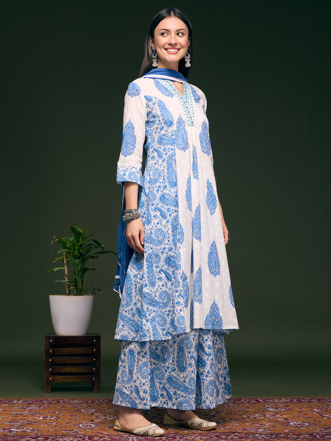 Celebrate timeless elegance in this exquisite ethnic ensemble. Crafted from airy cotton, the A-line paneled kurta features a graceful V-neckline embellished with hand-sewn beads and delicate sequins, catching the light with every movement. Intricate floral prints intertwine with subtle embroidery to create a tapestry of artistry. Paired with matching printed palazzo pants, tailored in soft chiffon for a romantic, flowing silhouette, and complemented by a crisp, solid chiffon dupatta—all designed to elevate your presence with understated luxury.