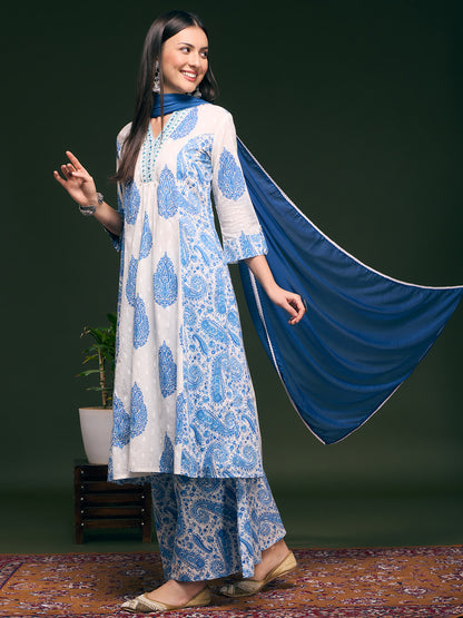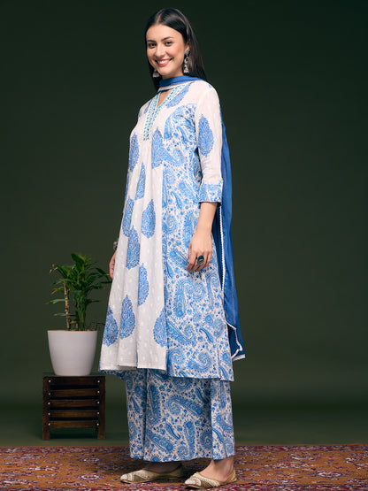 Ethnic Floral Printed & Embroidered A-Line Paneled Kurta with Palazzo & Dupatta - White