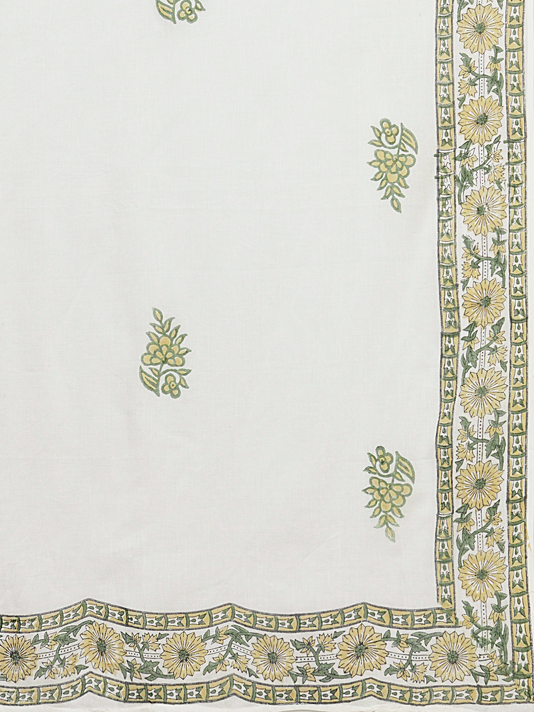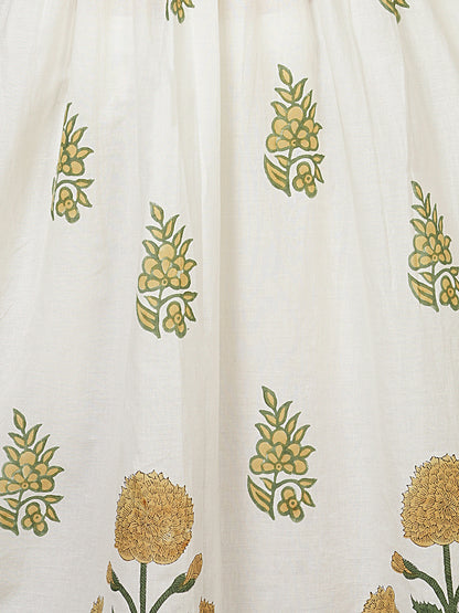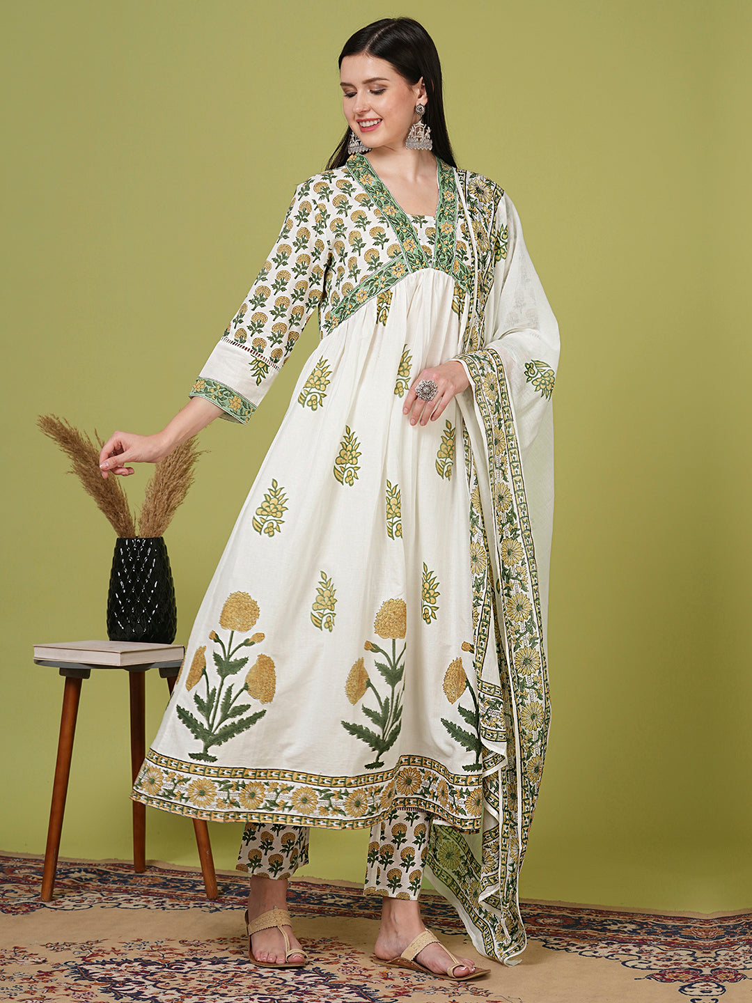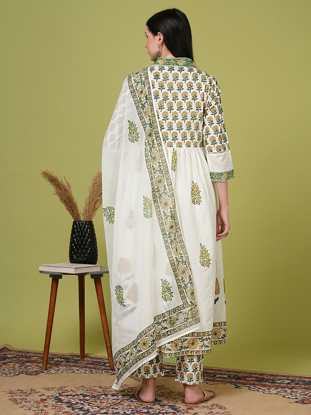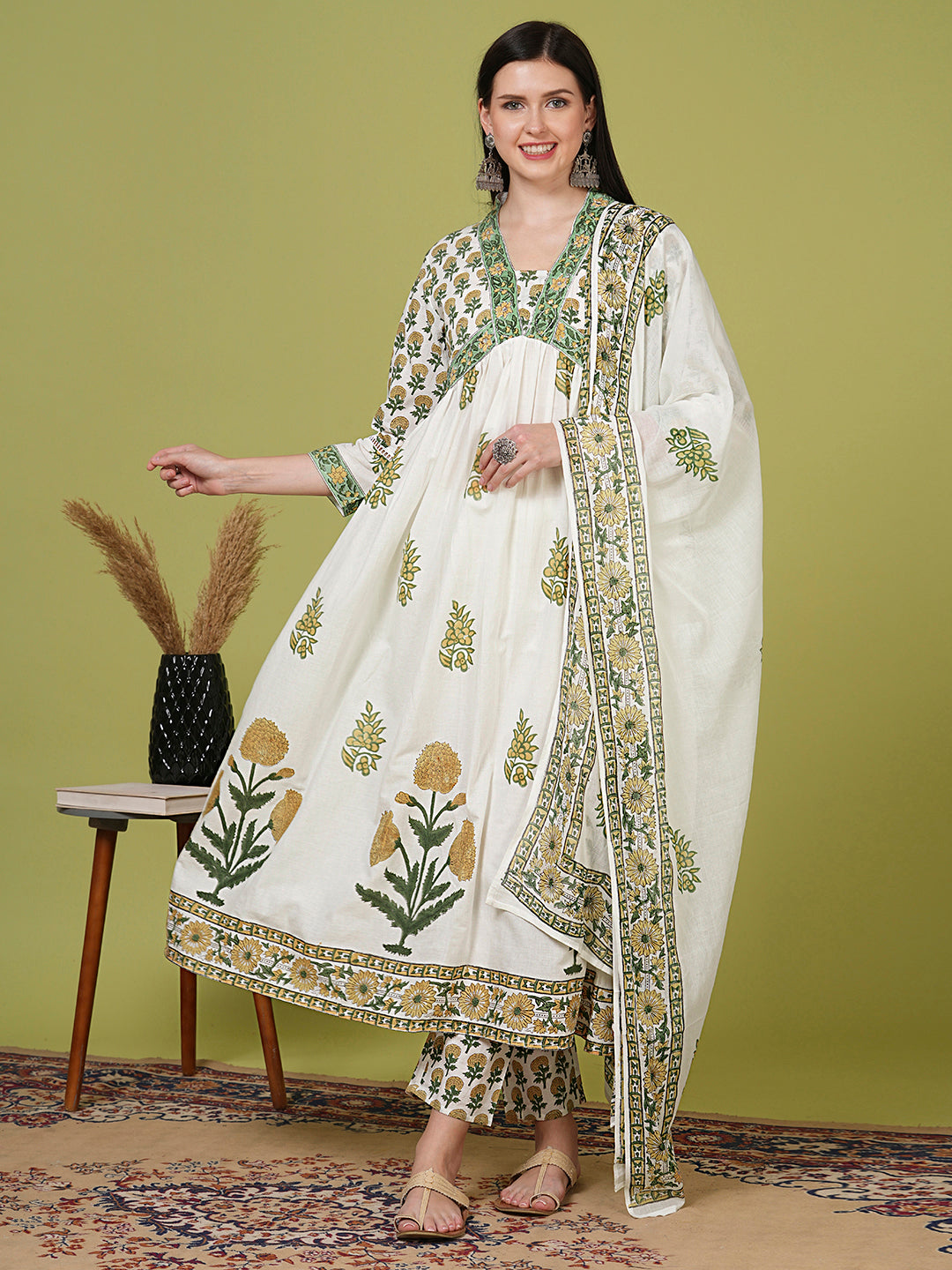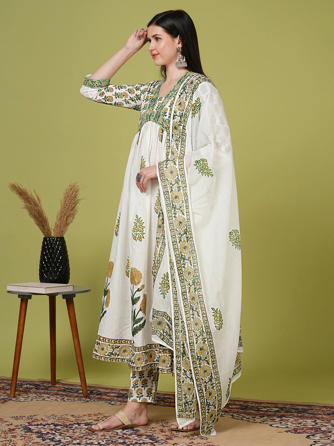 Ethnic Floral Printed Embroidered A-Line Pleated Kurta with Pant and Dupatta - White