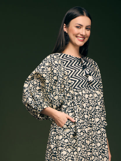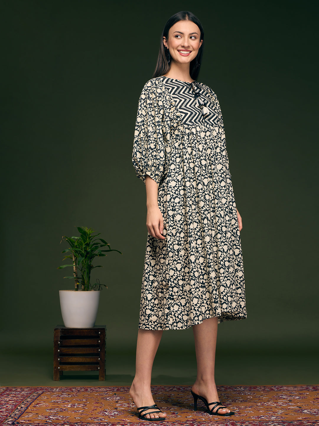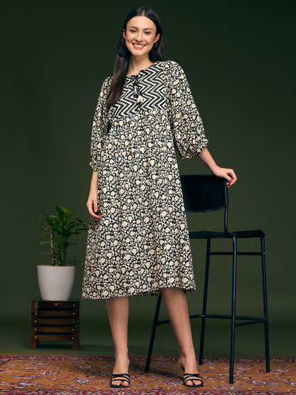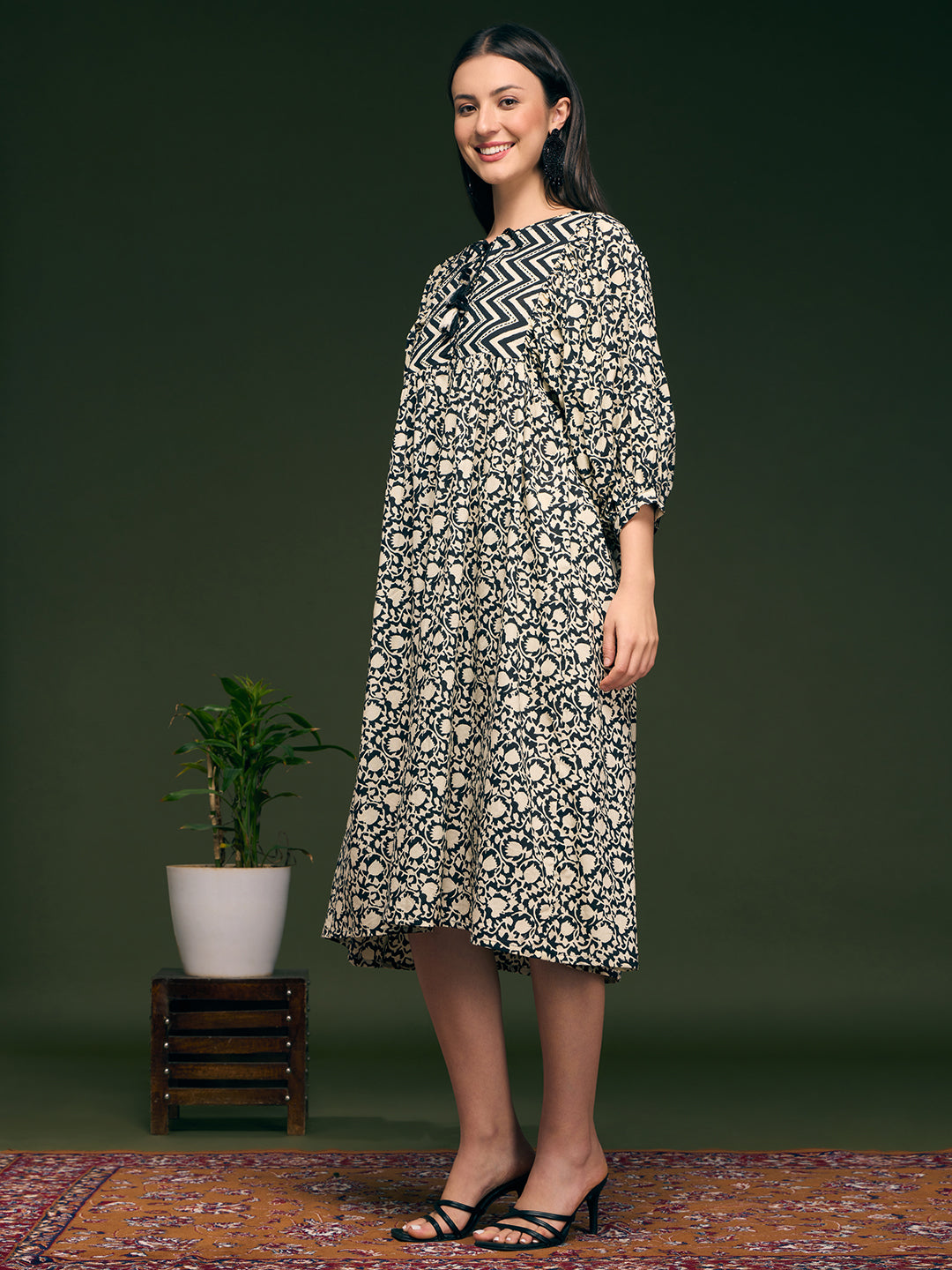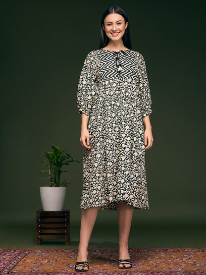 Ethnic Floral Printed Embroidered A-Line Pleated Midi Dress - Black