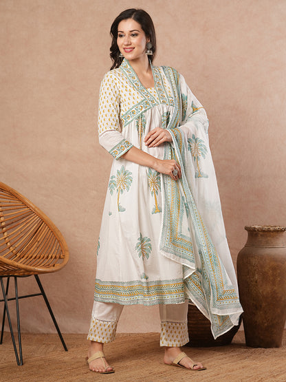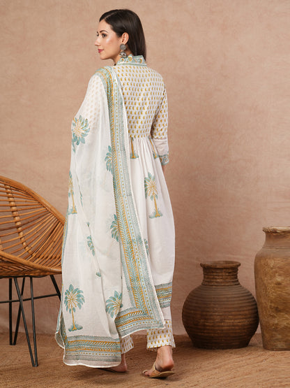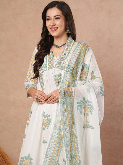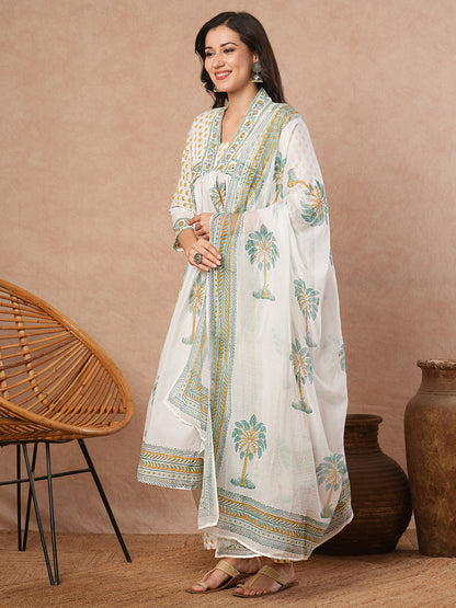 Ethnic Floral Printed Embroidered Anarkali Flared Kurta with Palazzo and Dupatta - White