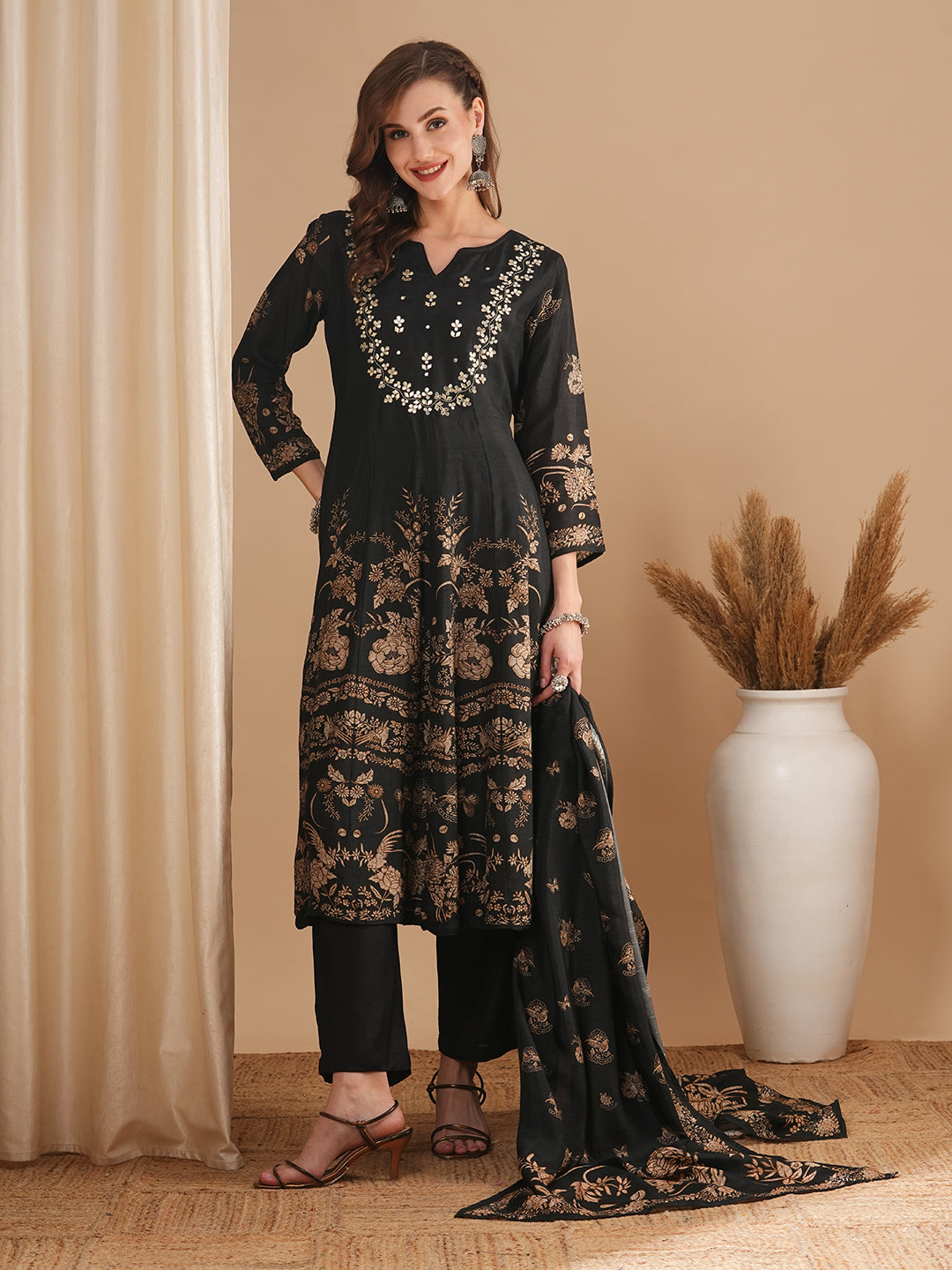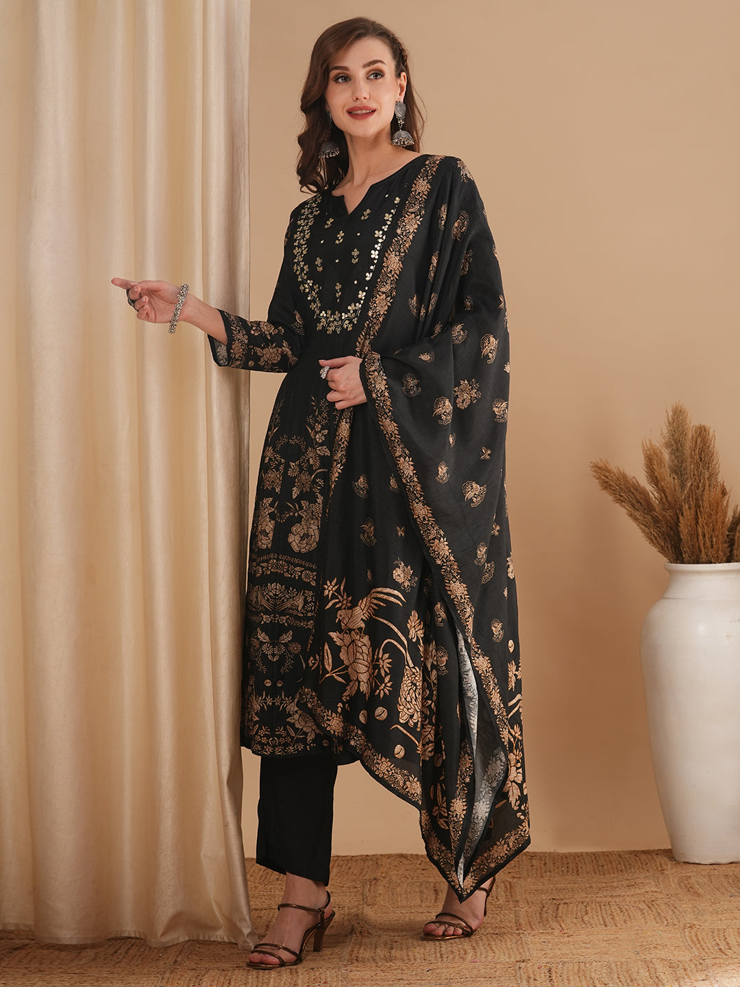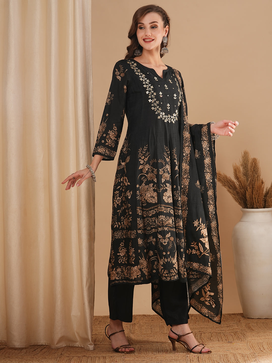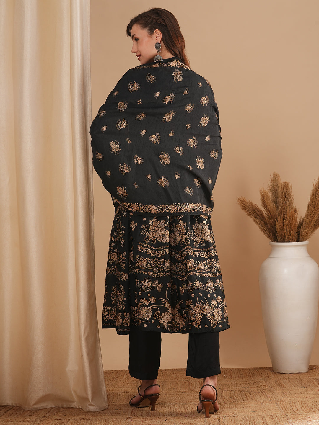 Ethnic Floral Printed & Embroidered Anarkali Flared Kurta with Pant and Dupatta - Black