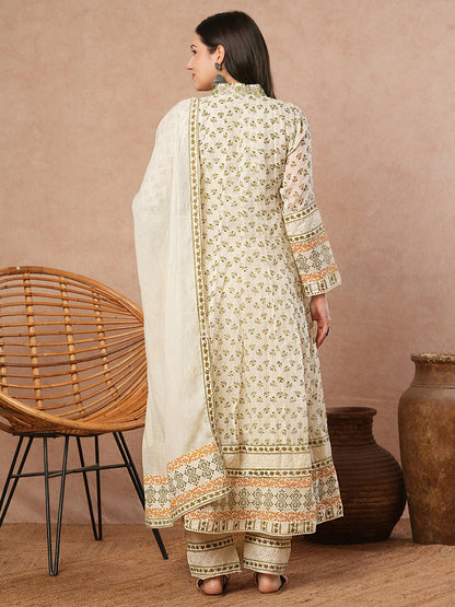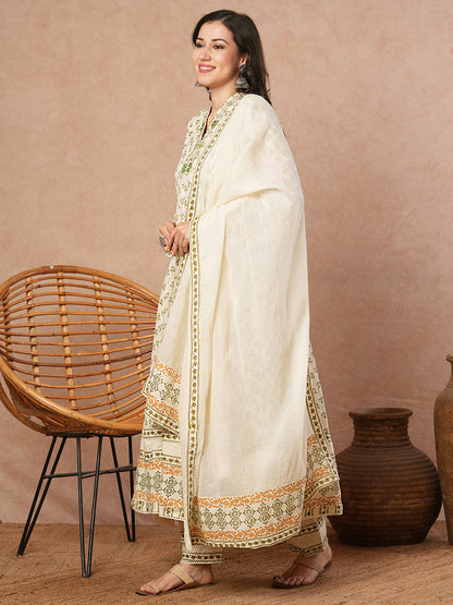 Ethnic Floral Printed Embroidered Anarkali Flared Kurta with Pant and Dupatta - Off White