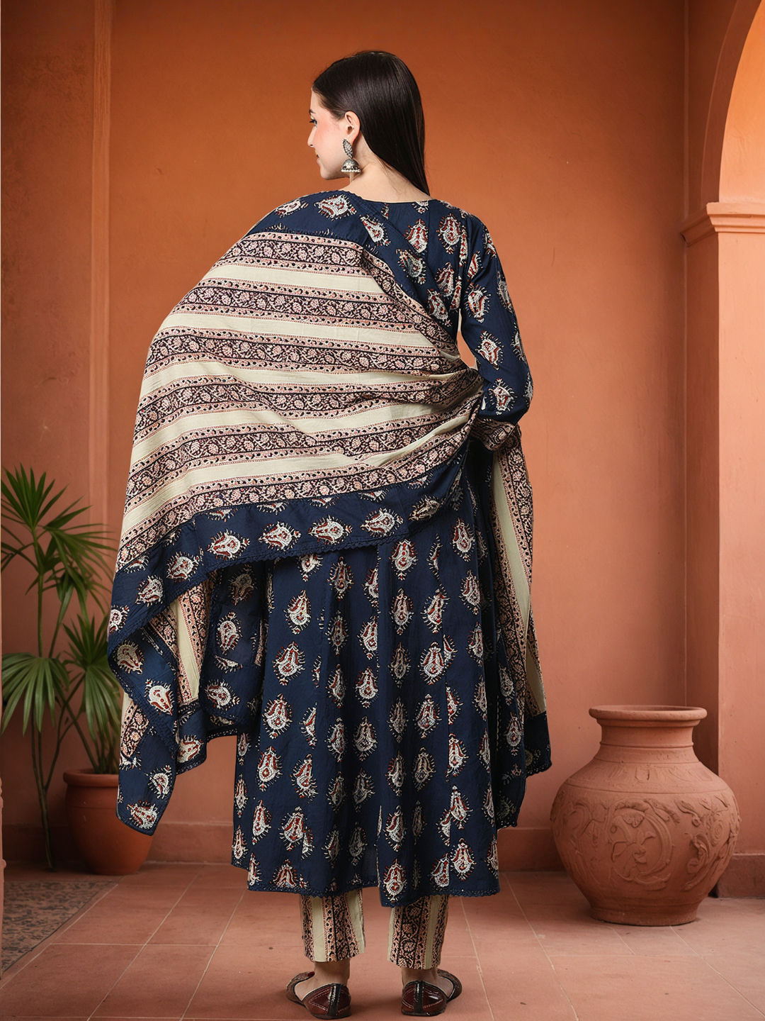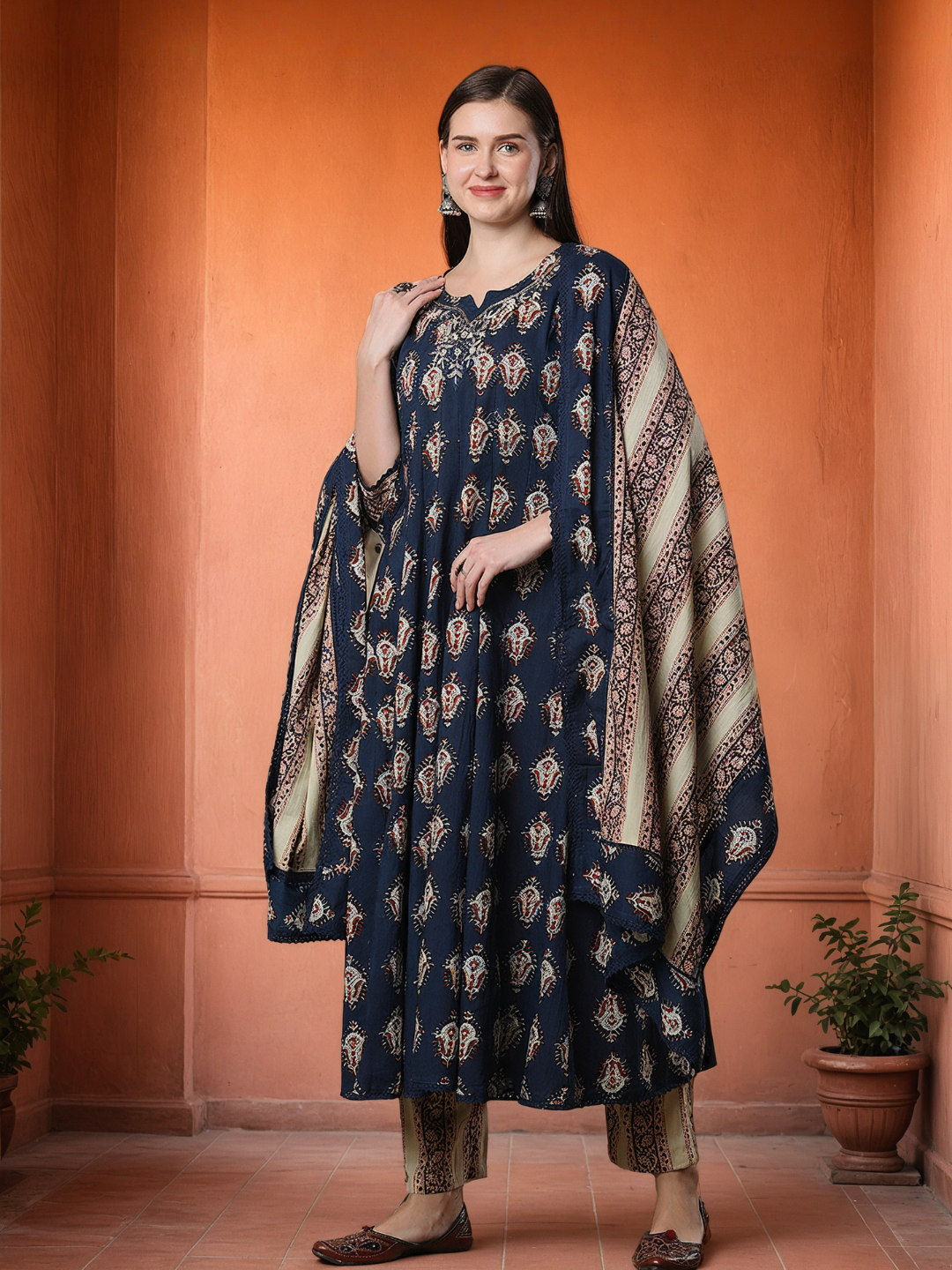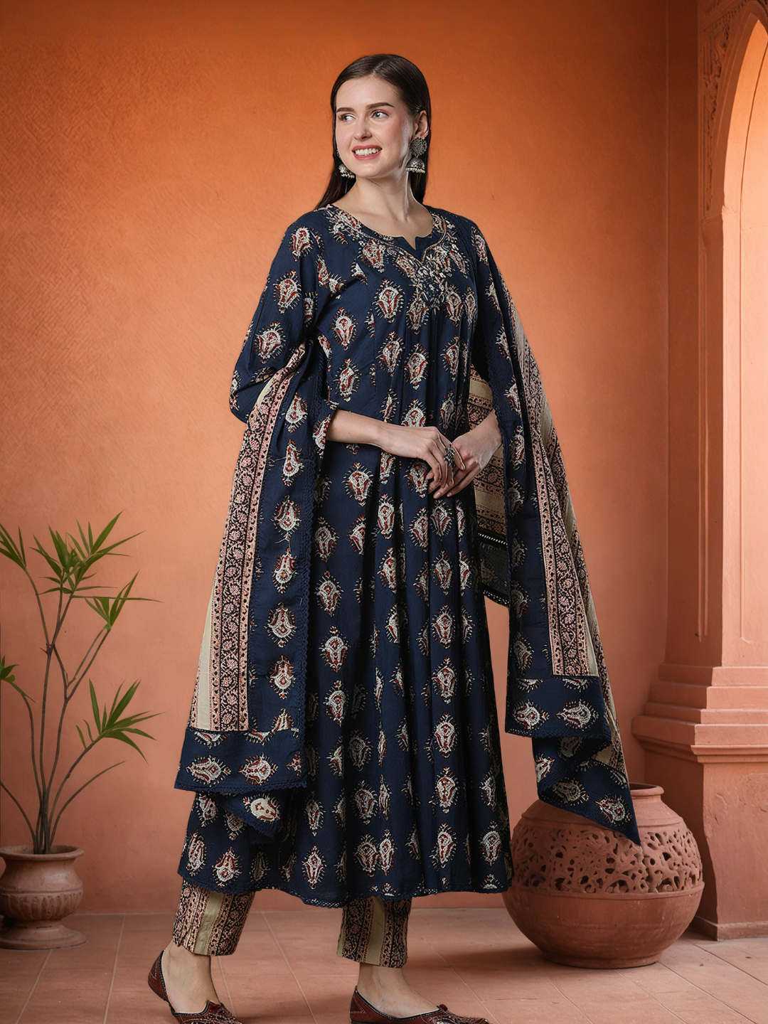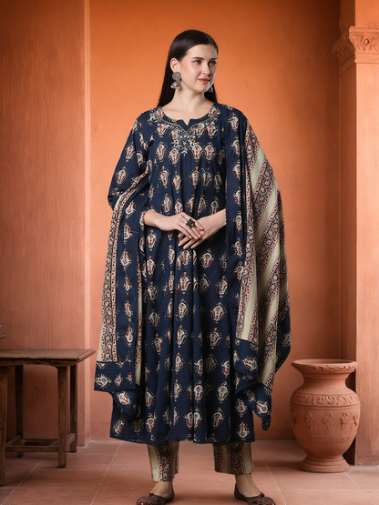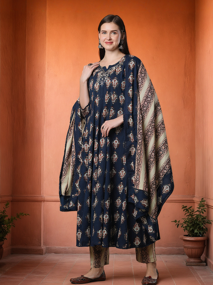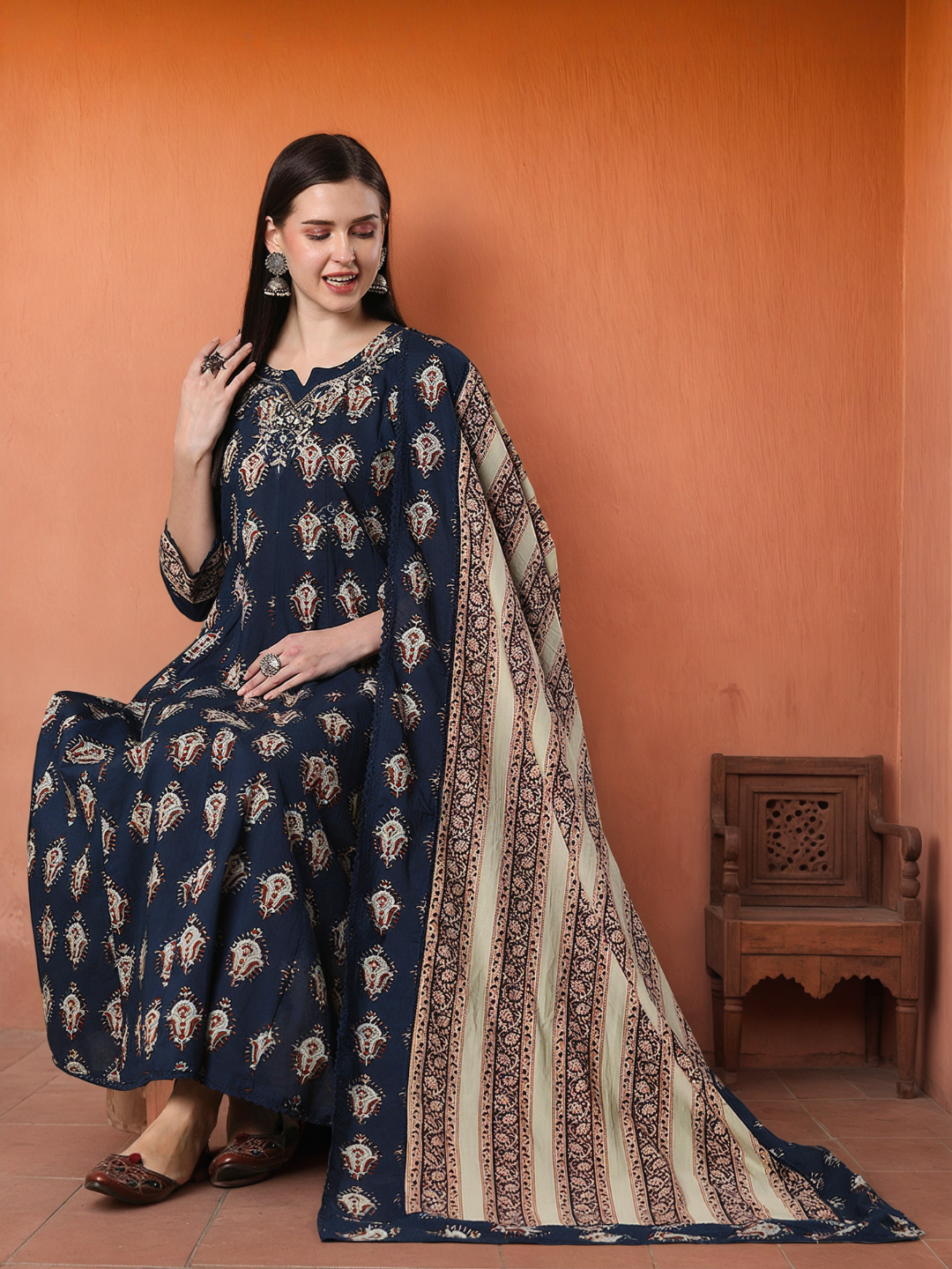 Ethnic Floral Printed & Embroidered Anarkali Flared Kurta with Pant & Dupatta - Blue