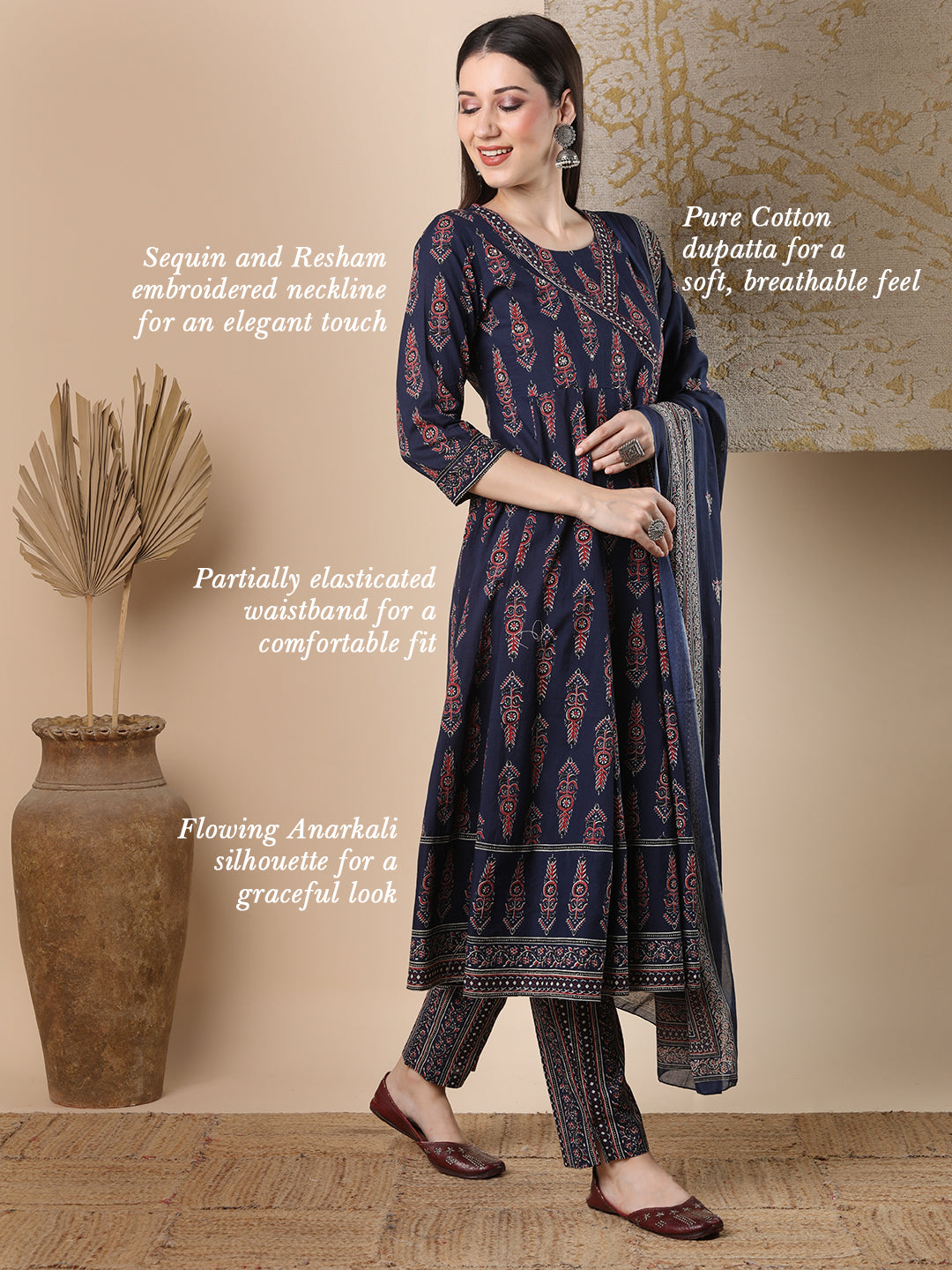 Ethnic Floral Printed & Embroidered Anarkali & Kurta with Pant & Dupatta - Blue