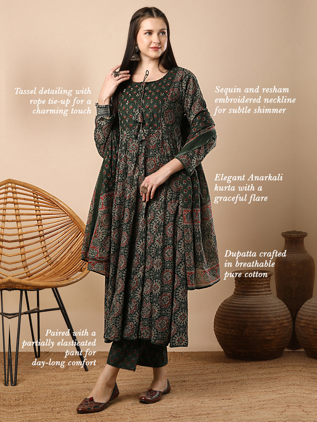 Ethnic Floral Printed & Embroidered Anarkali & Kurta with Pant & Dupatta - Green