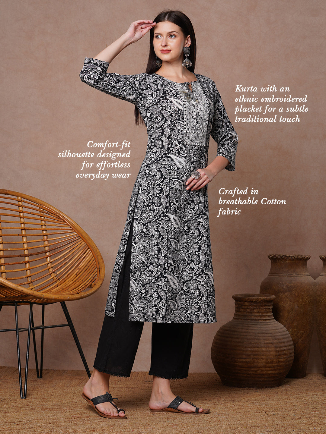 Ethnic Floral Printed & Embroidered Straight Fit Kurta - Black