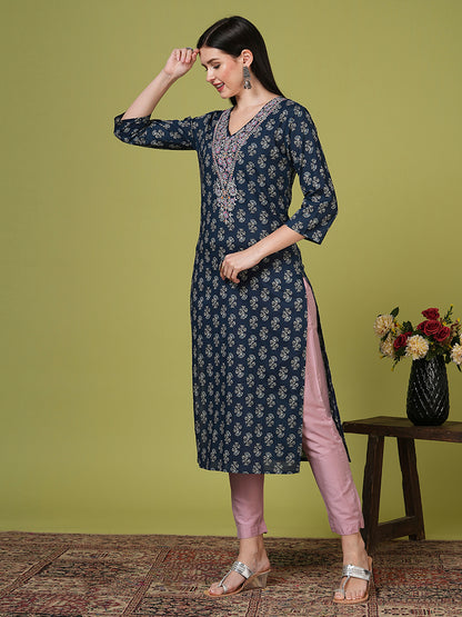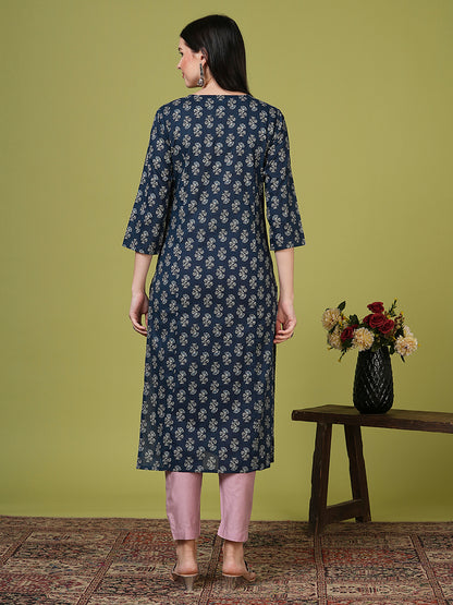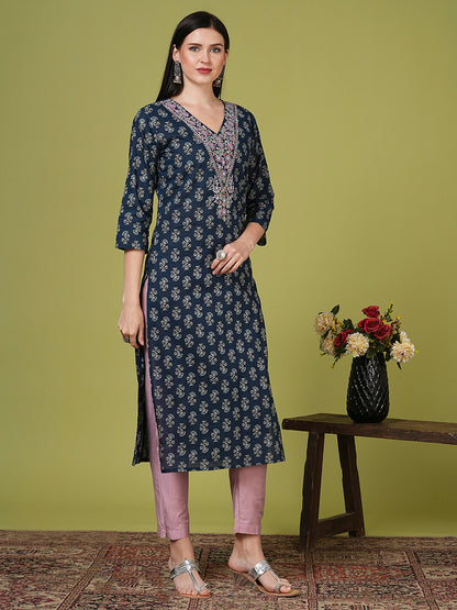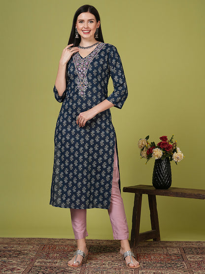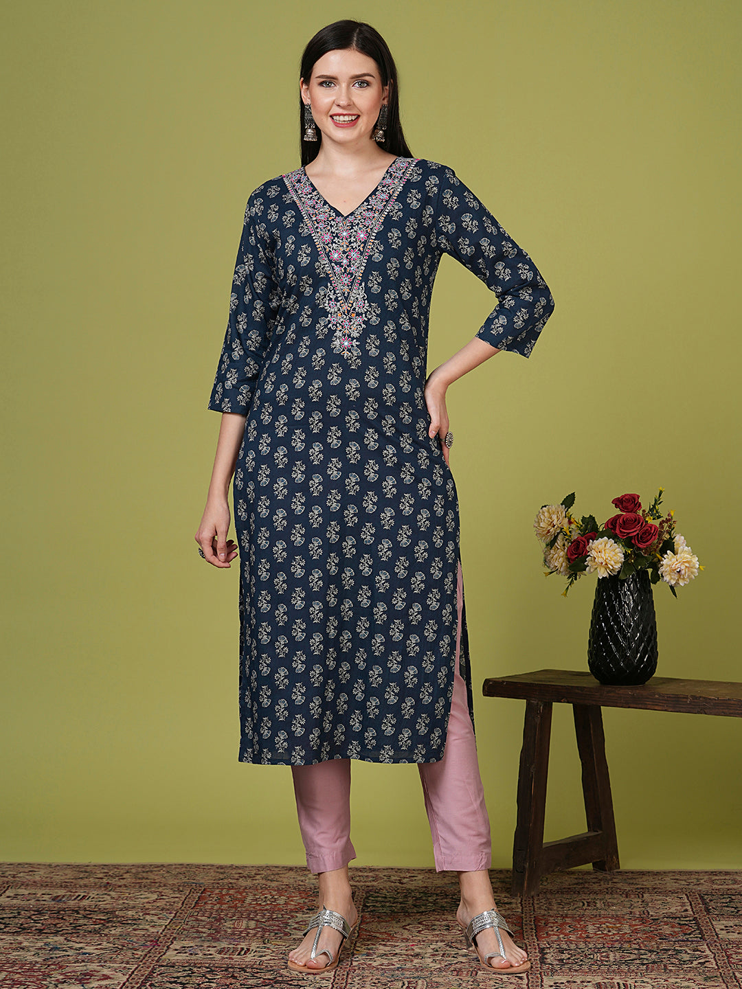 Ethnic Floral Printed & Embroidered Straight Fit Kurta - Blue