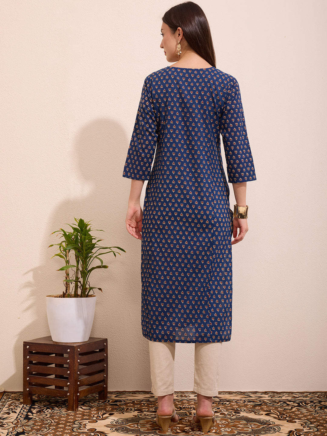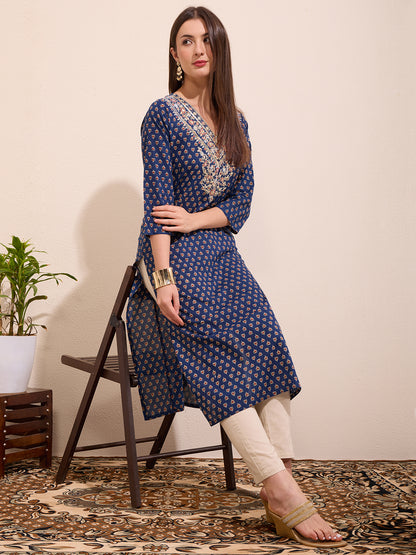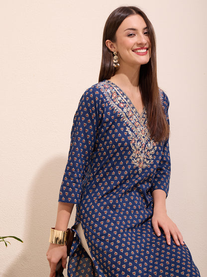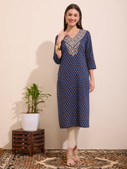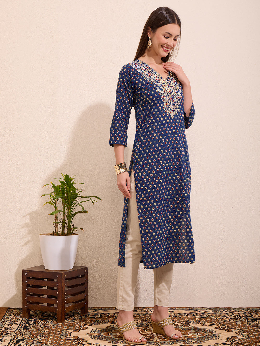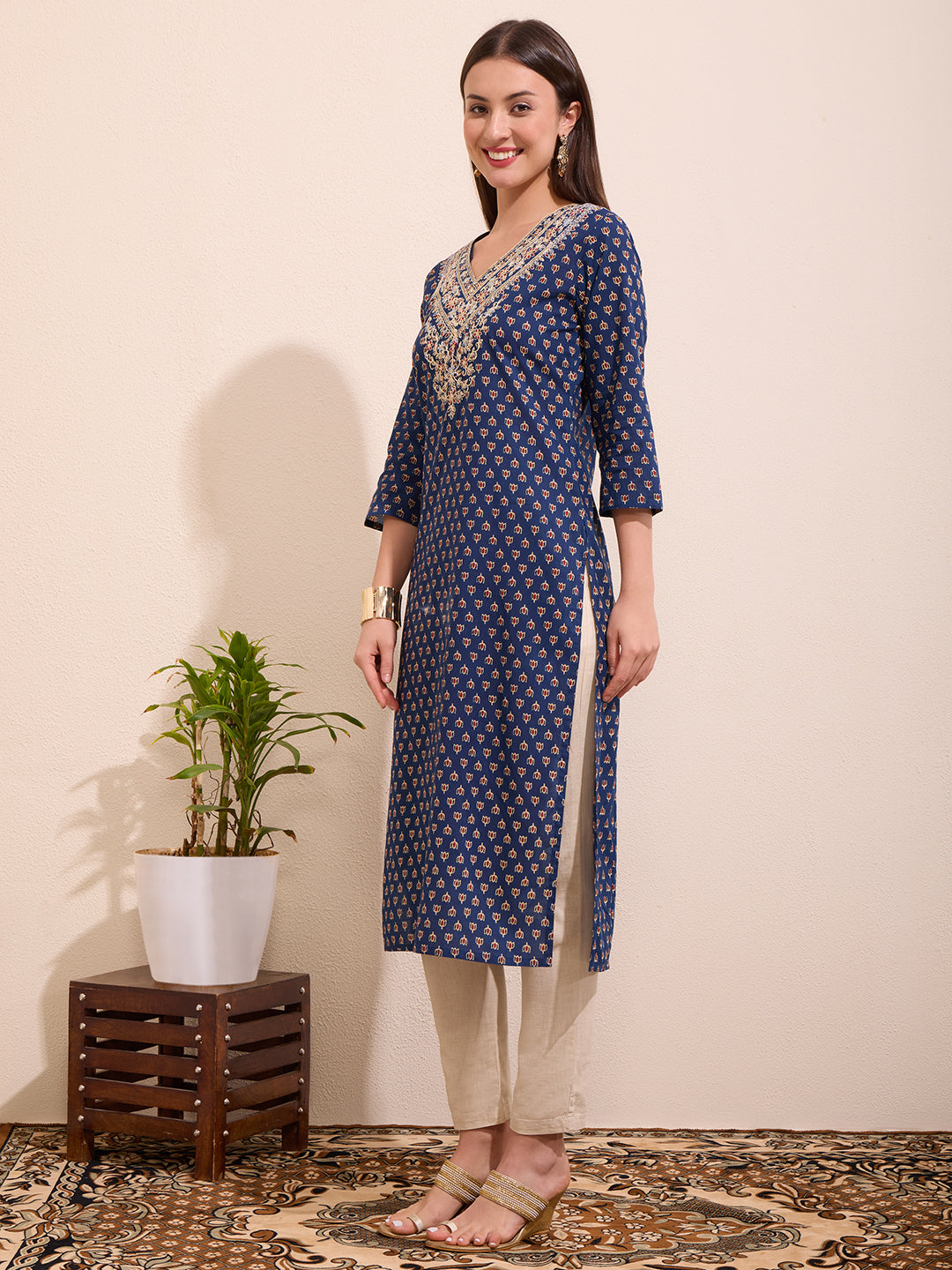 Ethnic Floral Printed Embroidered Straight Fit Kurta - Blue