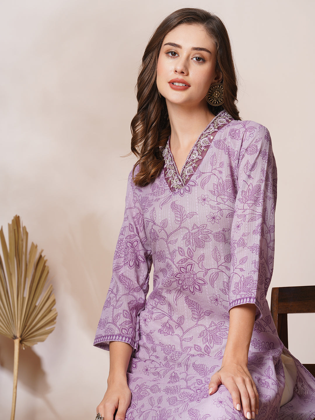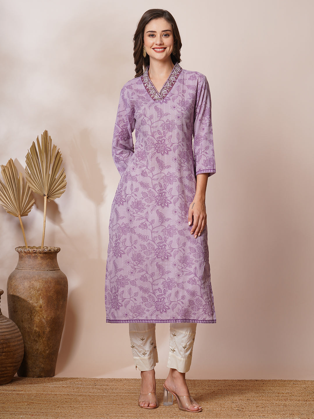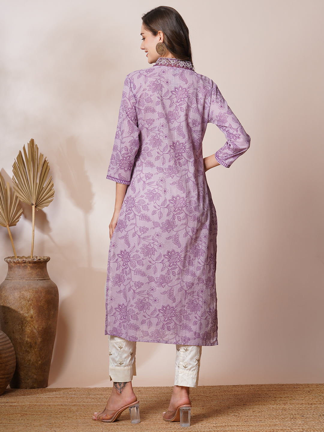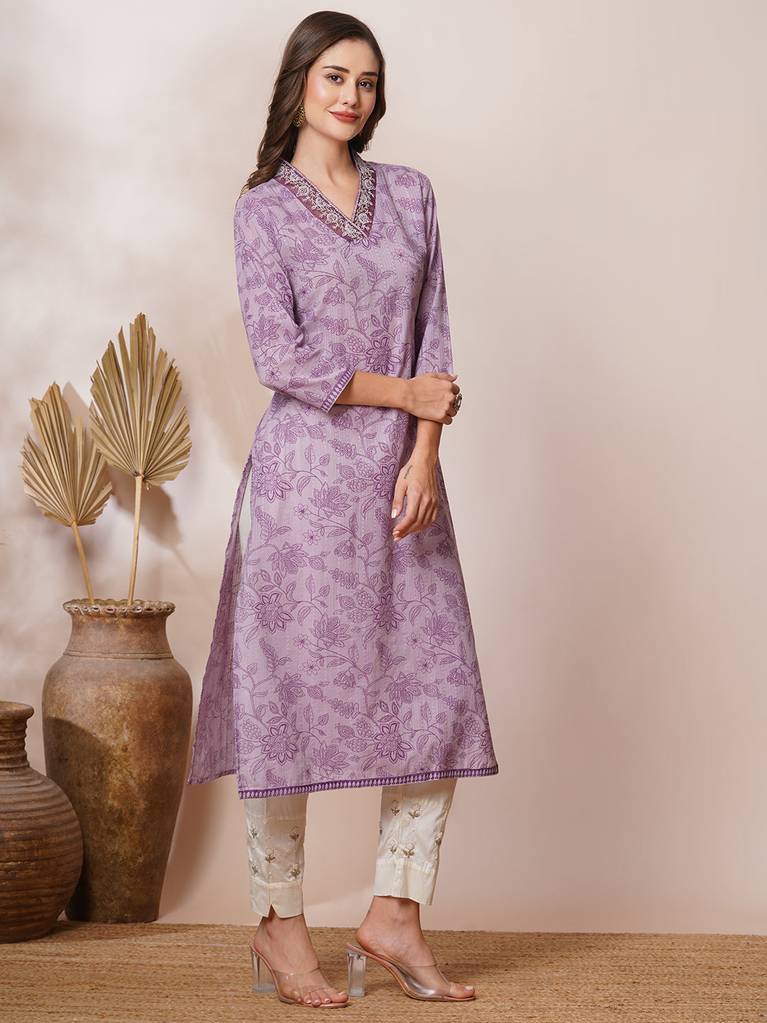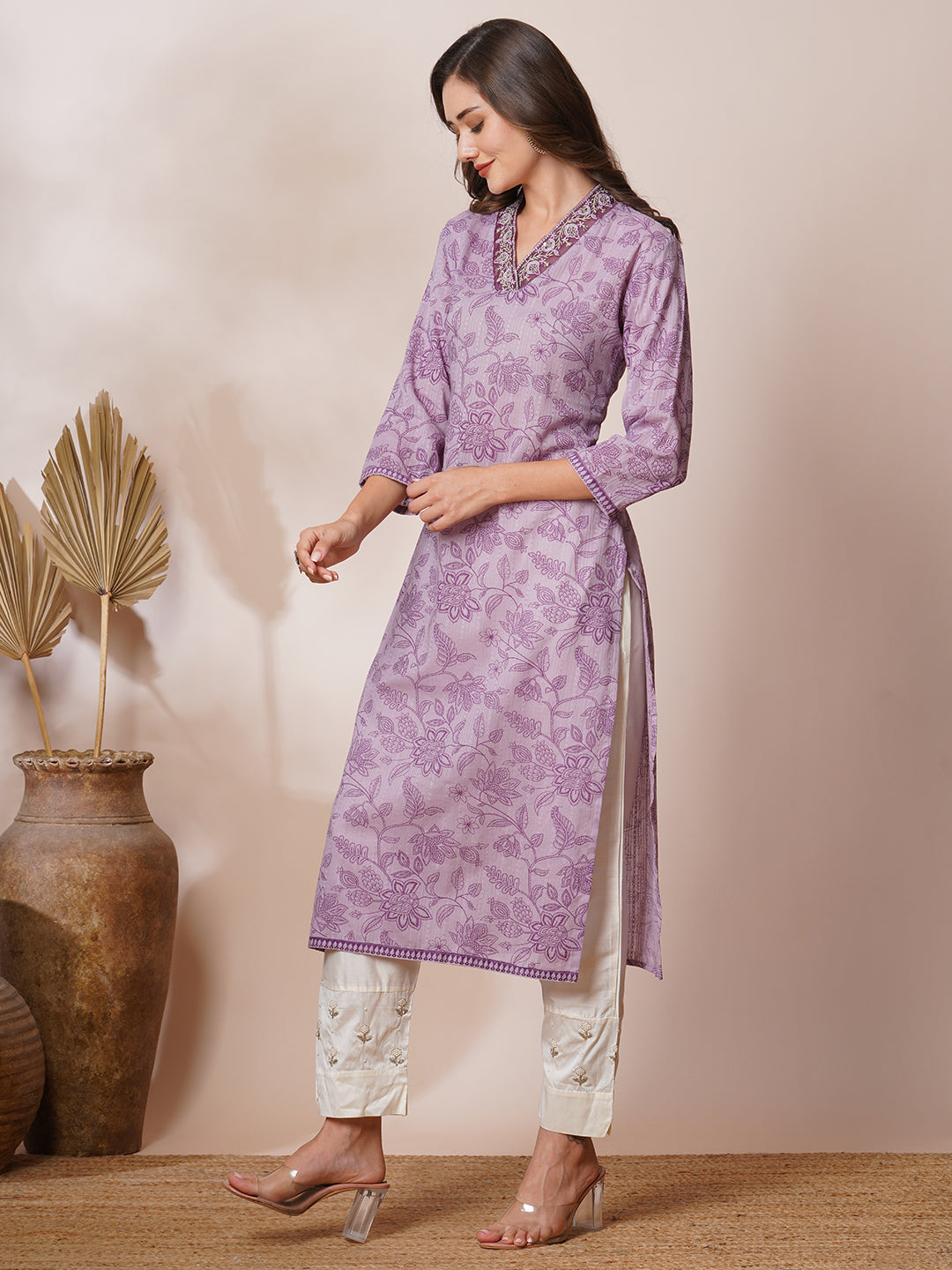 Ethnic Floral Printed & Embroidered Straight Fit Kurta - Lavender