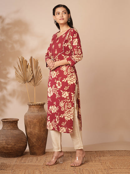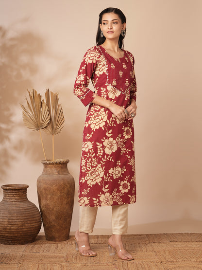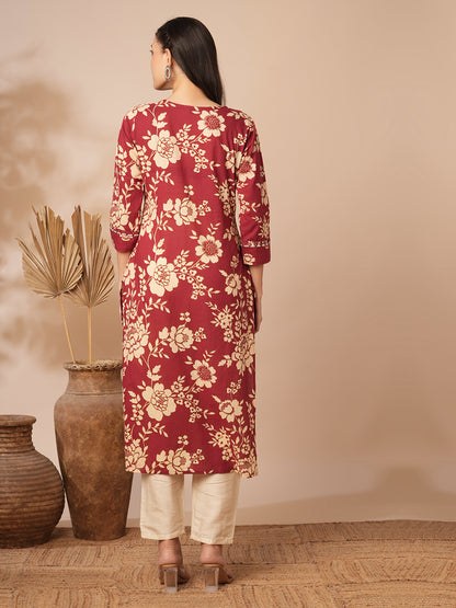 Ethnic Floral Printed & Embroidered Straight Fit Kurta - Maroon