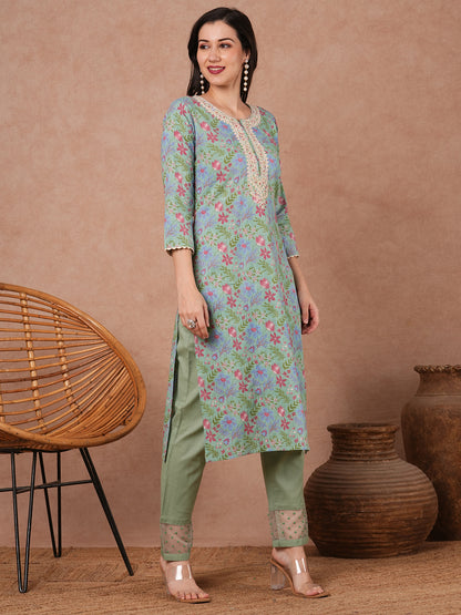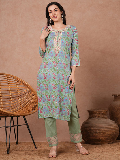 Ethnic Floral Printed Embroidered Straight Fit Kurta - Mint Green