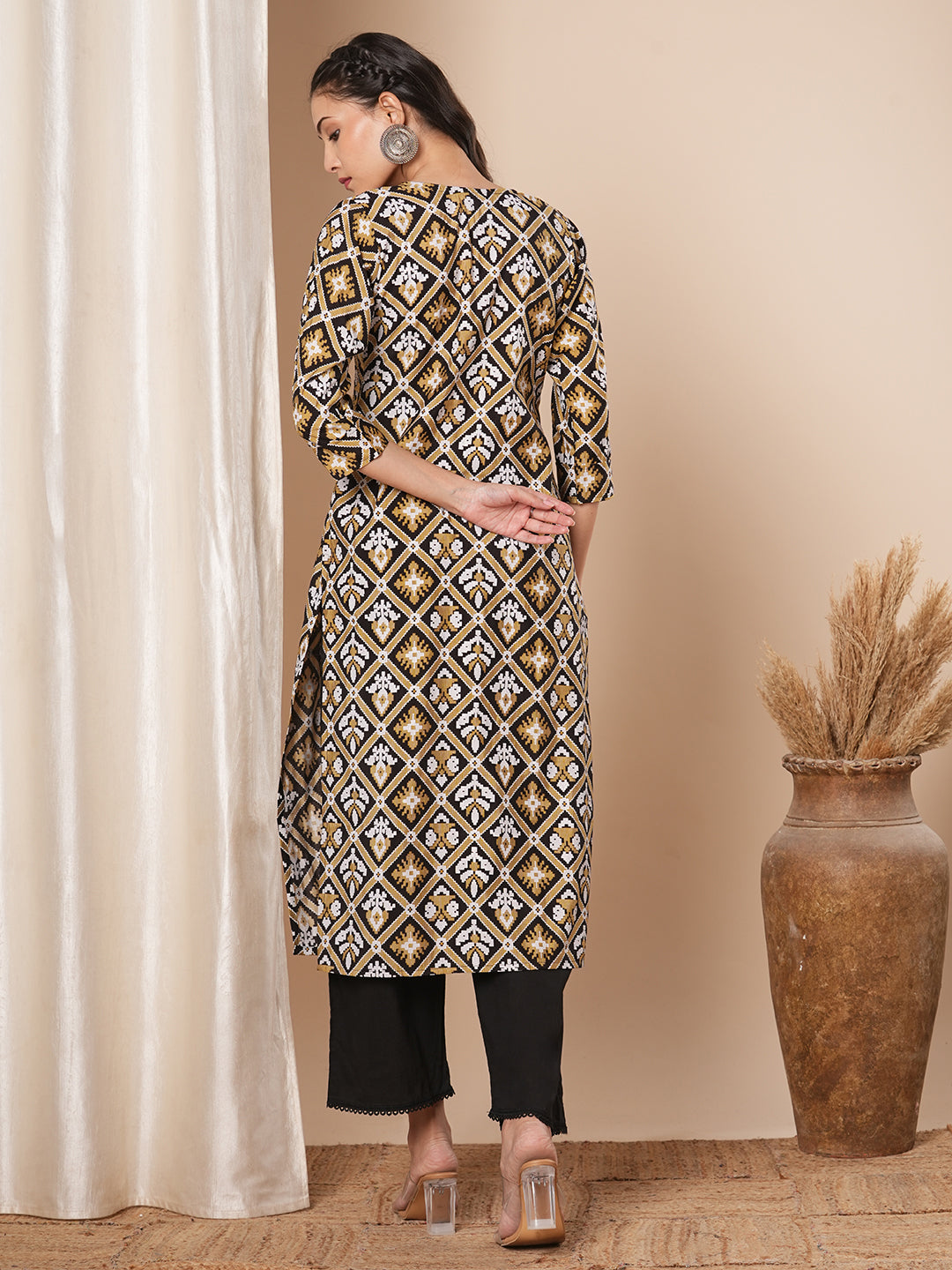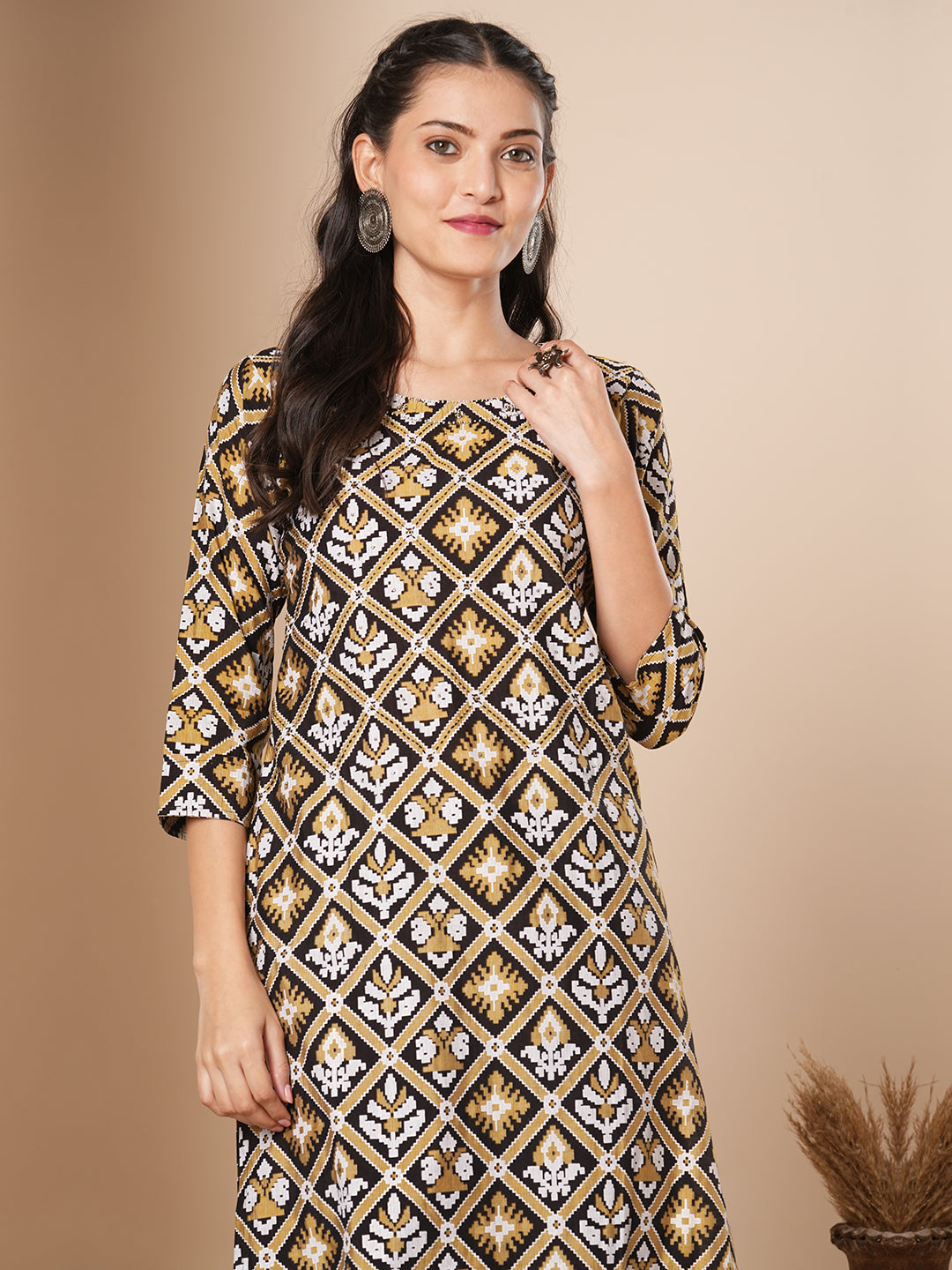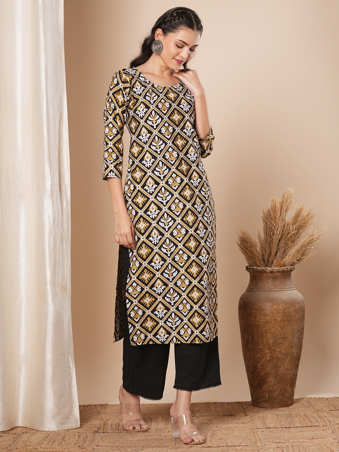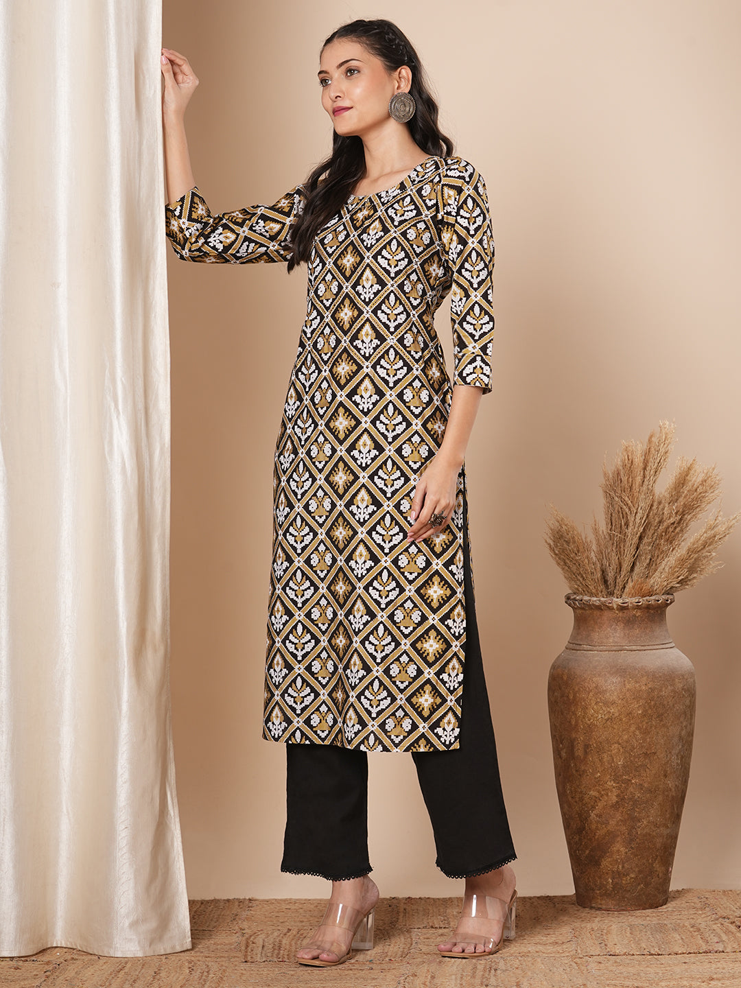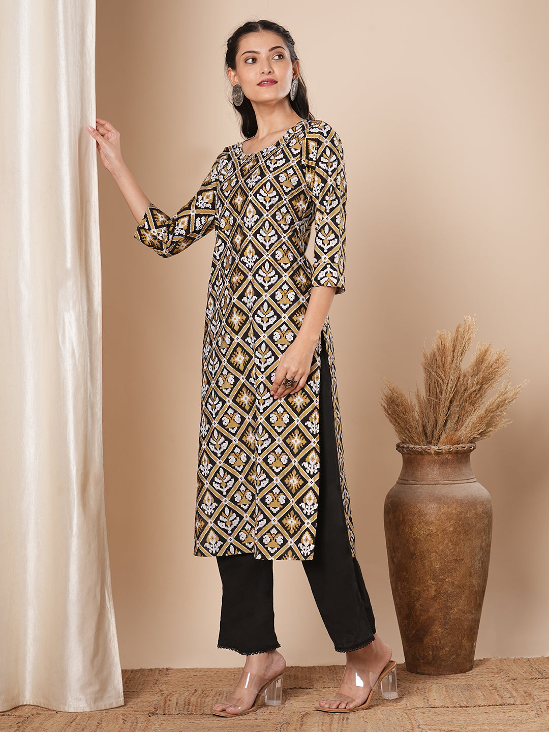 This straight fit kurta with ethnic floral prints all over features beads & thread work embroidered round neckline ,this style is perfect for elevated everyday wear.