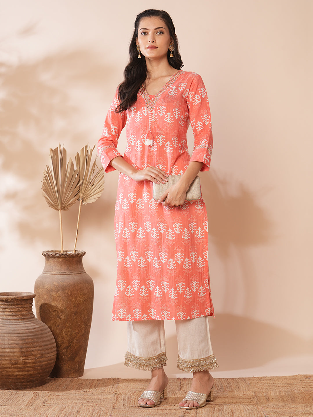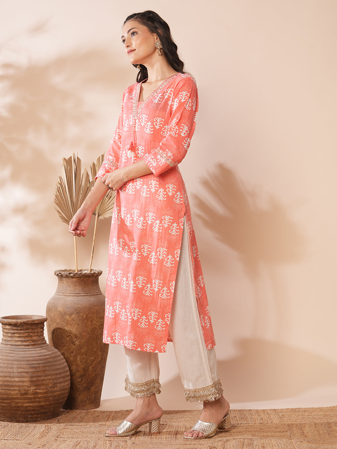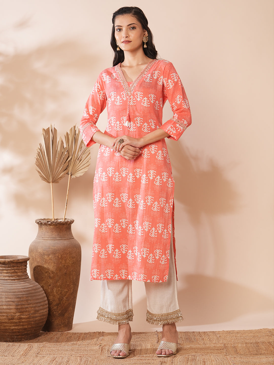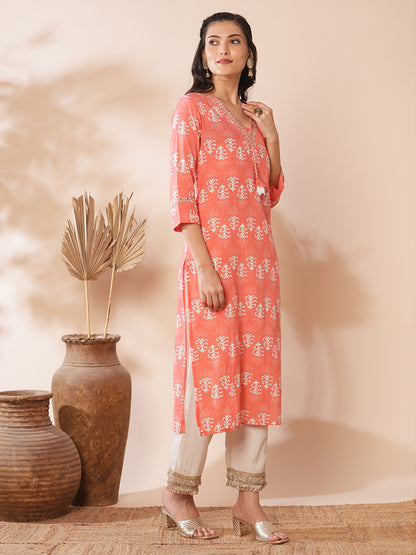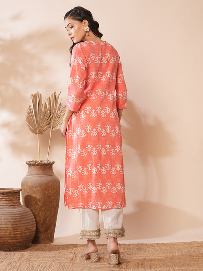 Ethnic Floral Printed & Embroidered Straight Fit Kurta - Peach