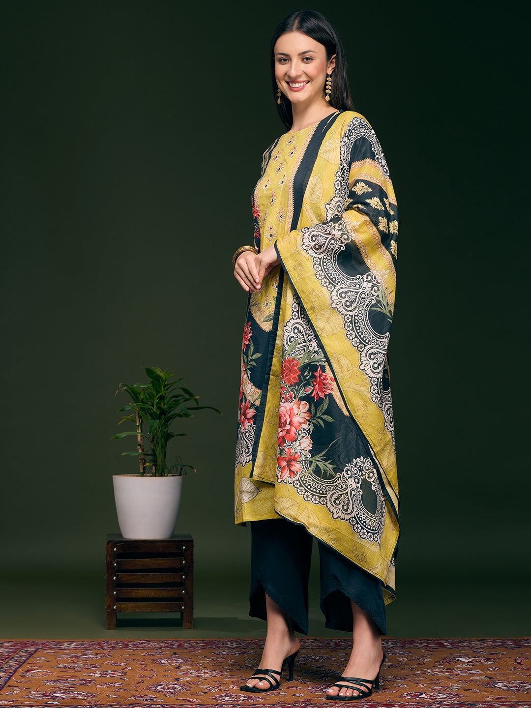 Ethnic Floral Printed & Embroidered Straight Fit Kurta with Palazzo & Dupatta - Lime Green