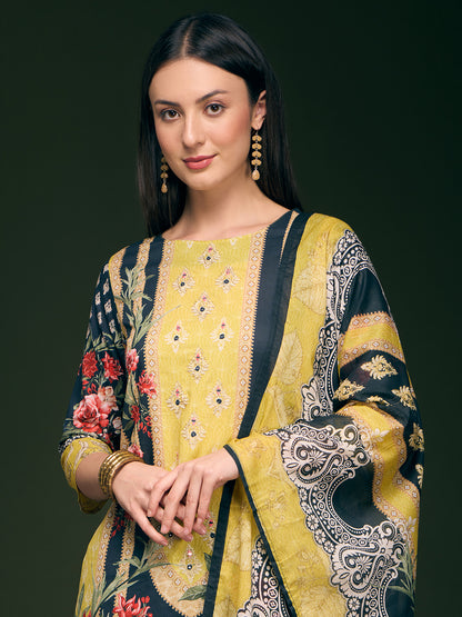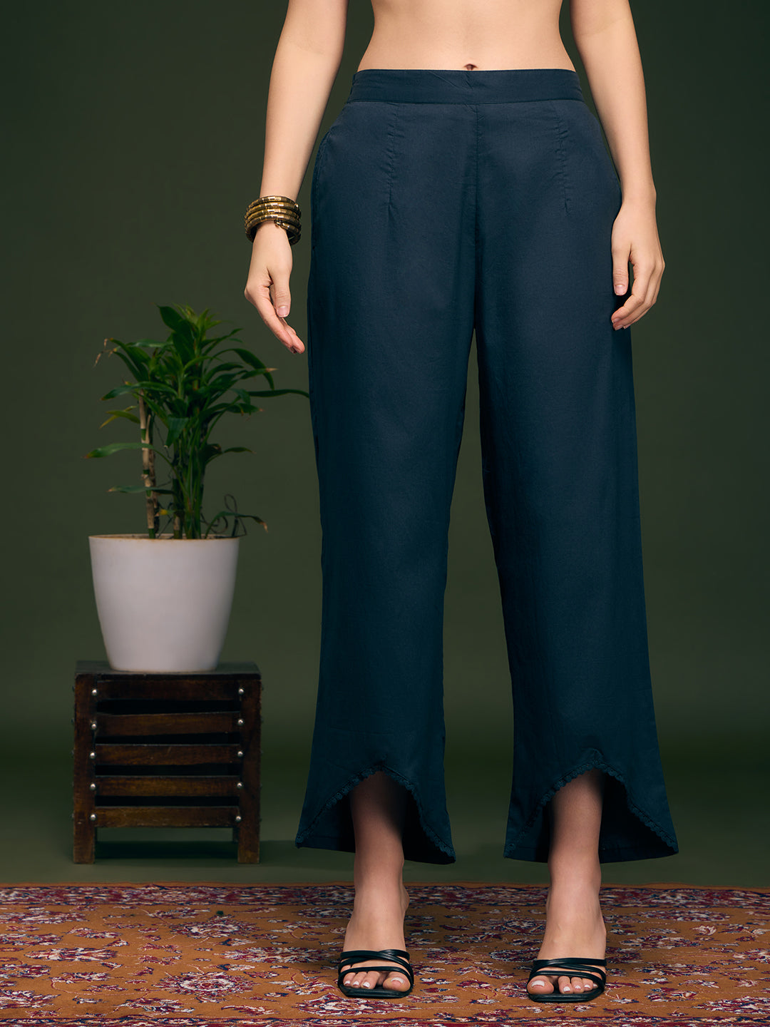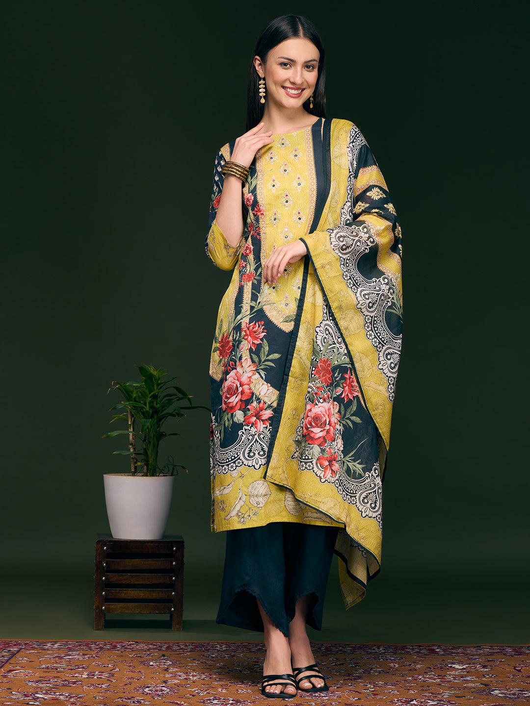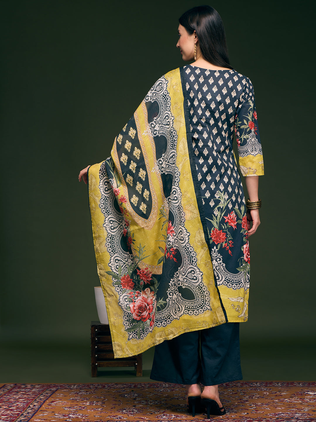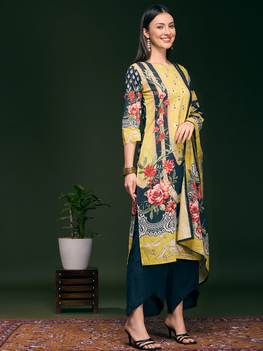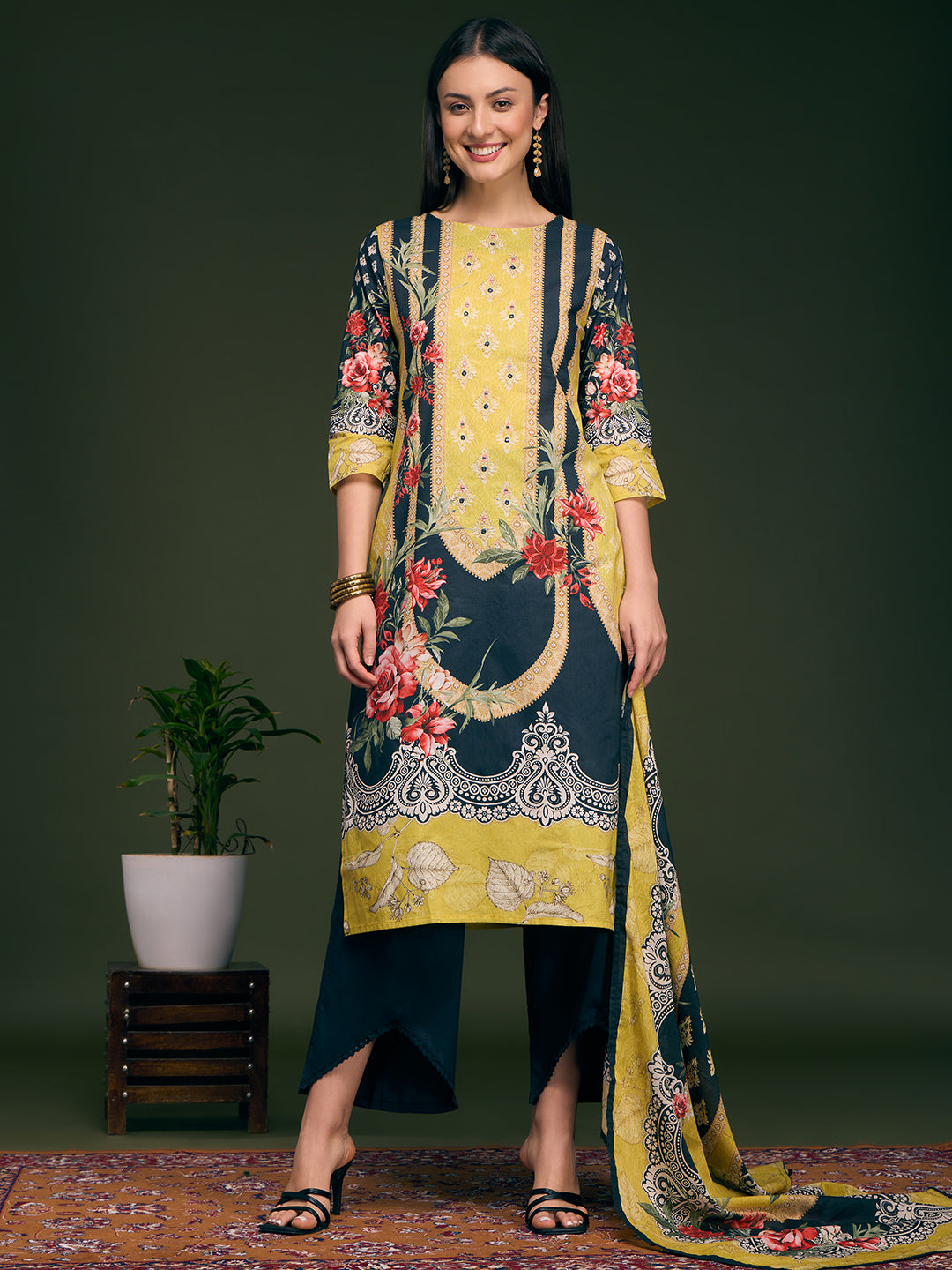 Step into effortless grace with this vibrant floral printed and embroidered straight-fit kurta, crafted from soft, breathable cotton. The intricate mirror work detailing adds a touch of tradition, while the sleek silhouette ensures modern charm. Paired with a solid-toned palazzo for a balanced contrast and a matching dupatta to complete the look, this ensemble is perfect for daytime festivities or elegant evening affairs.