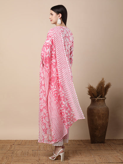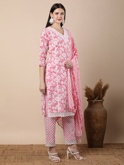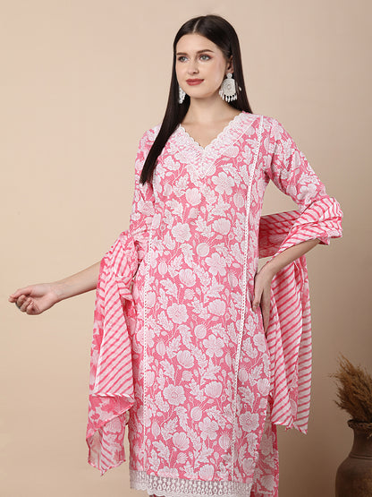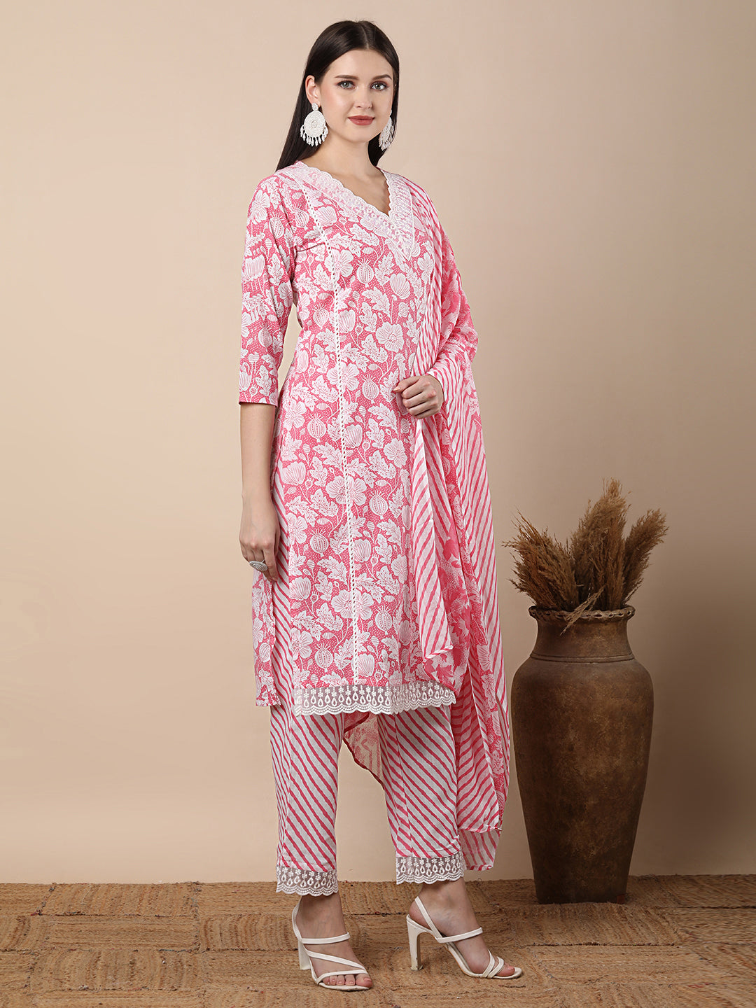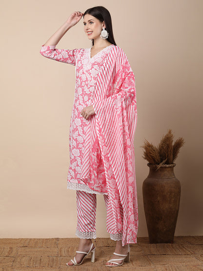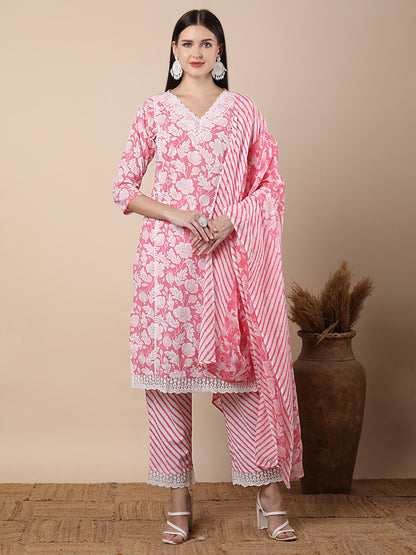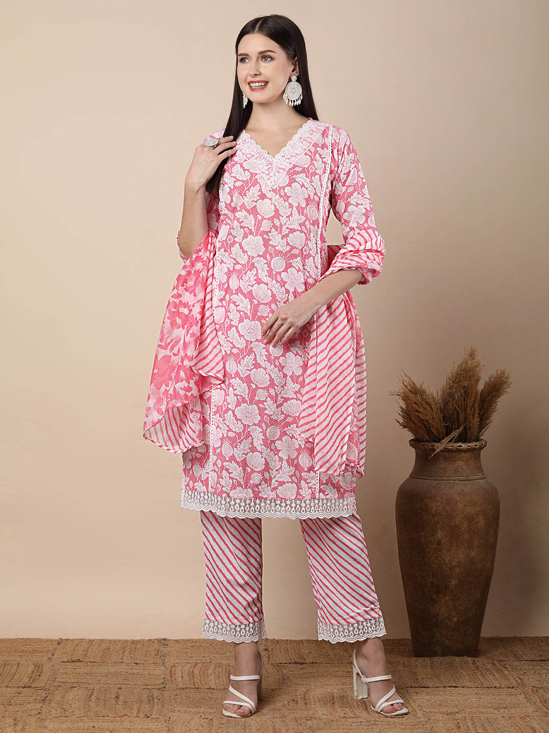 Ethnic Floral Printed Embroidered Straight Fit Kurta with Pant and Dupatta - Pink