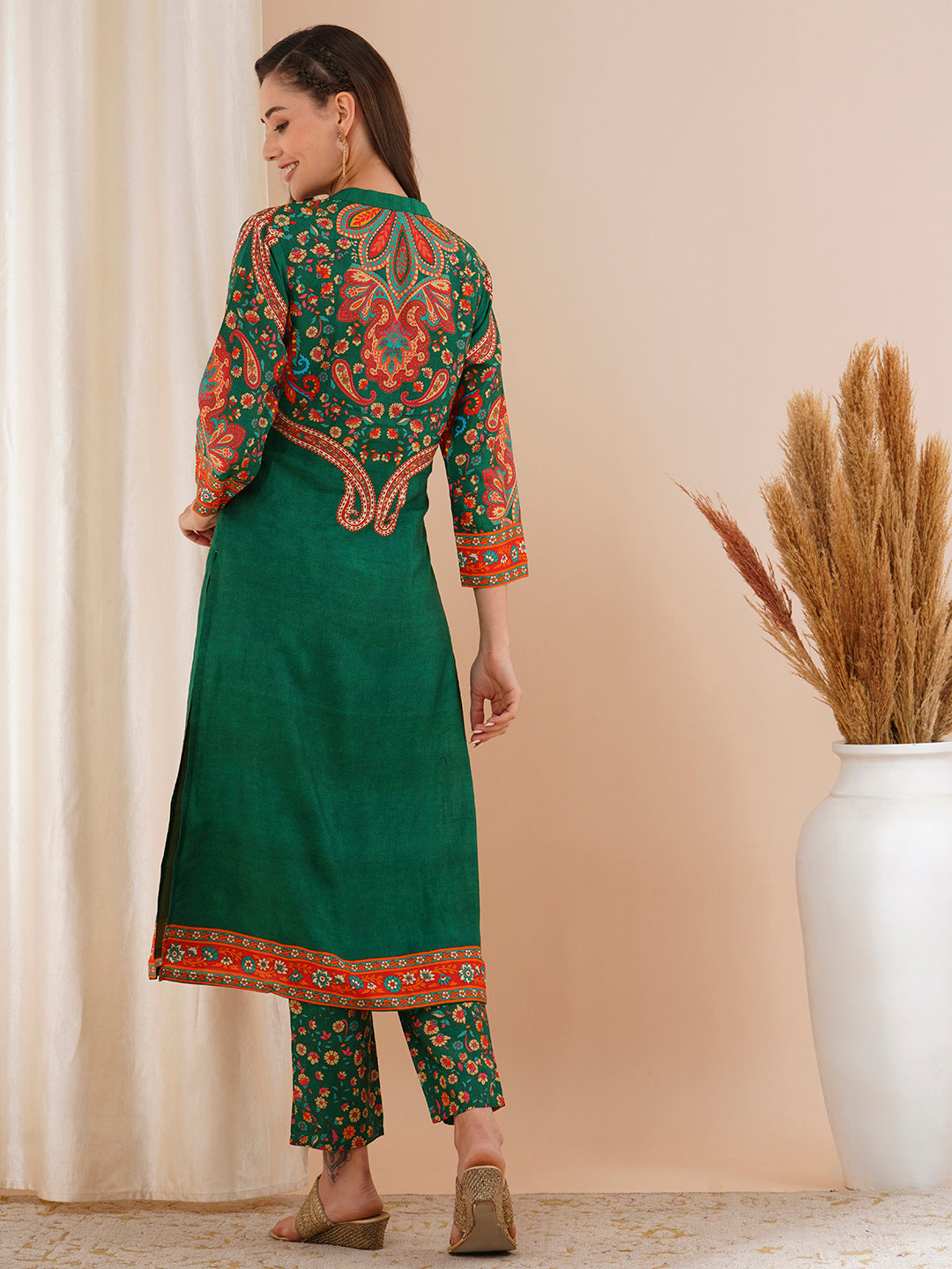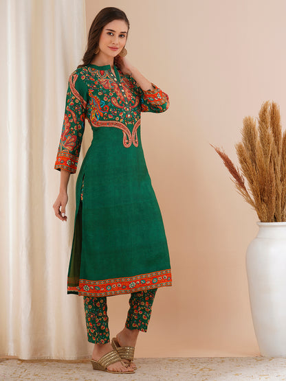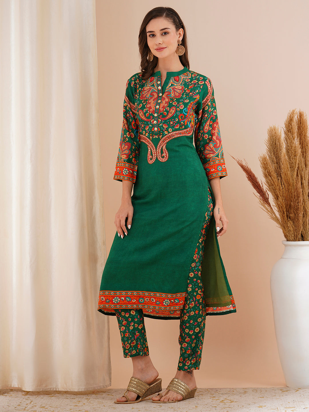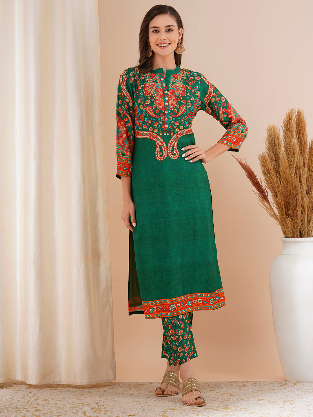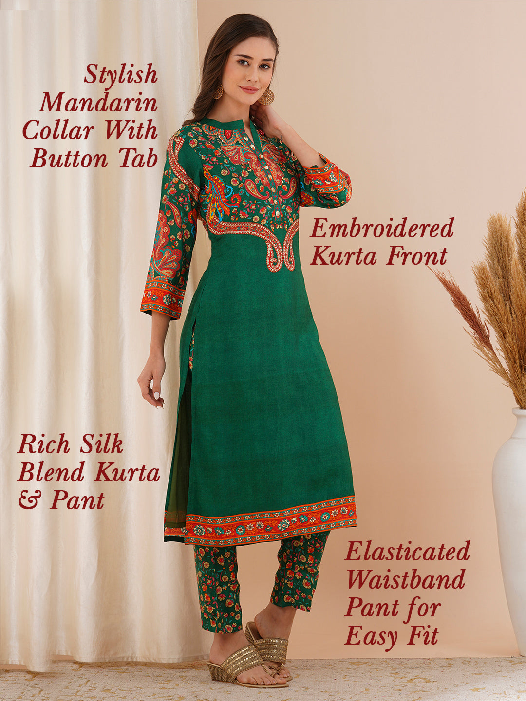 Ethnic Floral Printed & Embroidered Straight Fit Kurta with Pant - Green