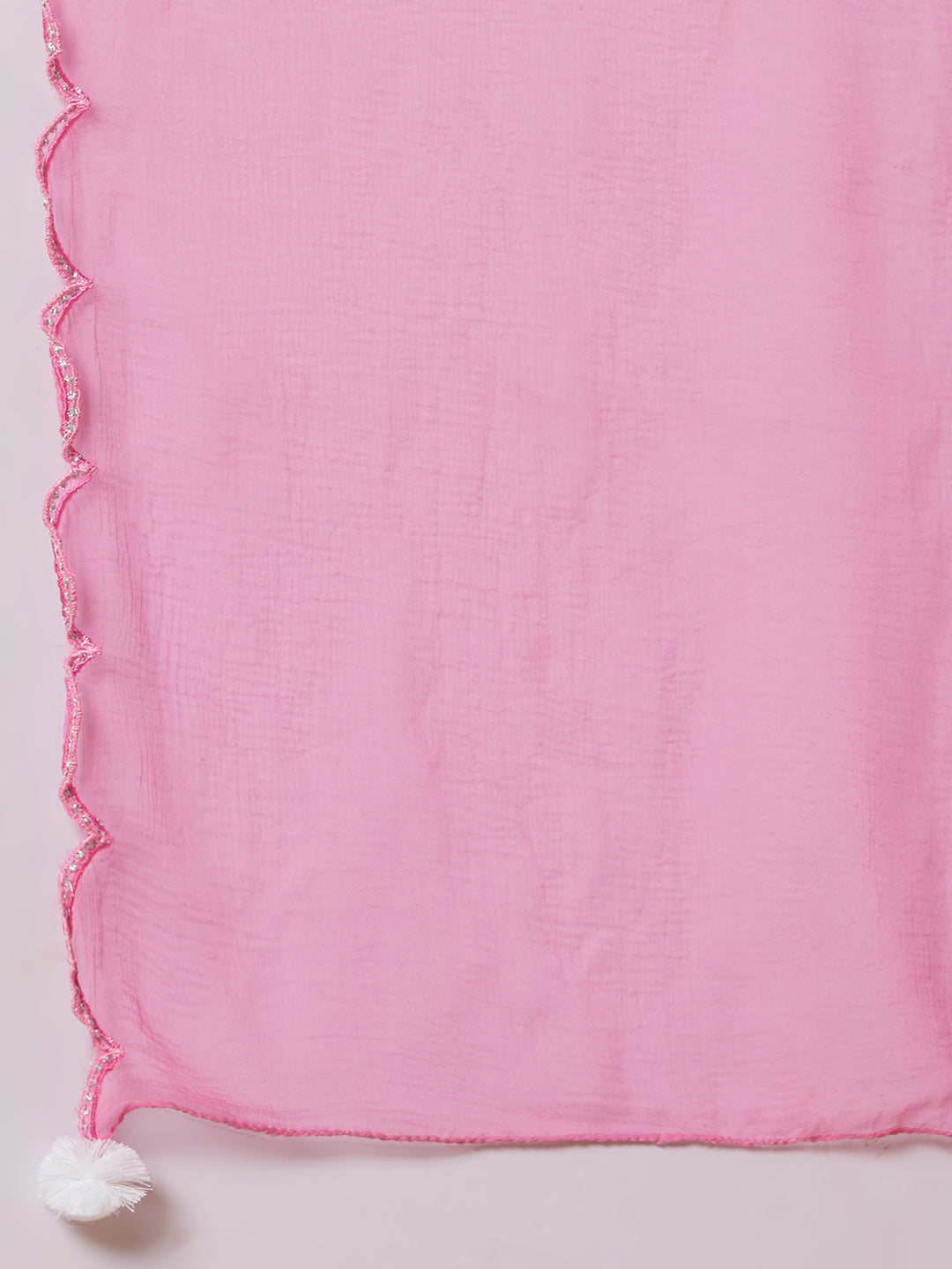 Embrace timeless charm with our Ethnic Floral Printed & Embroidered Kurta Set in graceful pink. Tailored from breathable cotton fabric, this ensemble features a straight-cut kurta adorned with delicate threadwork embroidery and a sparkling glass neckline for a touch of elegance. Paired with solid palazzos for effortless comfort and a light chiffon dupatta that drapes beautifully, this set blends tradition with contemporary flair—perfect for festive gatherings or daytime celebrations.