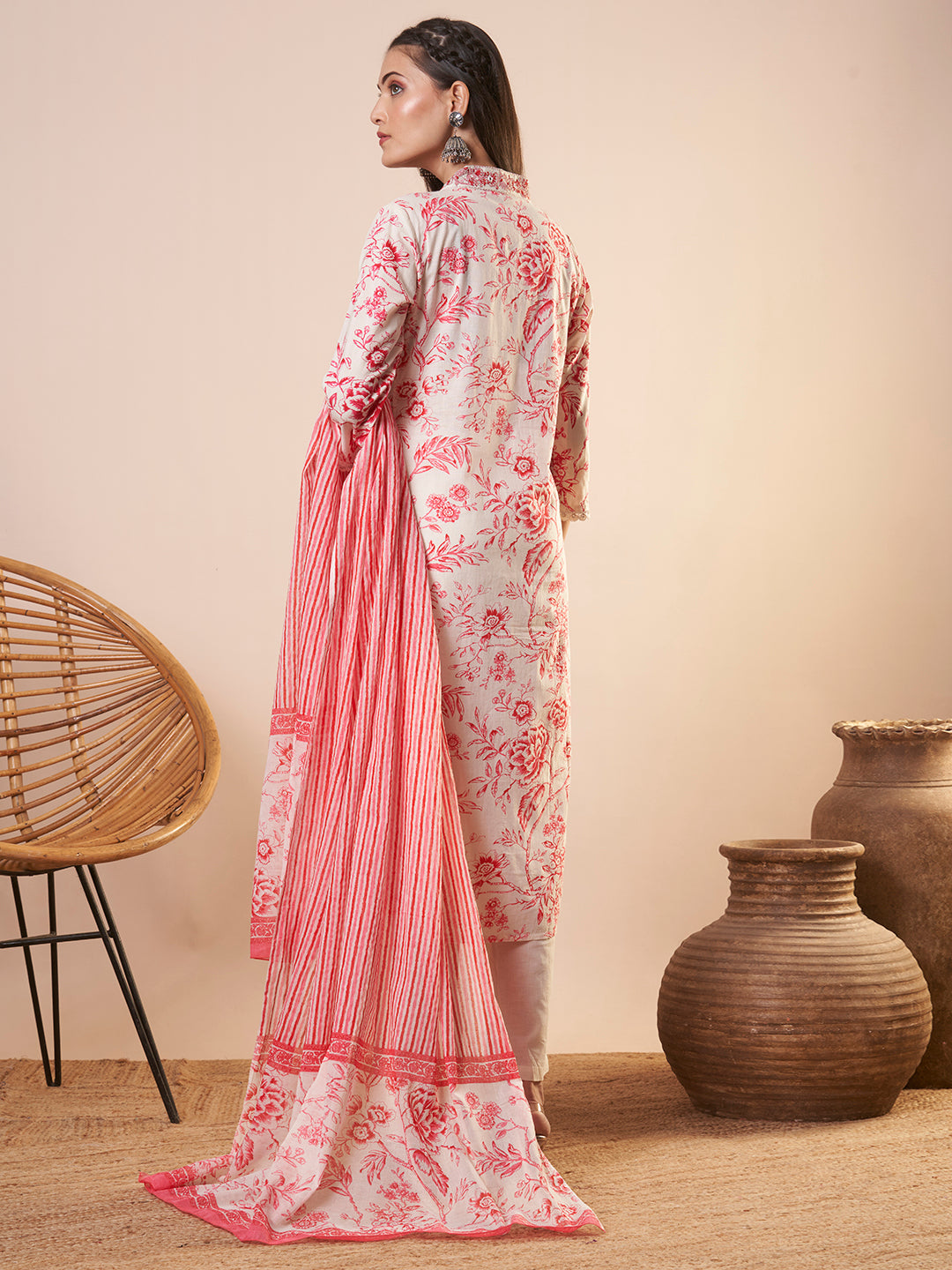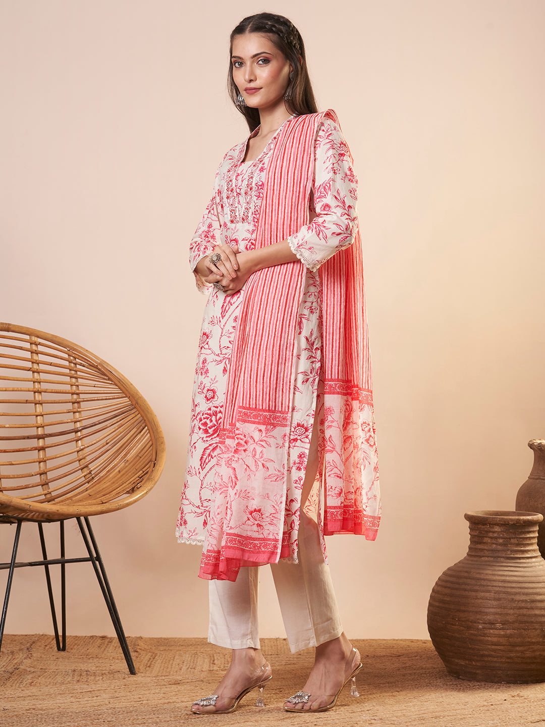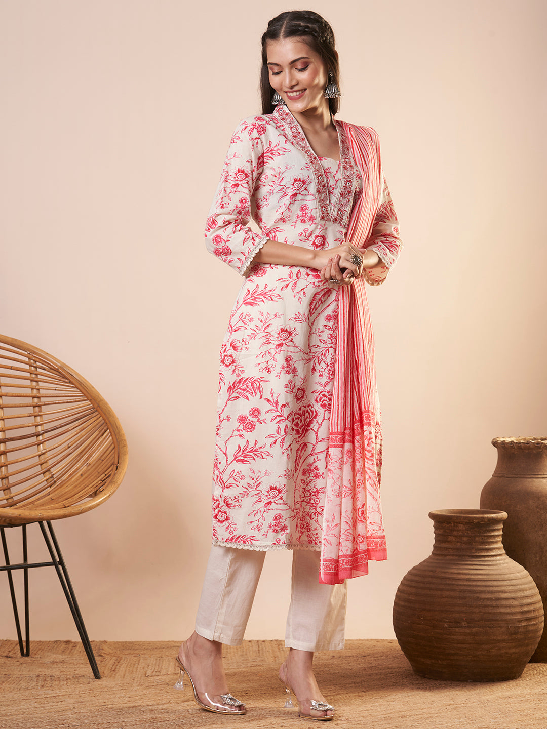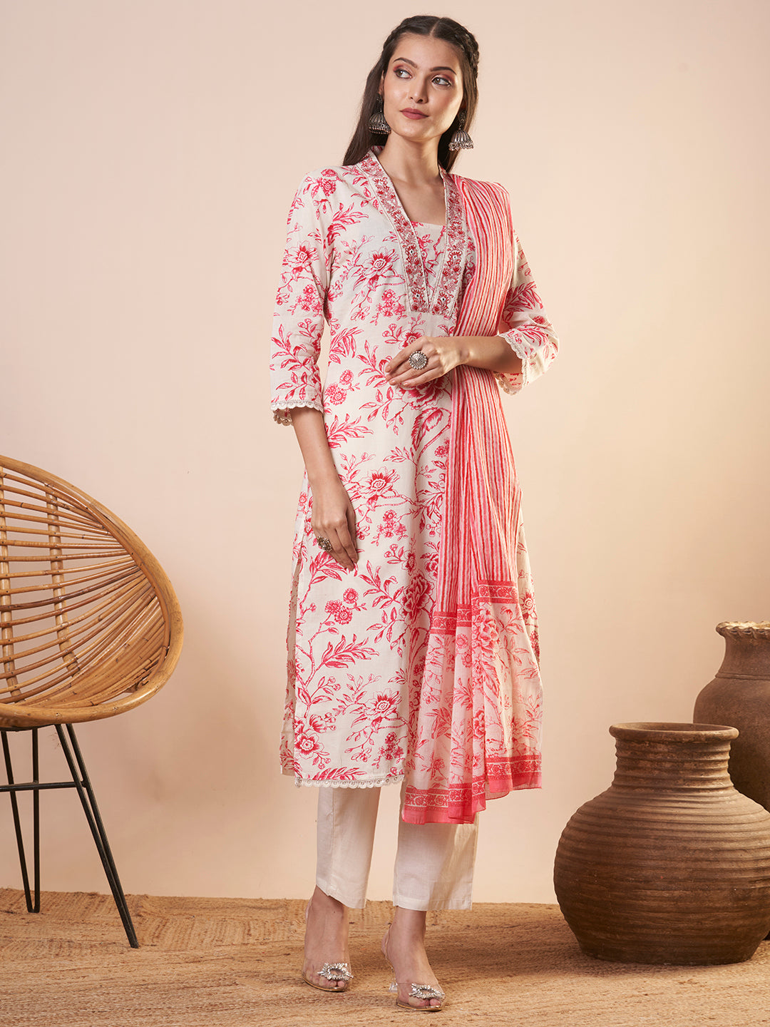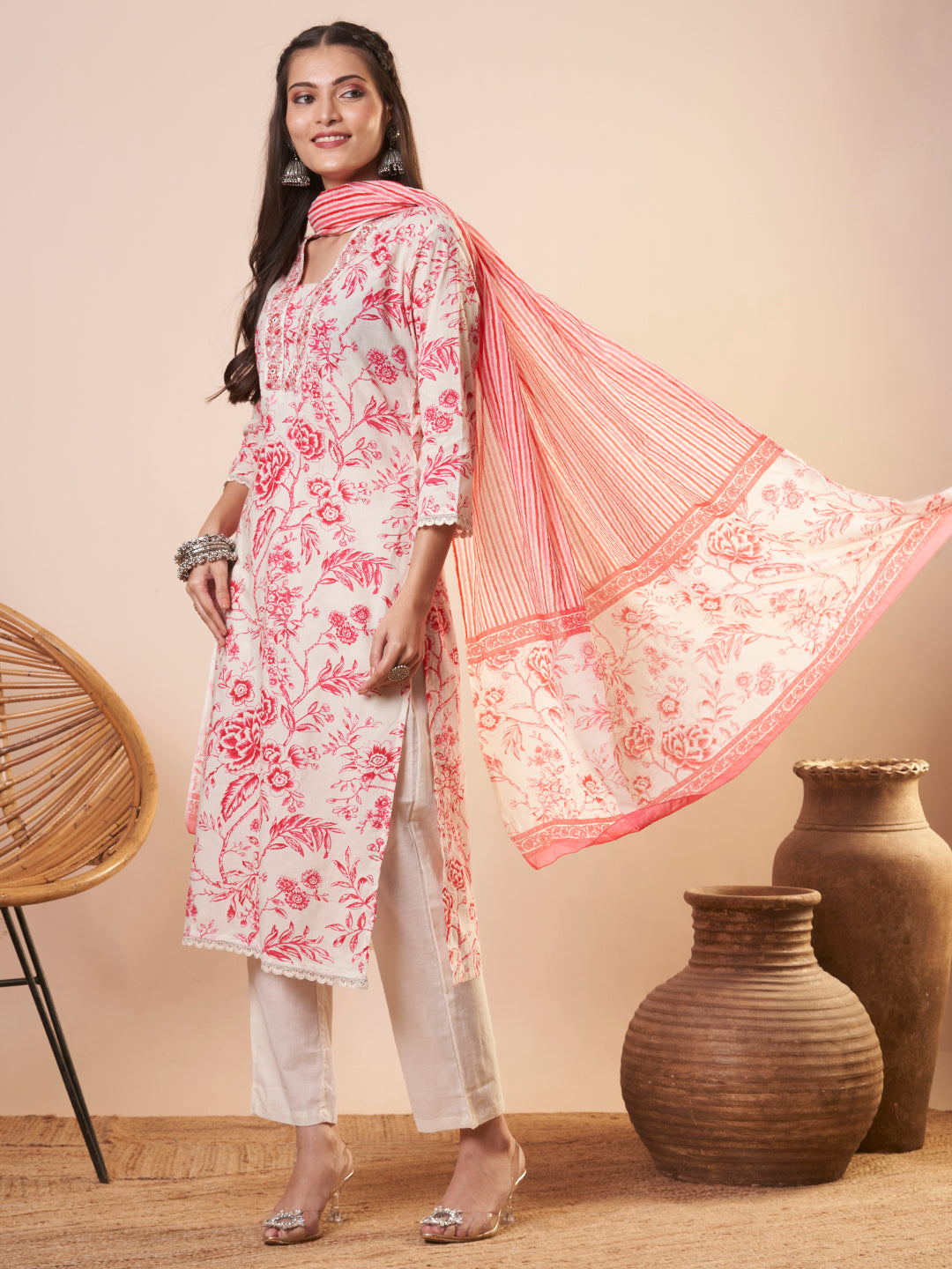 Ethnic Floral Printed & Embroidered Straight Kurta with Pant and Dupatta - Off White