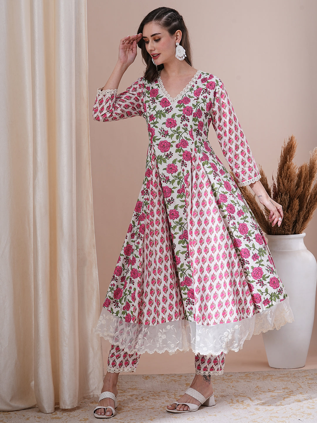 Ethnic Floral Printed Flared Anarkali Kurta with Pant - White