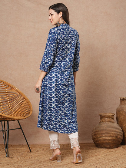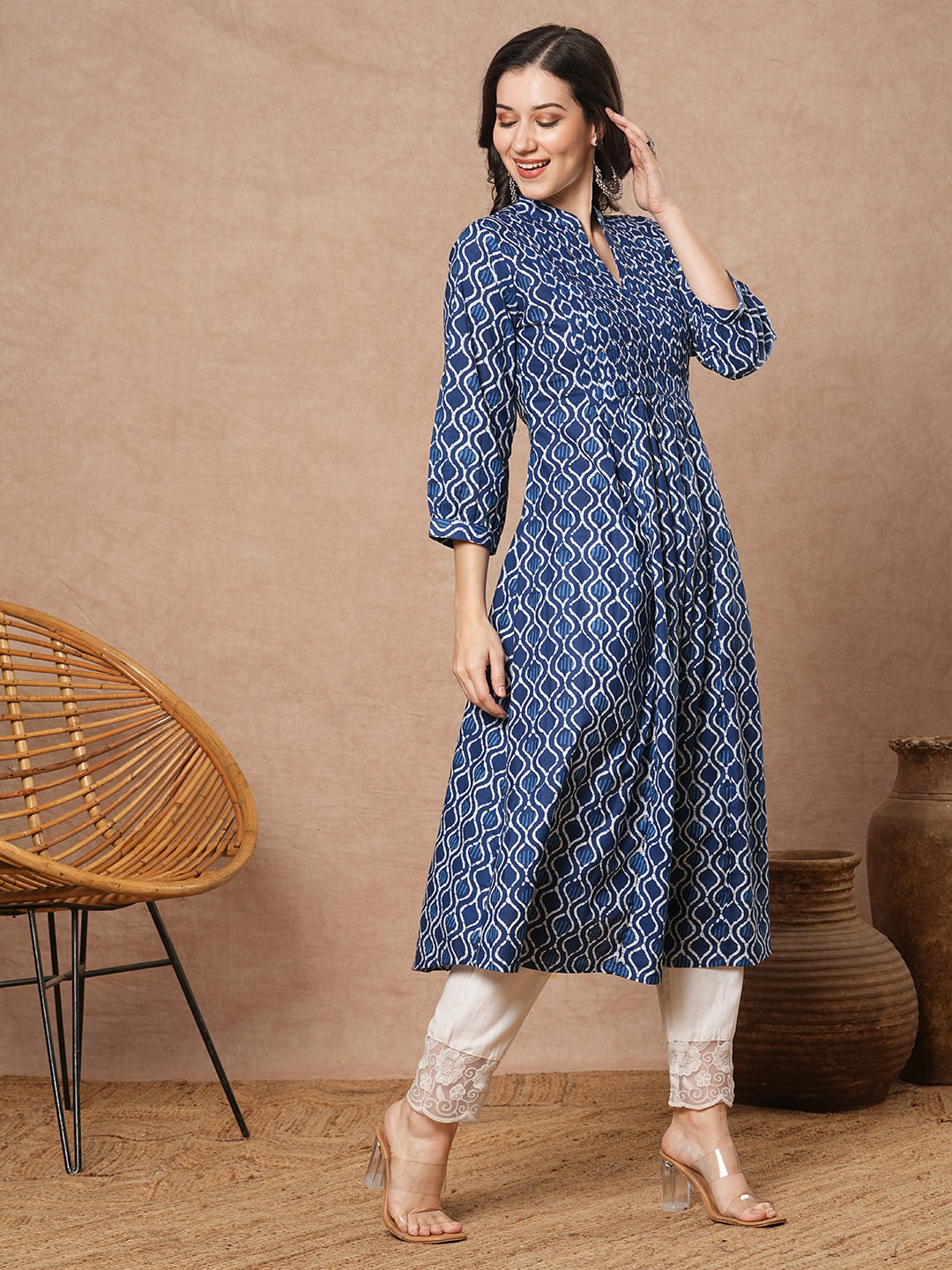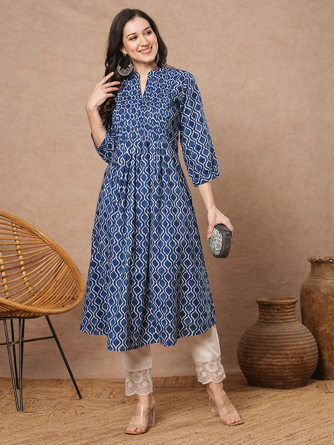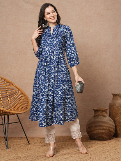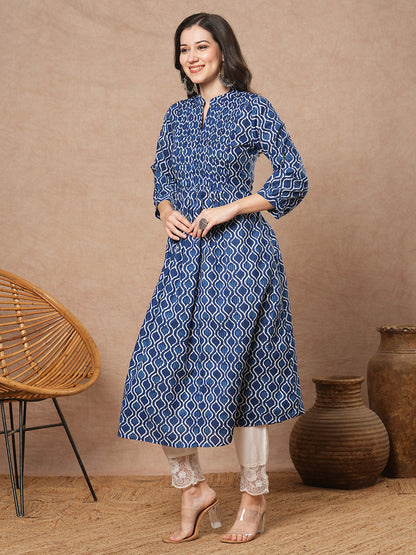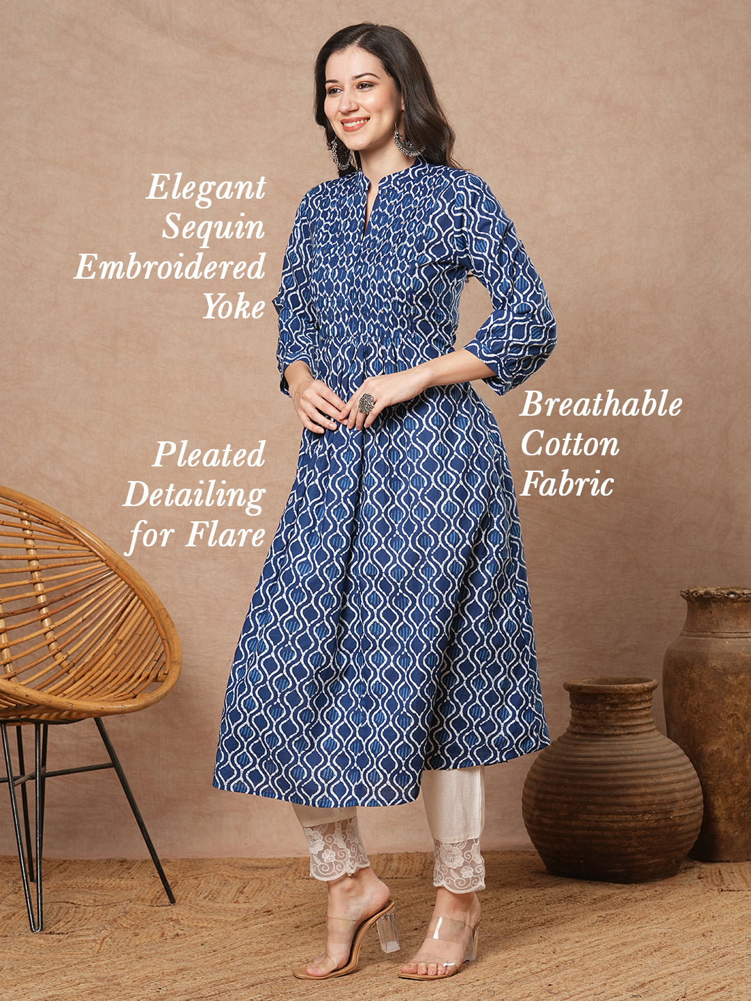 Ethnic Floral Printed & Sequin Embroidered A-Line Pleated Kurta - Blue