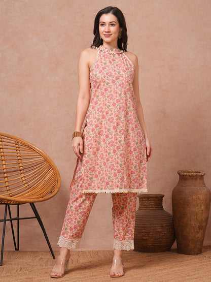Ethnic Floral Printed Straight Fit Co-ord Set - Peach