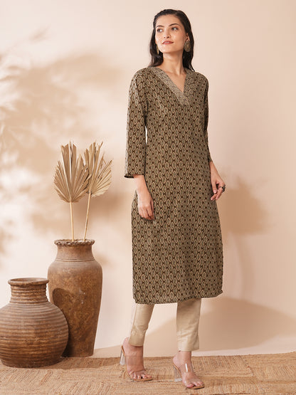 Floral Patchwork Embroidered A-Line Flared Kurta -...