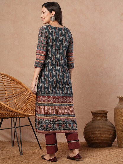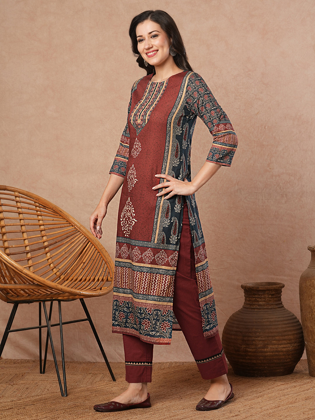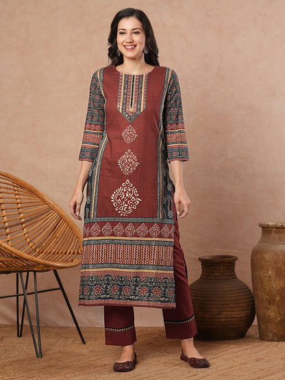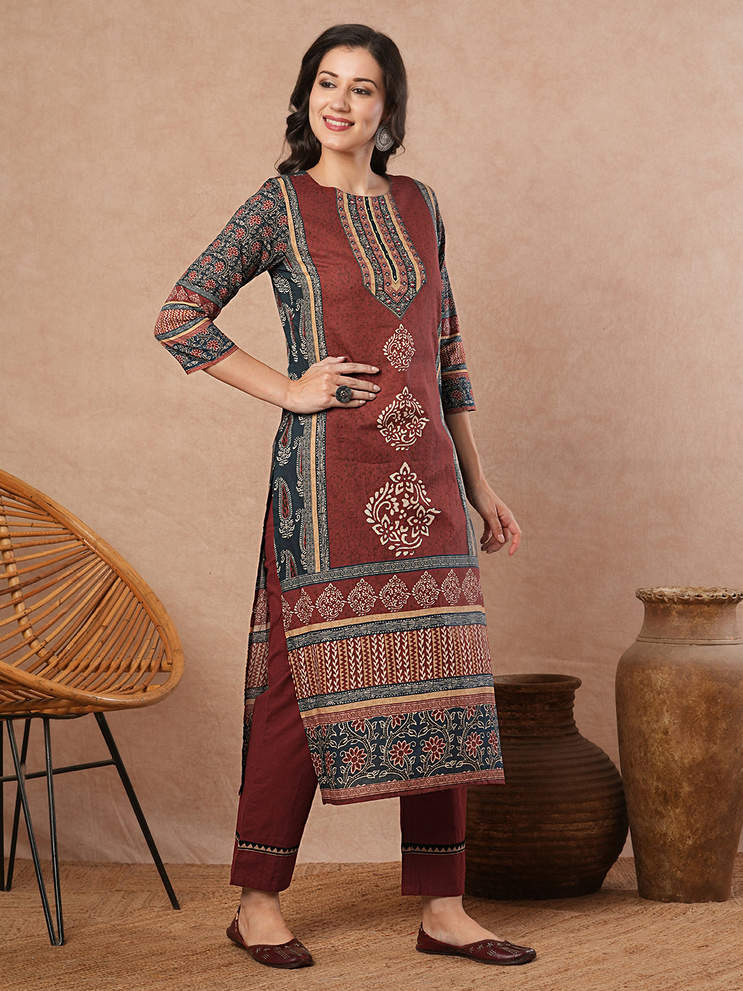 Elevate your everyday elegance with this Rust Ethnic Floral Printed & Embroidered Straight Fit Kurta. Crafted from soft, breathable cotton, it features a flattering round neckline and a graceful straight silhouette. The kurta is adorned with intricate ethnic floral prints and delicate embroidery, while shimmering sequin highlights on the yoke add just the right touch of festive sparkle. A perfect blend of tradition and comfort, ideal for casual outings or cultural celebrations.