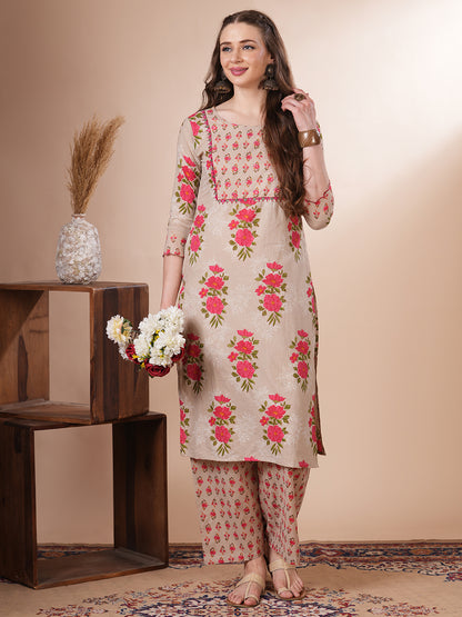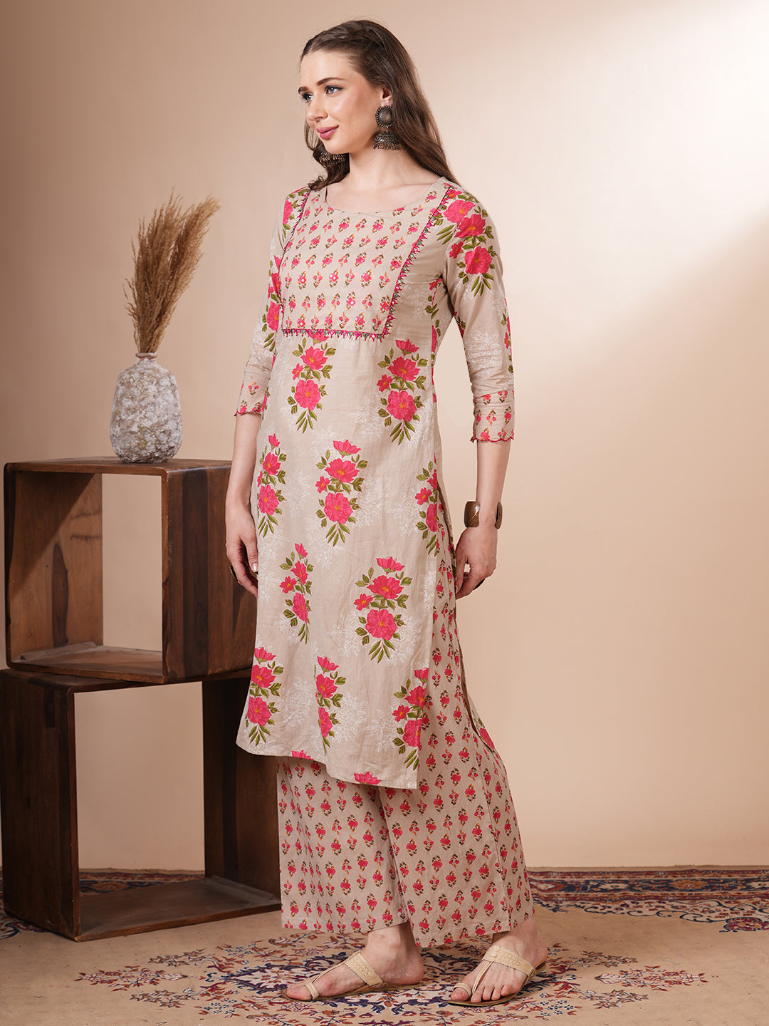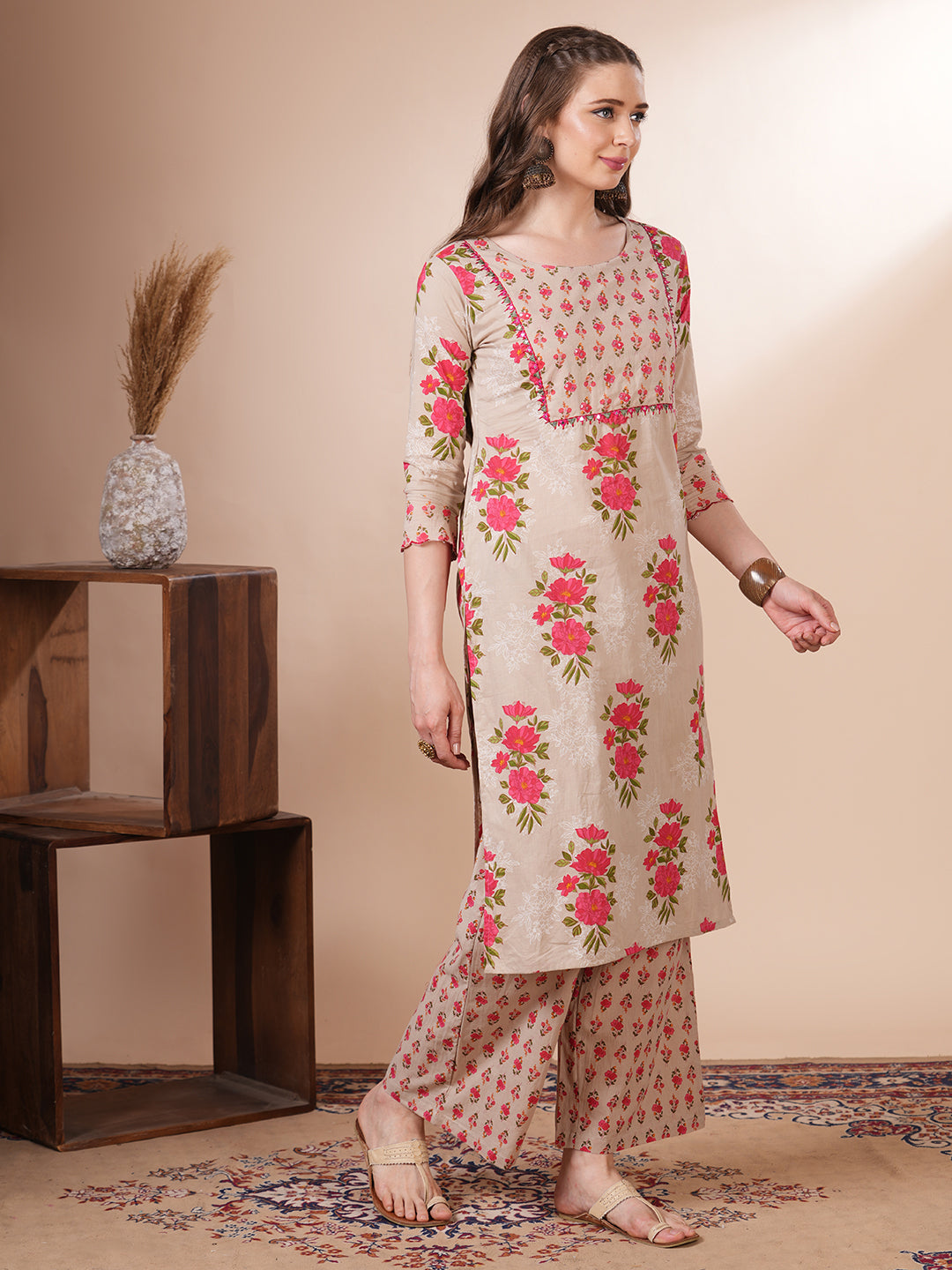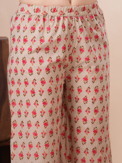 Step into effortless elegance with this Ethnic Floral Printed Straight Fit Kurta with Palazzo in a refreshing Mustard hue. Crafted from soft, breathable cotton, it features intricate floral prints that celebrate timeless tradition. The kurta is styled with a flattering straight fit and detailed with delicate front buttons, perfectly paired with matching printed palazzo for a graceful, coordinated look. Ideal for festive days or casual chic moments.