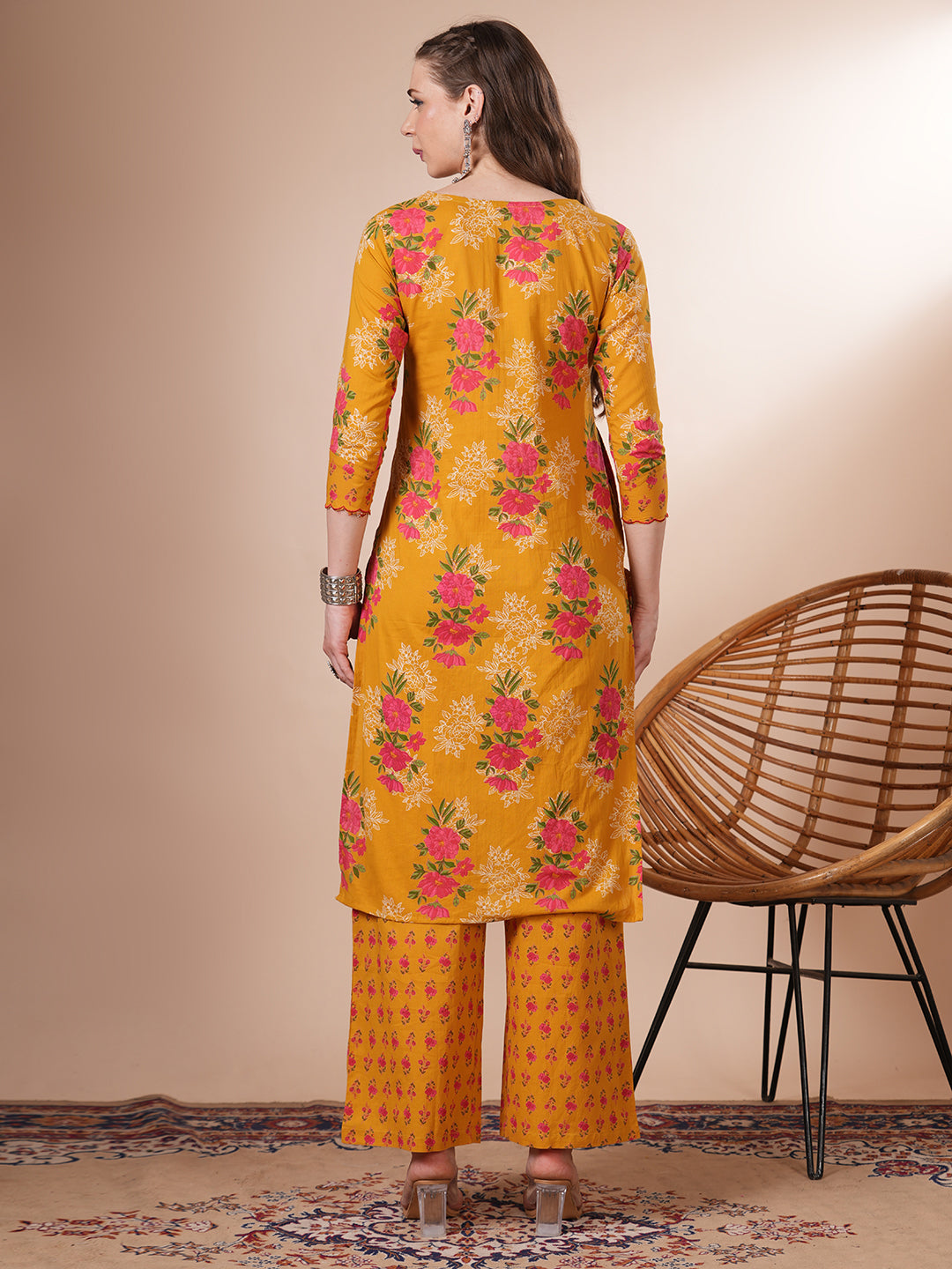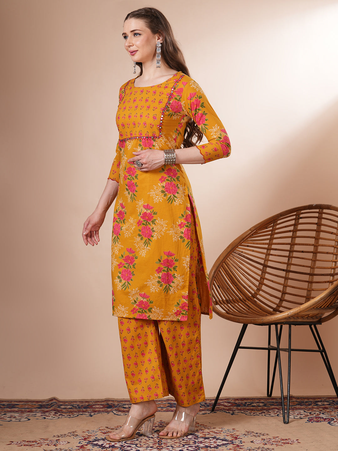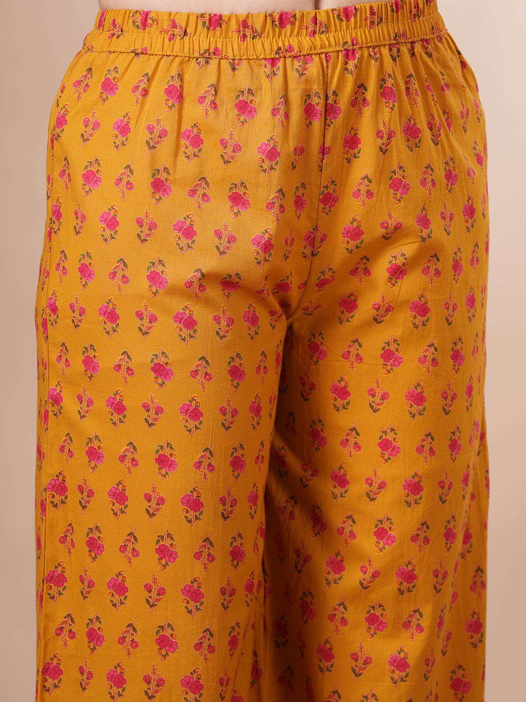 Ethnic Floral Printed Straight Fit Kurta with Palazzo - Mustard