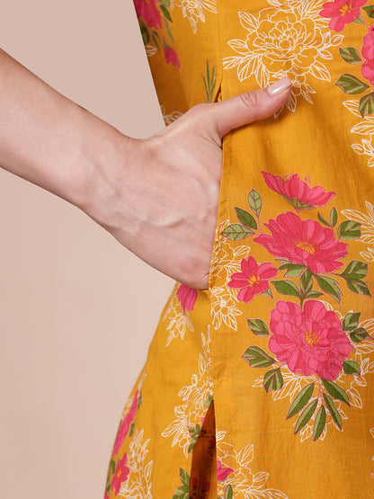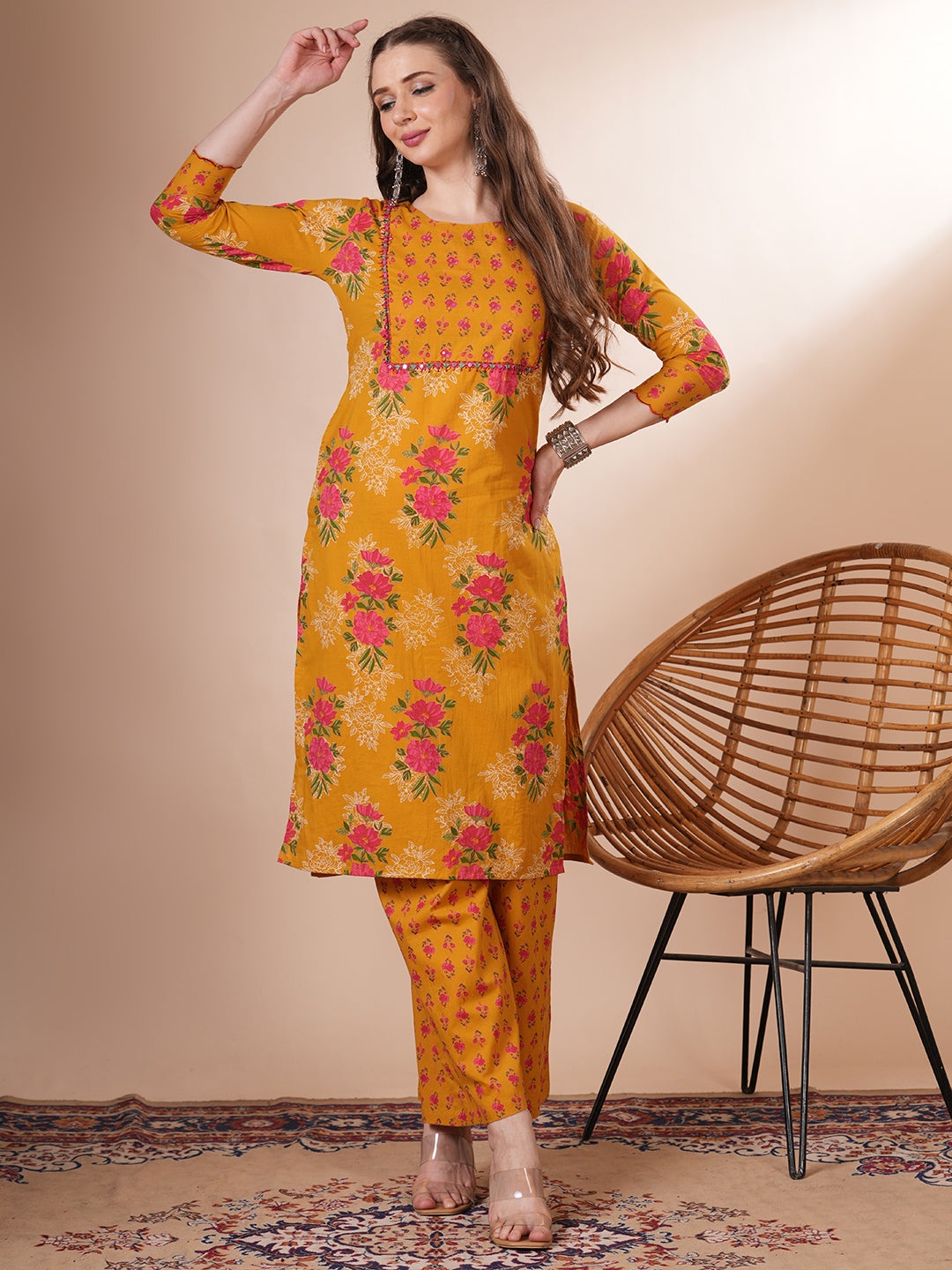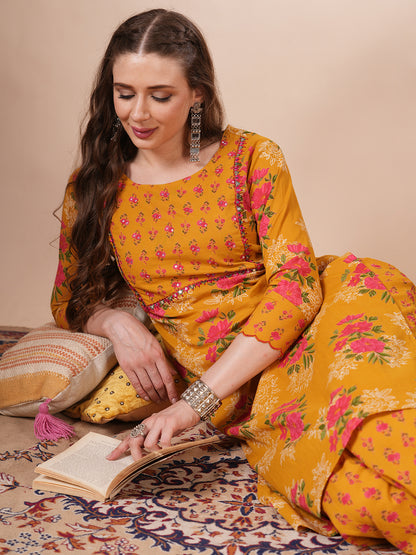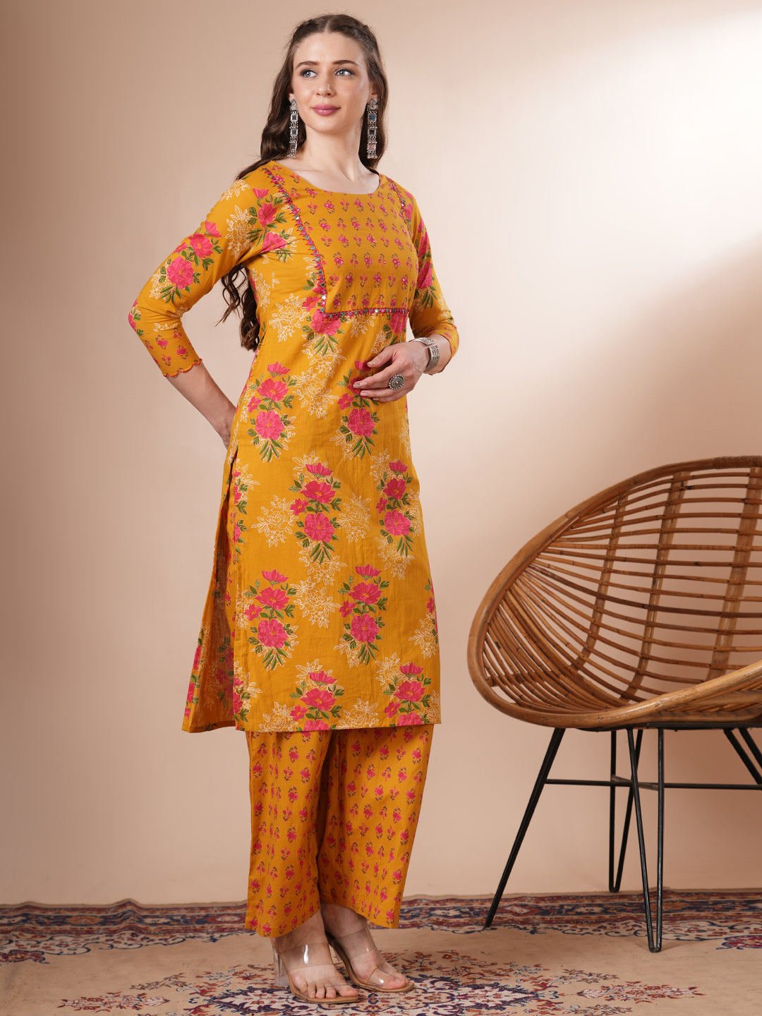 Ethnic Floral Printed Straight Fit Kurta with Palazzo - Mustard