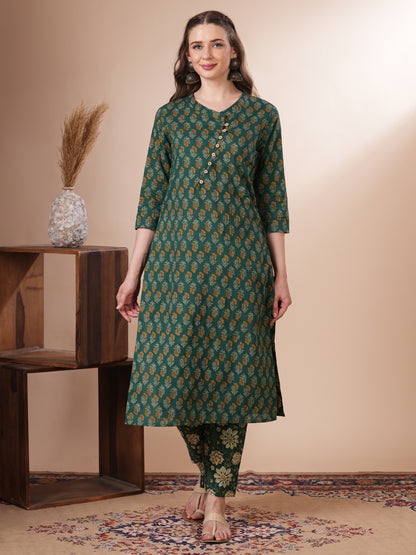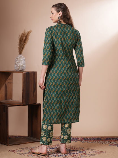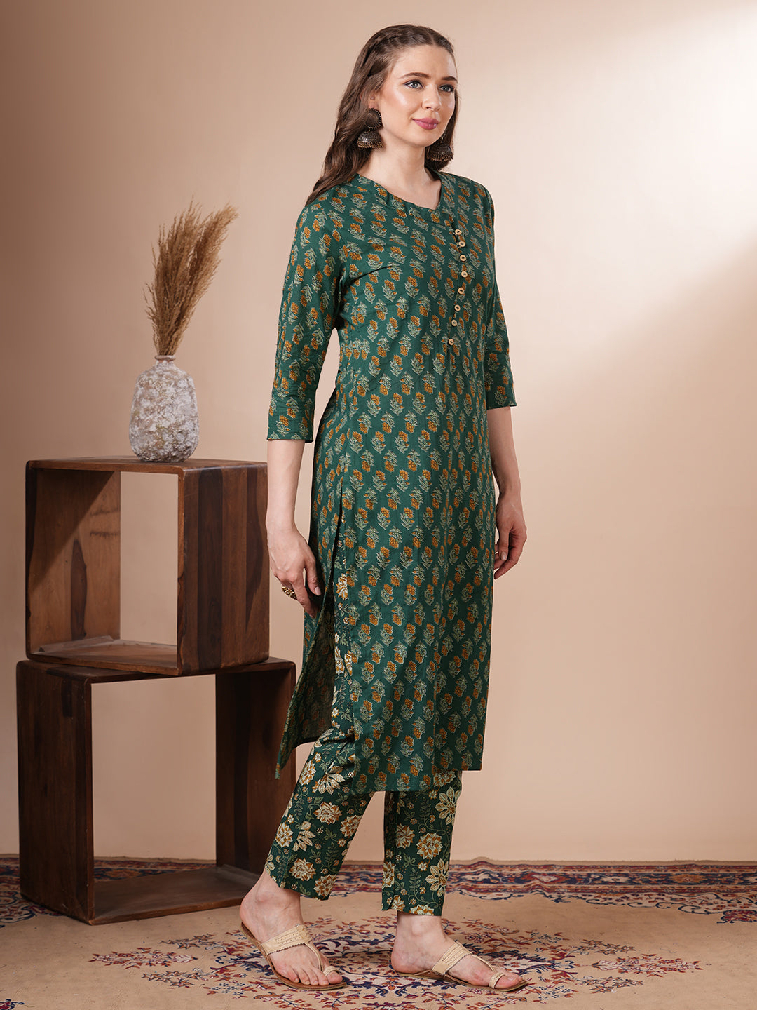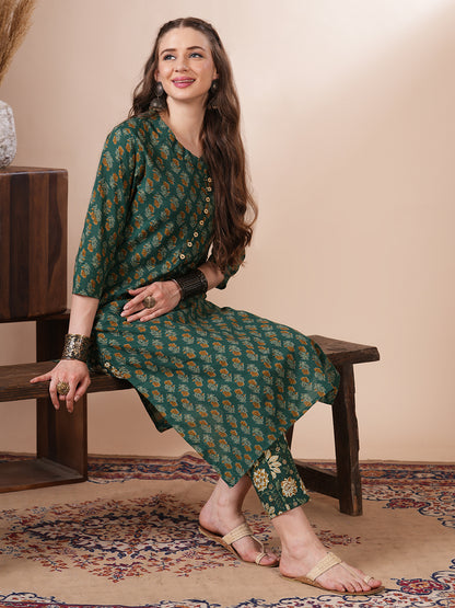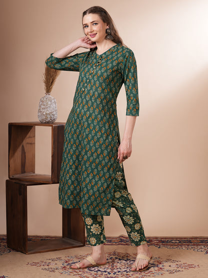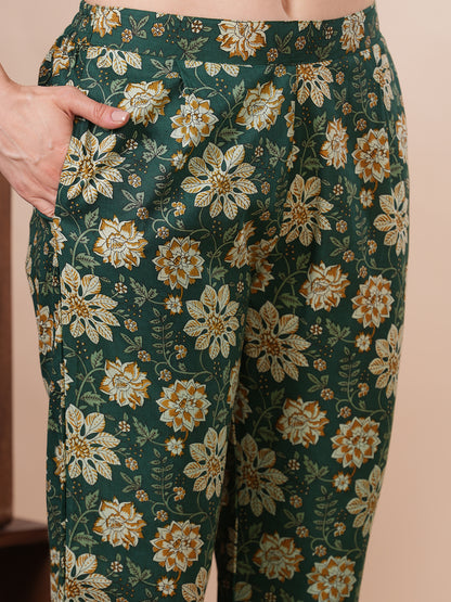 Ethnic Floral Printed Straight Fit Kurta with Pant - Green