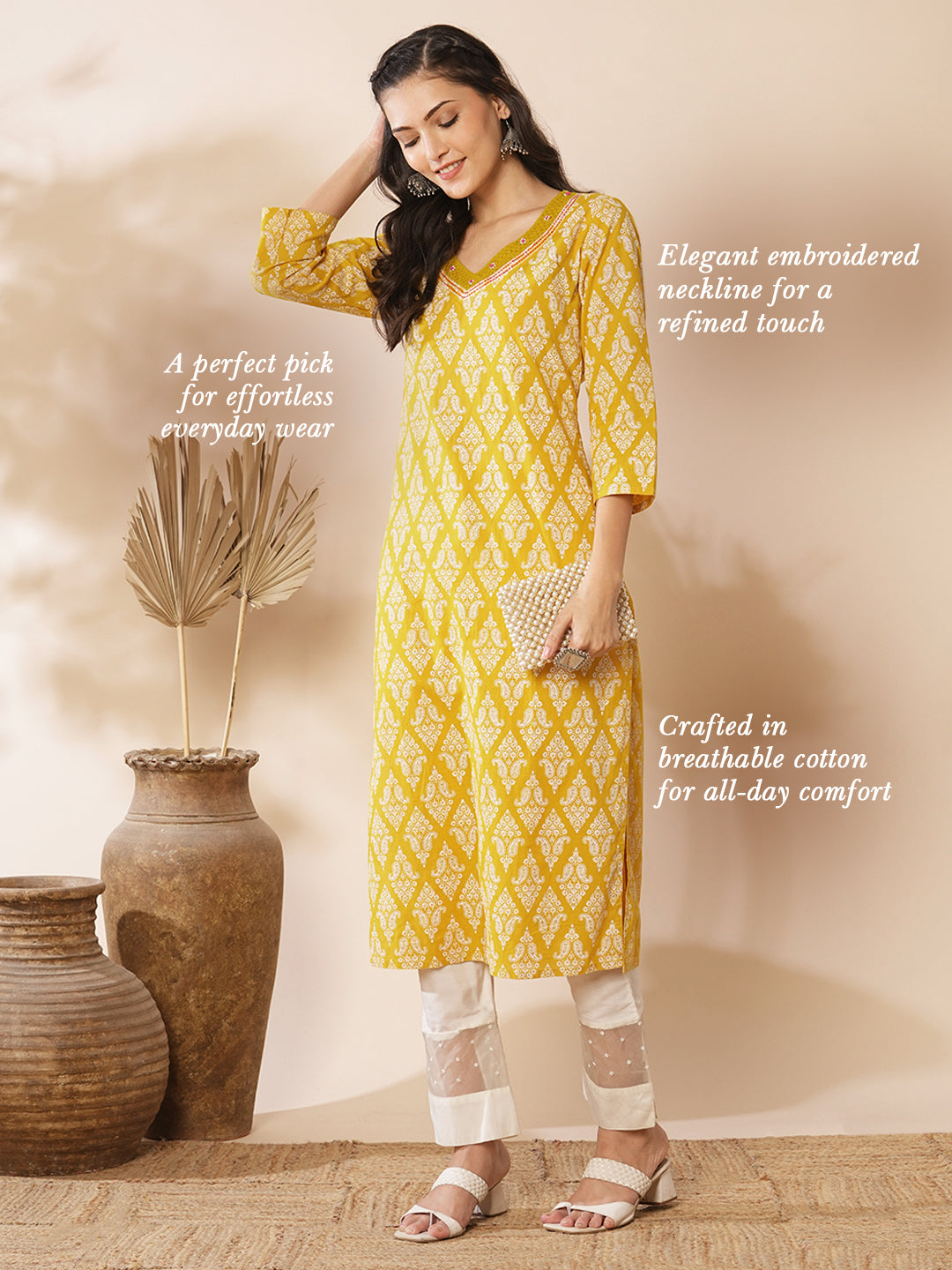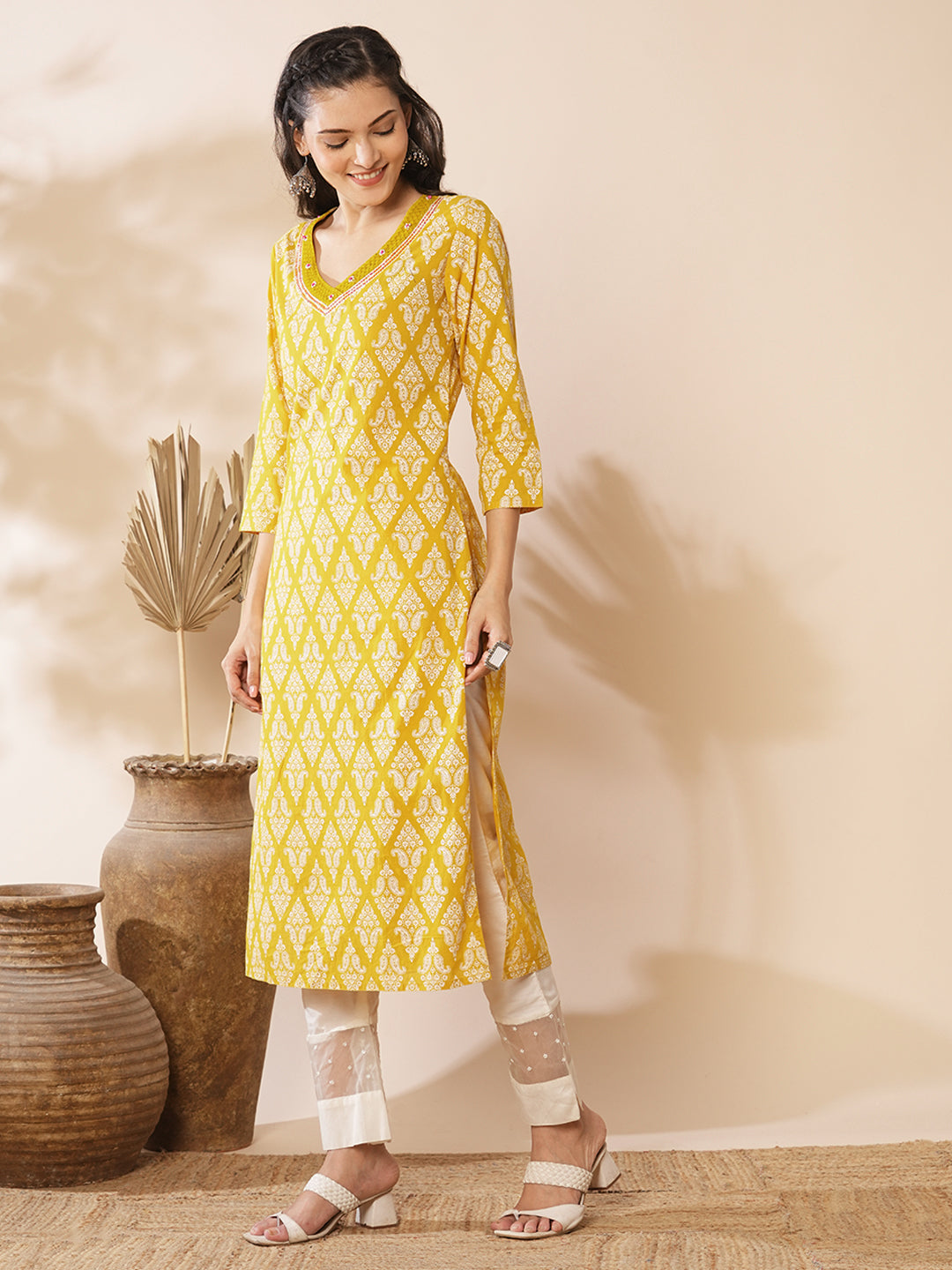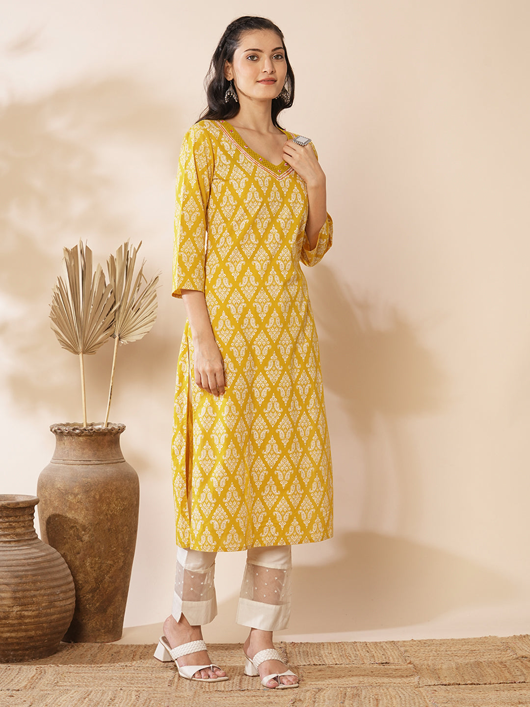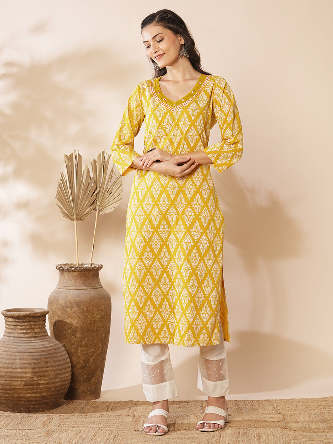 This straight fit kurta with ethnic floral prints all over, v-neckline is a perfect fit for everyday comfort wear.