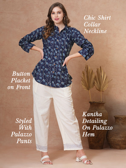 Ethnic Floral Printed Straight Fit Shirt with Palazzo - Blue