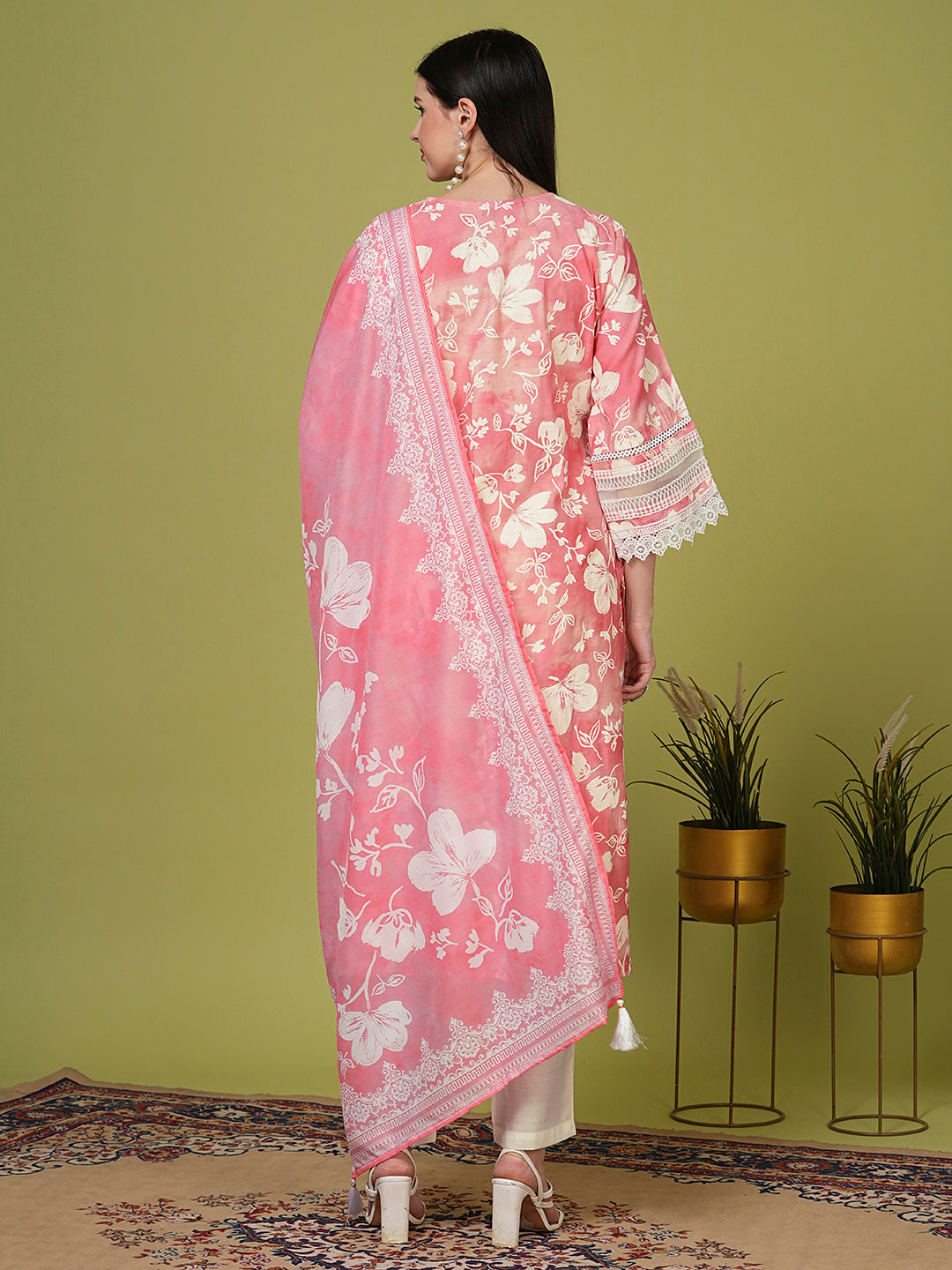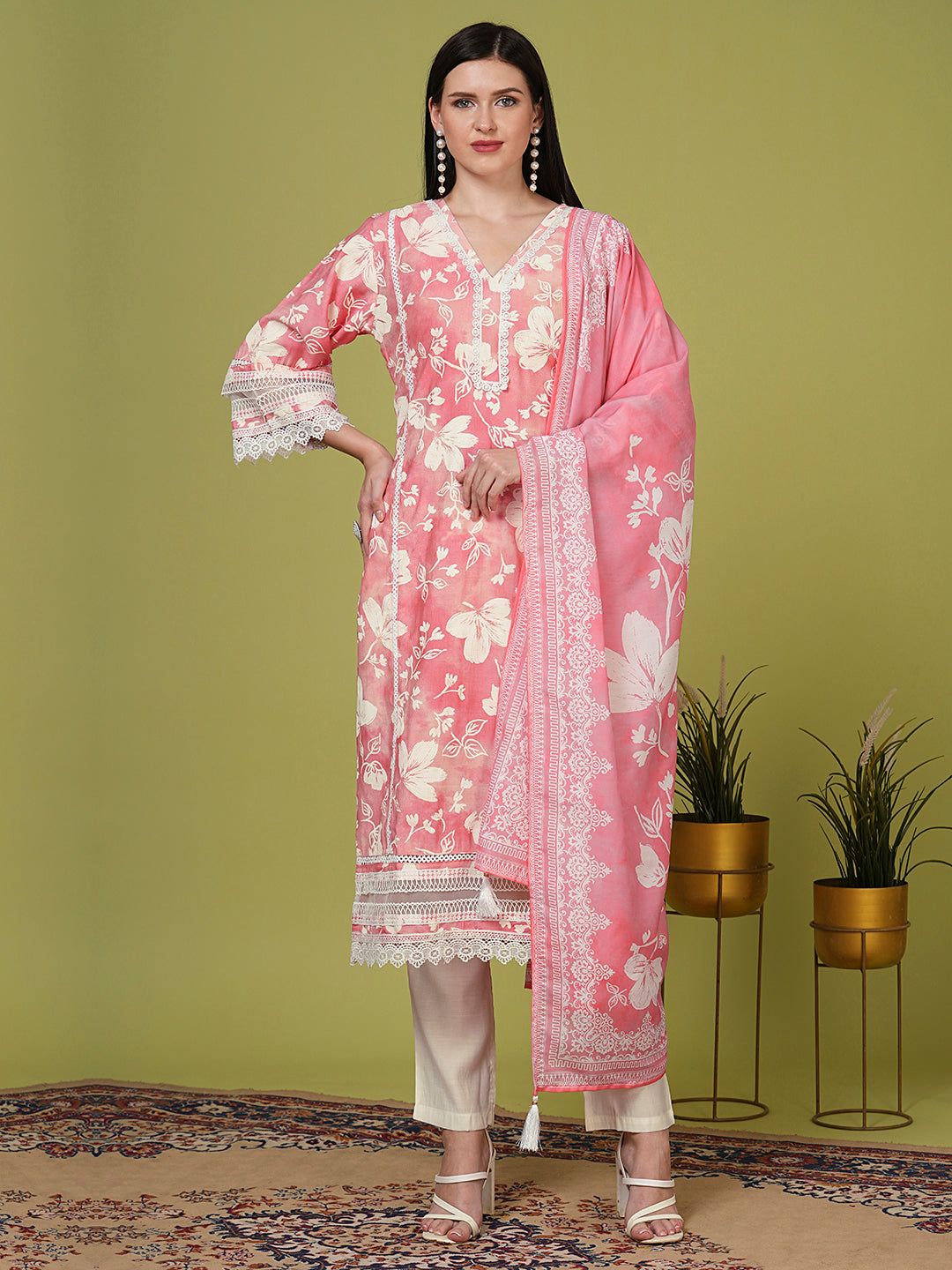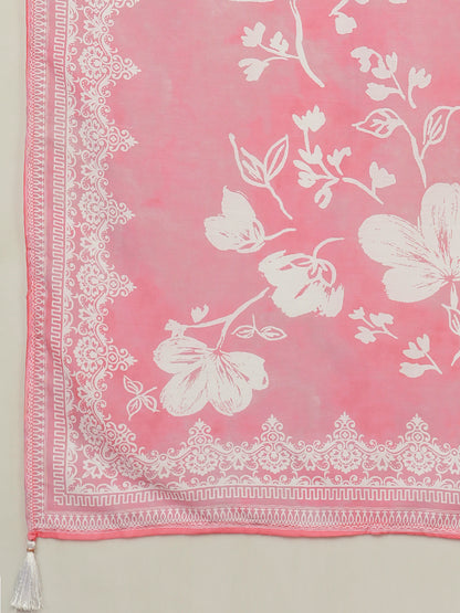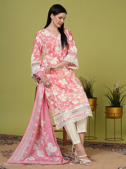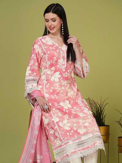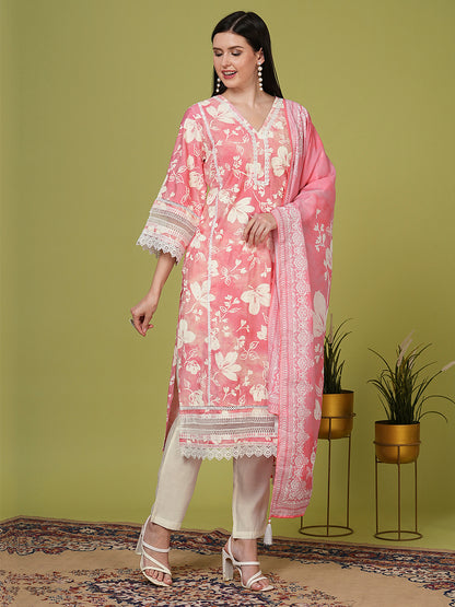 Ethnic Floral Printed Straight Kurta with Pant & Dupatta - Pink