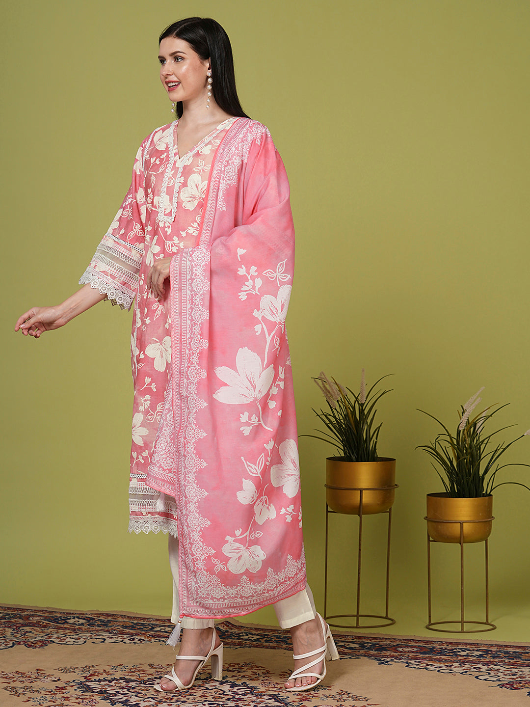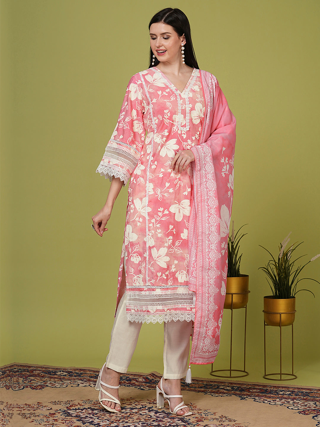 Embrace graceful tradition with this Ethnic Floral Printed Straight Kurta with Pant & Dupatta in soft Pink. Crafted from breathable fabric, the kurta features intricate ethnic floral prints all over, enhanced by delicate crochet lace detailing for a touch of elegance. The flattering V-neckline and flared sleeves add a feminine silhouette and stylish flair. Paired with matching pants, this set offers effortless comfort and sophistication. A beautifully printed dupatta completes the ensemble, perfect for festive occasions or casual celebrations. Celebrate timeless charm with every wear.