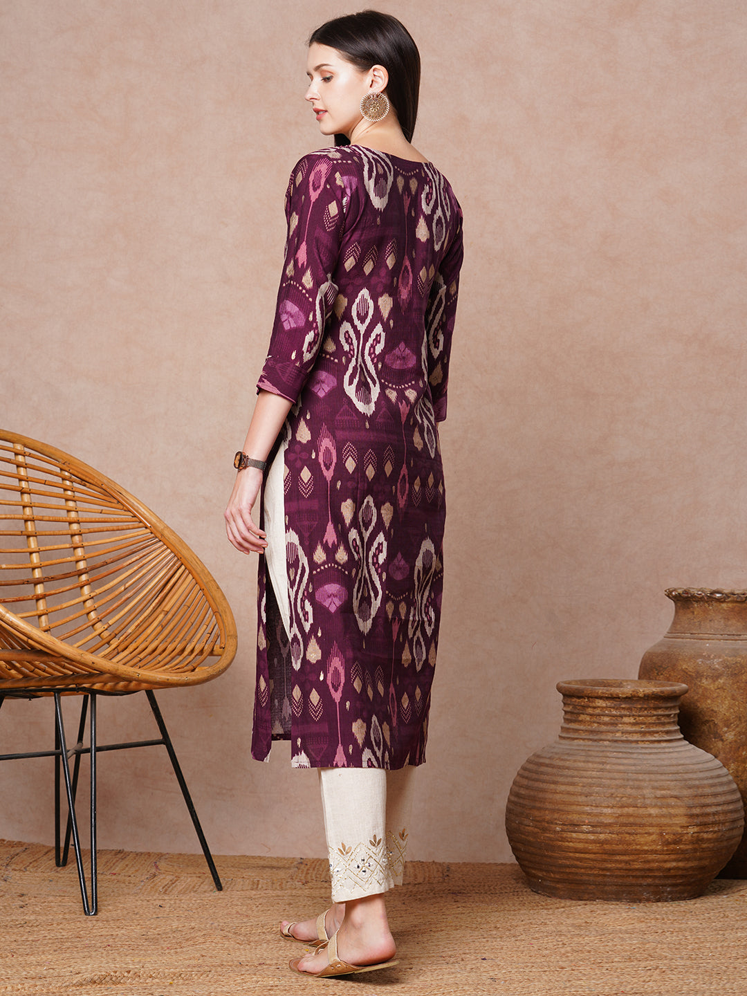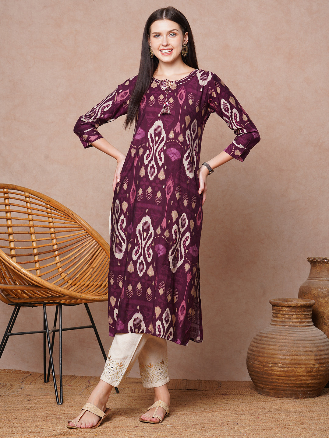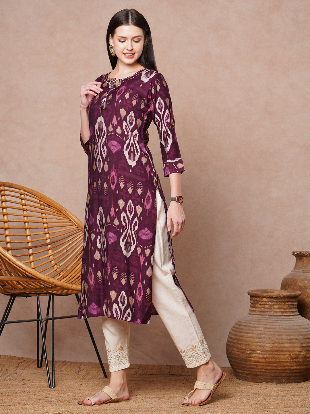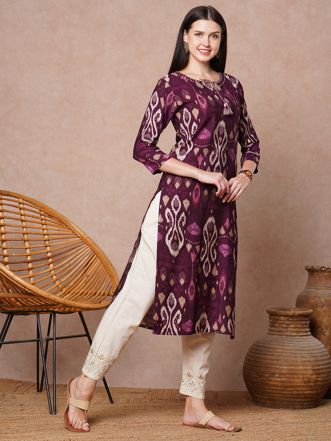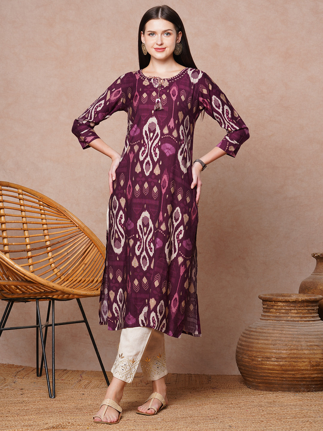 Ethnic Ikat Printed & Embroidered Straight Fit Kurta - Burgundy