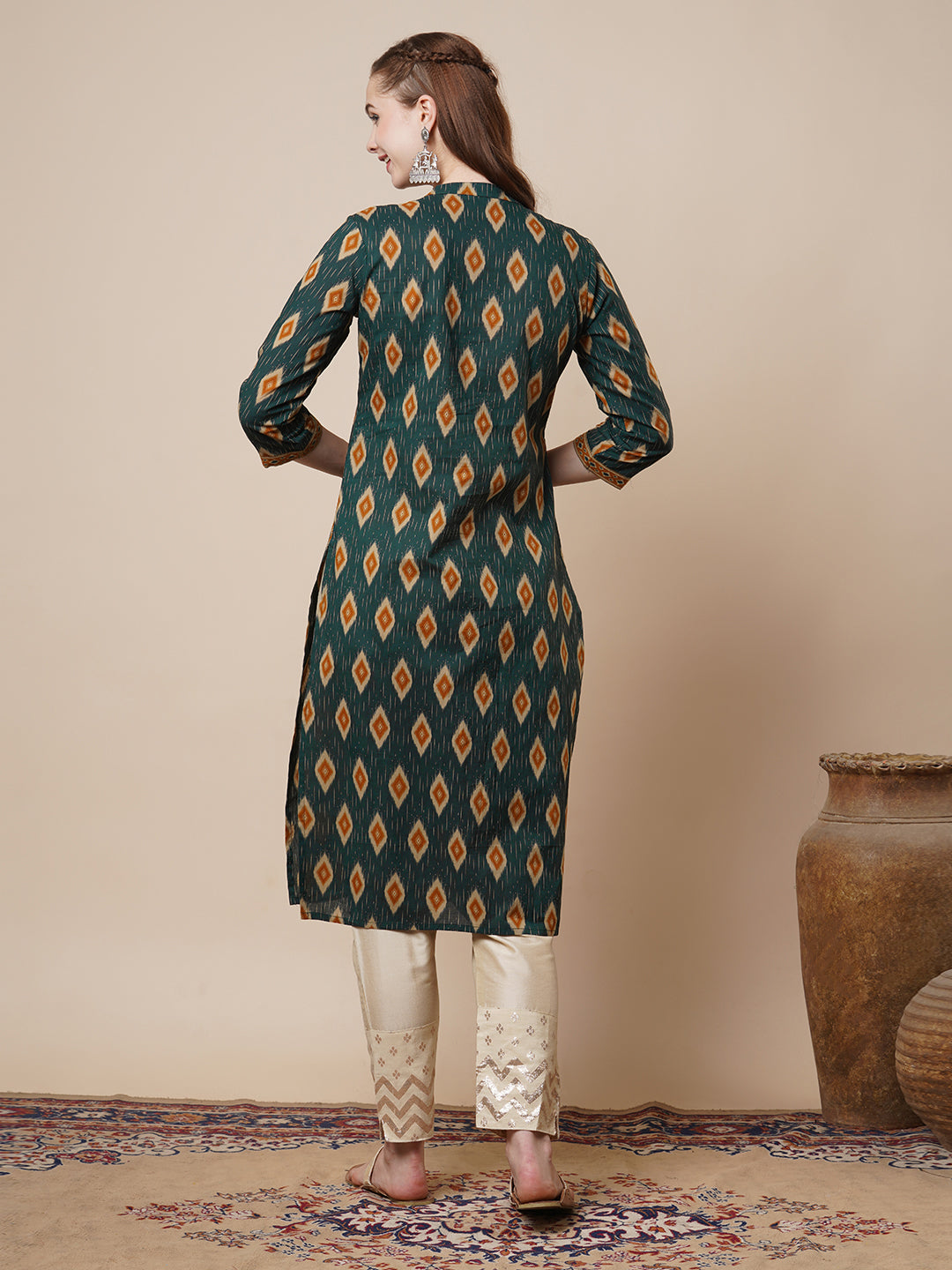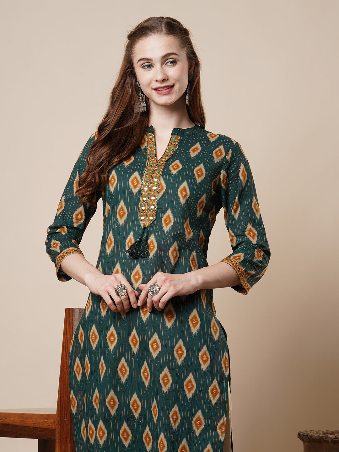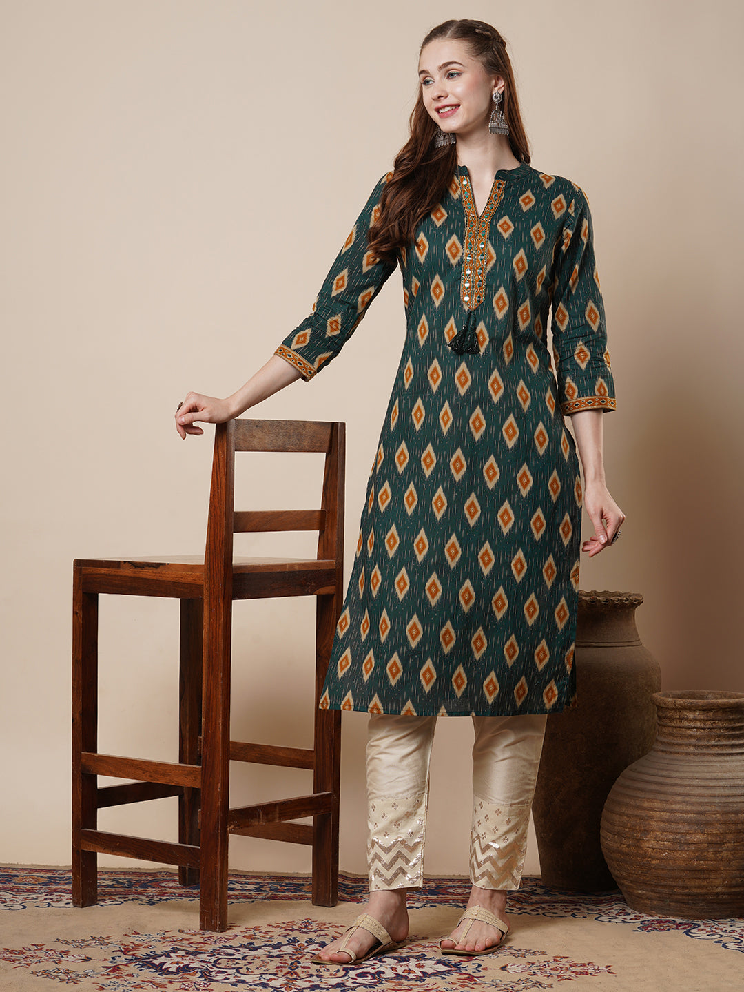 Elevate your ethnic wardrobe with this elegant green straight-fit kurta, crafted from soft, breathable cotton. Featuring a sophisticated mandarin collar and adorned with intricate ikat-inspired prints, this piece is beautifully enhanced with resham, zari, and mirror embroidery along the placket for a touch of timeless charm. Perfect for festive gatherings or casual elegance.