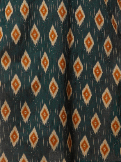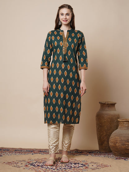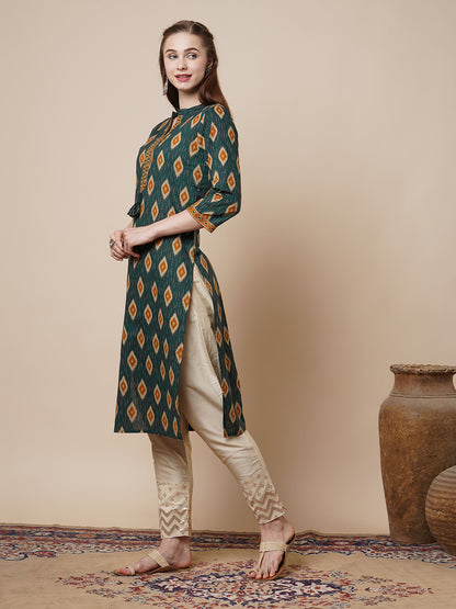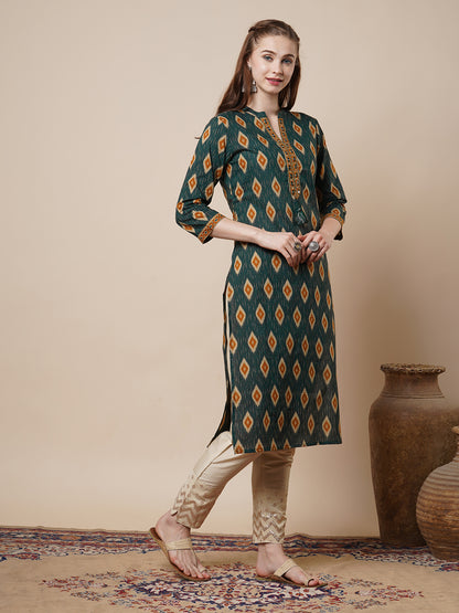 Ethnic Ikat Printed & Embroidered Straight Fit Kurta - Green